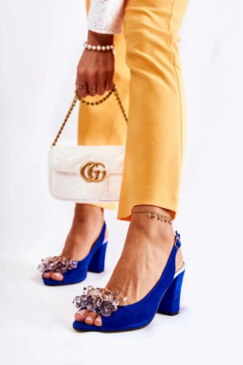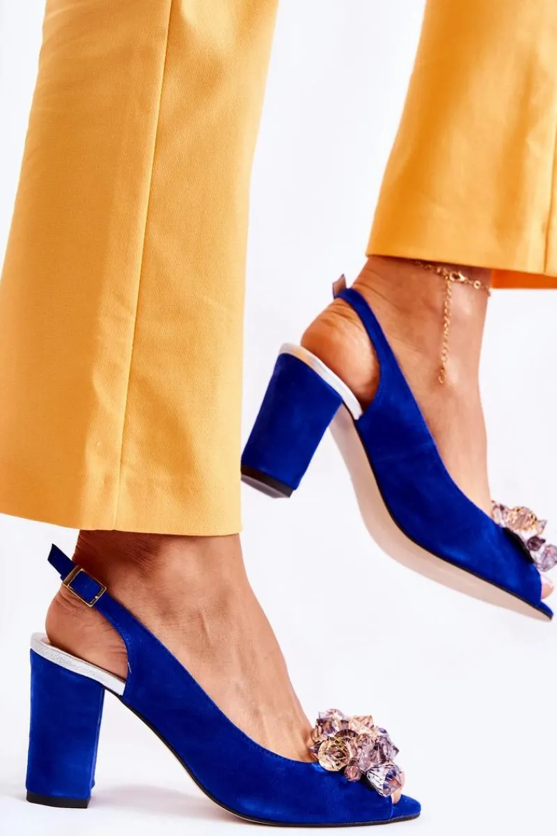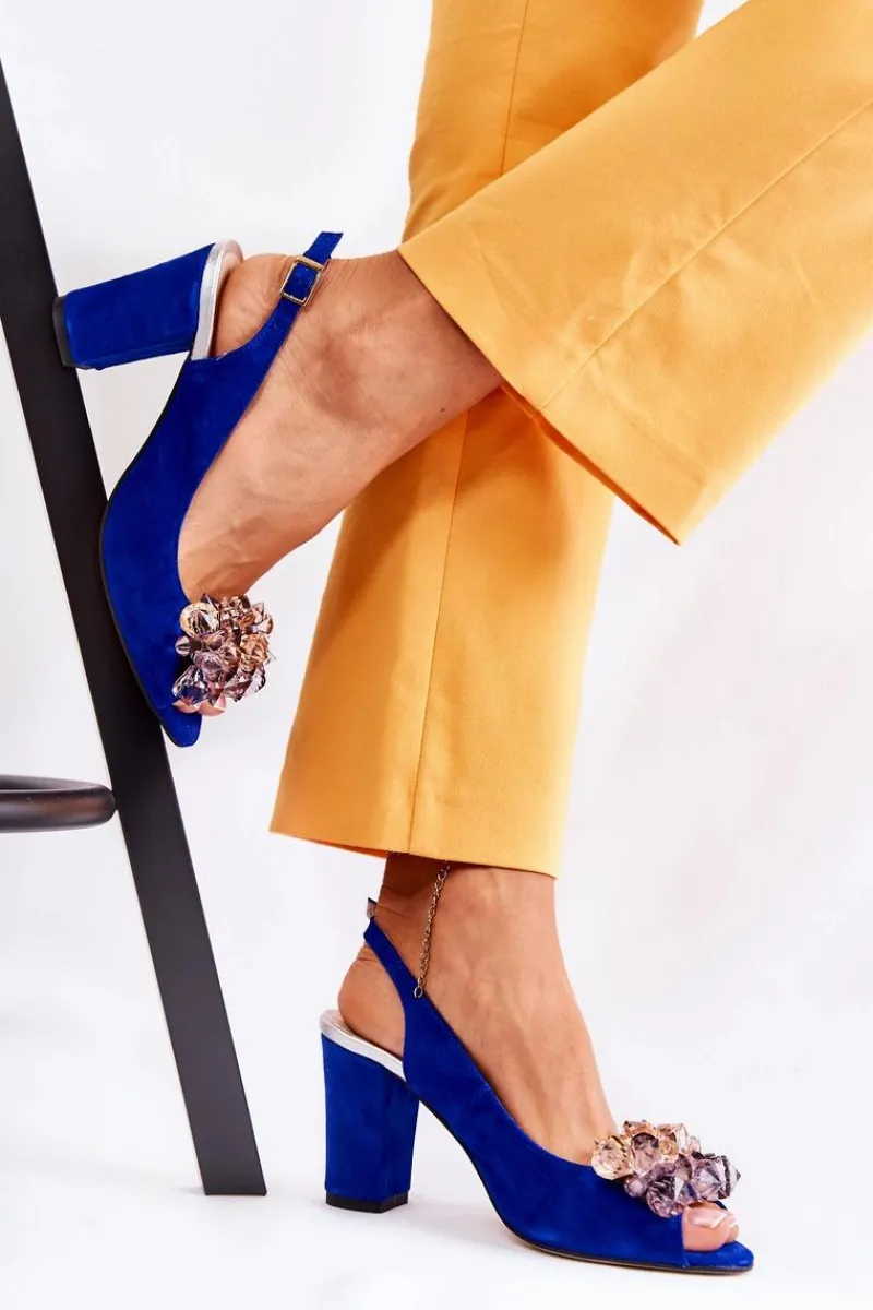 Niezwykłe czółenka w formie sandałek zostały osadzone na obcasie w postaci słupka. Posiadają z przodu ozdoby imitujące kryształy. Miękka wkładka wykonana z połączenia skóry naturalnej oraz naturalnego zamszu zapewni komfort podczas użytkowania. Nosek odkryty, w kształcie migdała. Sandałki posiadają regulowany pasek zapinany wokół kostki na sprzączkę. Koniecznie powinnaś je mieć ten model w swojej garderobie! Przy wyborze rozmiaru prosimy sugerować się tabelą rozmiarów.