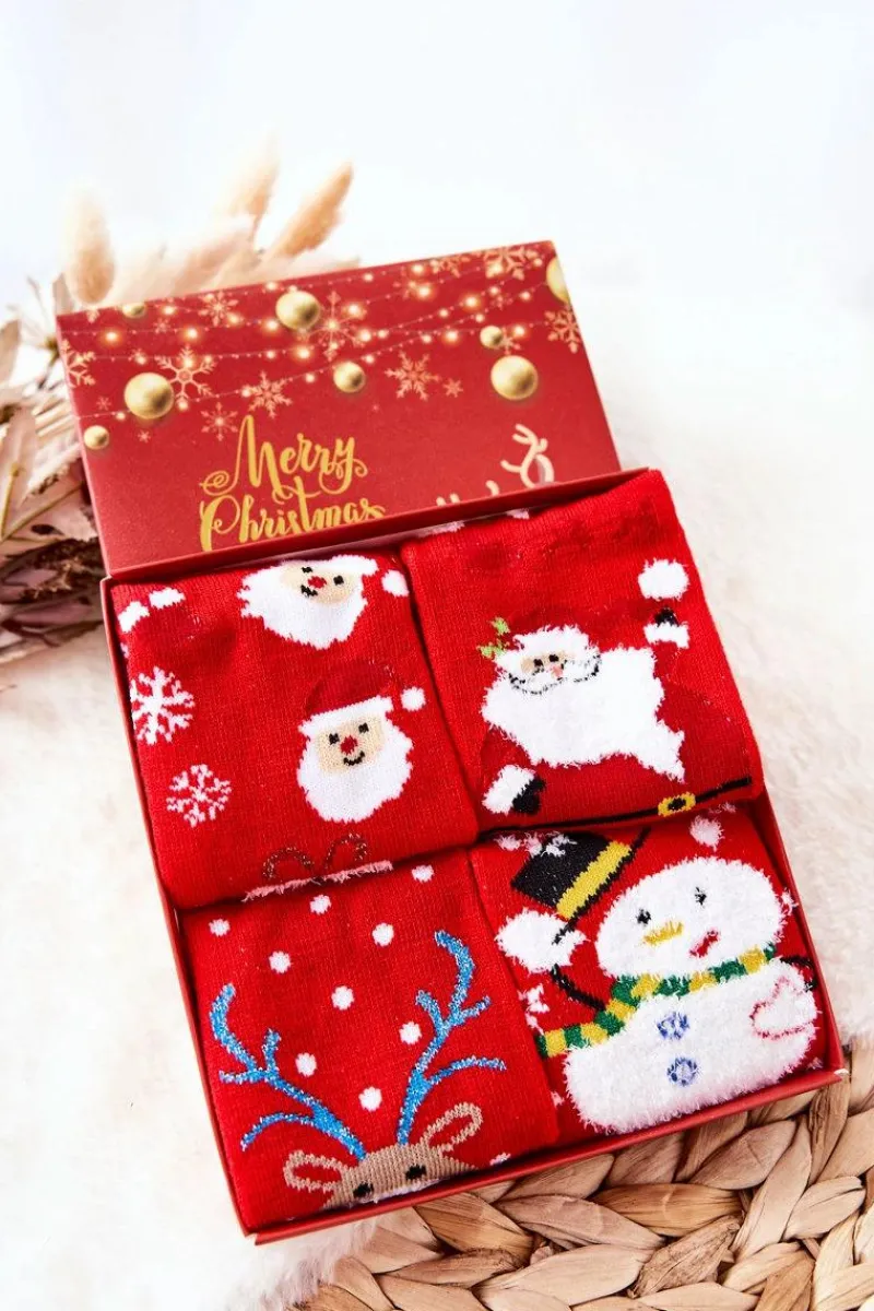 Świetny zestaw 4 par dziecięcych skarpet w świąteczne wzory. Zapakowane w piękne pudełko z świątecznym obrazkiem, przewiązane ozdobną wstążką. Idealny prezent na święta dla każdego dziecka! Kolorowe mikołaje, bałwanki, śnieżynki i inne świąteczne wzory na pewno przypadną do gustu nie tylko dzieciom. W naszej ofercie znajdują się także skarpetki męskie oraz damskie! Koniecznie sprawdź! Rozmiarówka europejska!