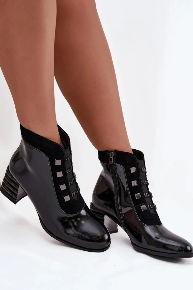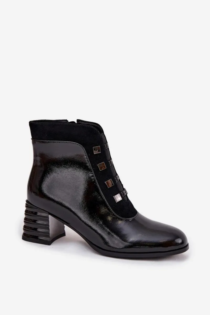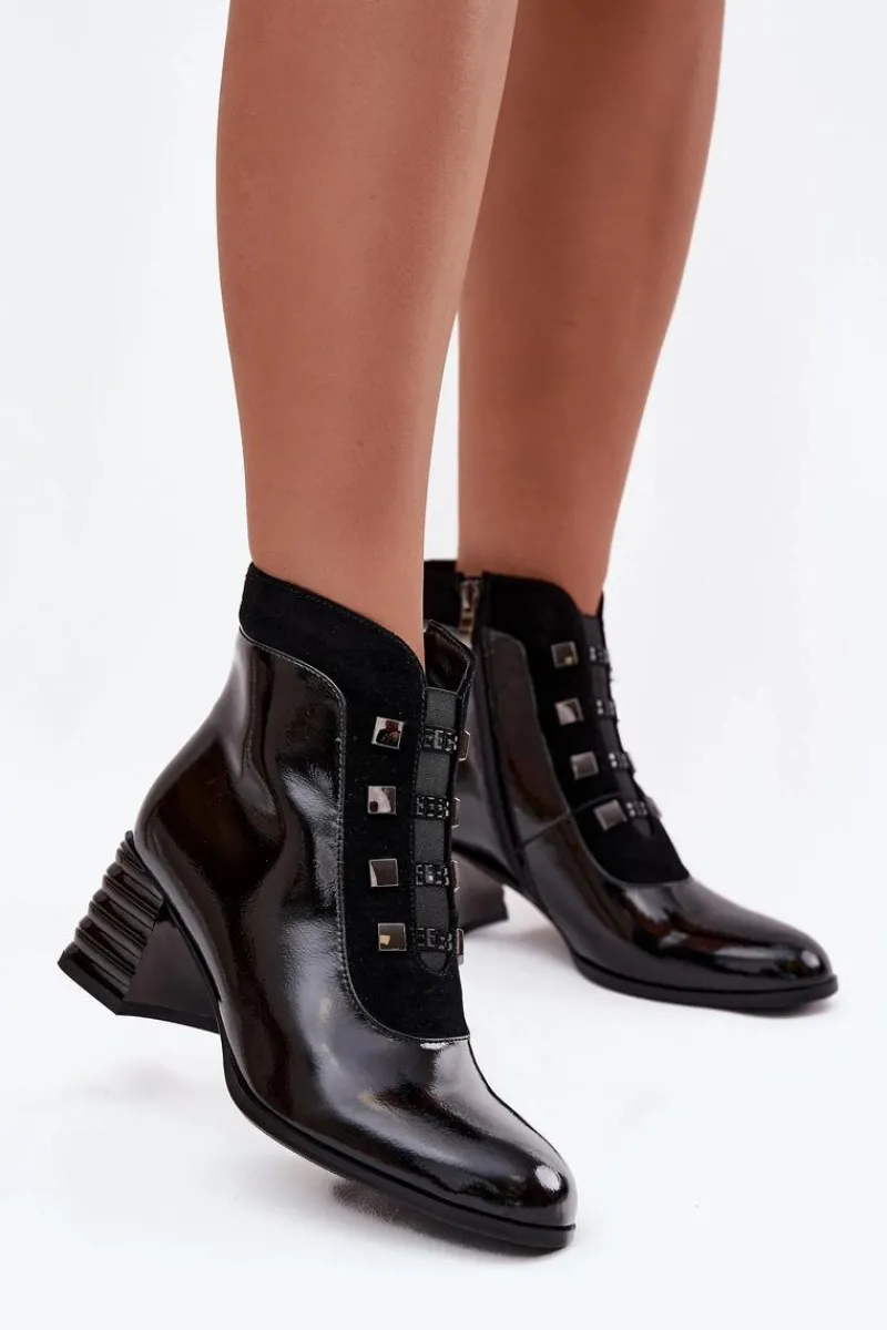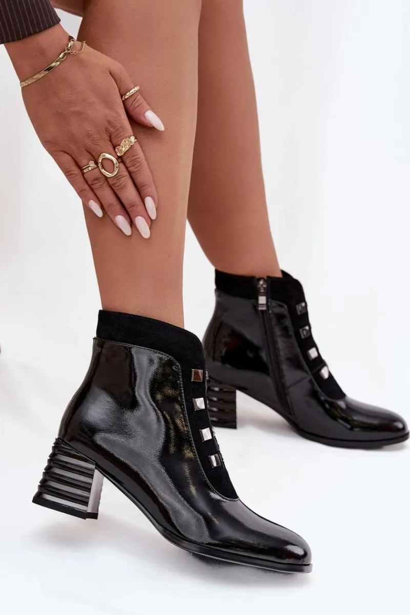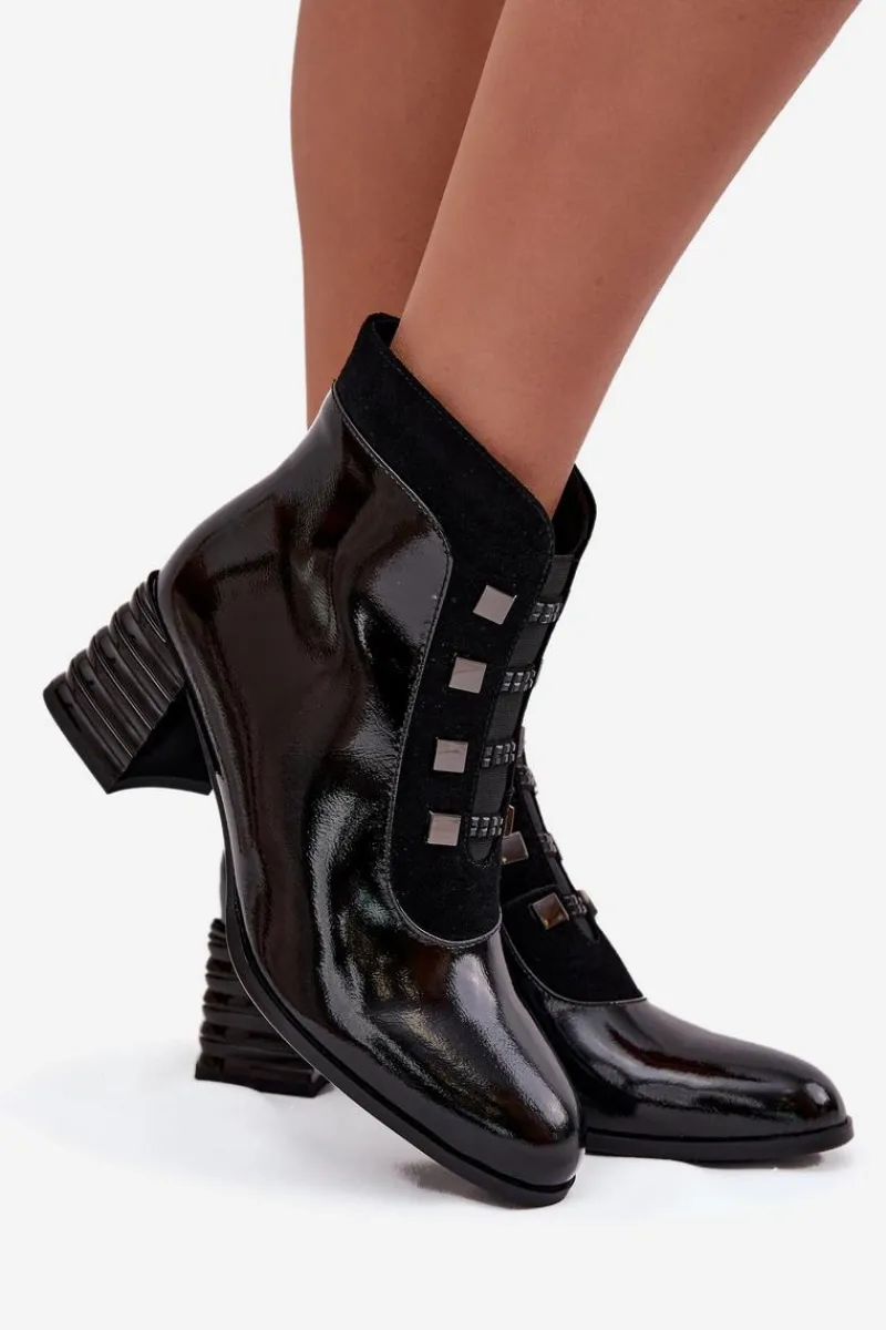 Botki damskie wykonane z naturalnej, lakierowanej skóry to elegancka propozycja dla kobiet ceniących styl i wygodę. Lśniąca cholewka w połączeniu z ozdobnymi detalami z przodu nadaje wyjątkowego charakteru i sprawia, że doskonale wyróżniają się w stylizacjach. Model osadzony został na stabilnym obcasie typu słupek, który dodaje kilku centymetrów wzrostu, jednocześnie zapewniając wygodę noszenia. Zaokrąglone noski podkreślają klasyczny wygląd, a praktyczne zapięcie na zamek ułatwia zakładanie i zdejmowanie. Wnętrze delikatnie ocieplone miękkim kocem obuwniczym gwarantuje komfort w chłodniejsze dni. To botki, które świetnie sprawdzą się w sezonie jesienno-zimowym. Przy wyborze rozmiaru prosimy sugerować się tabelą rozmiarów.
