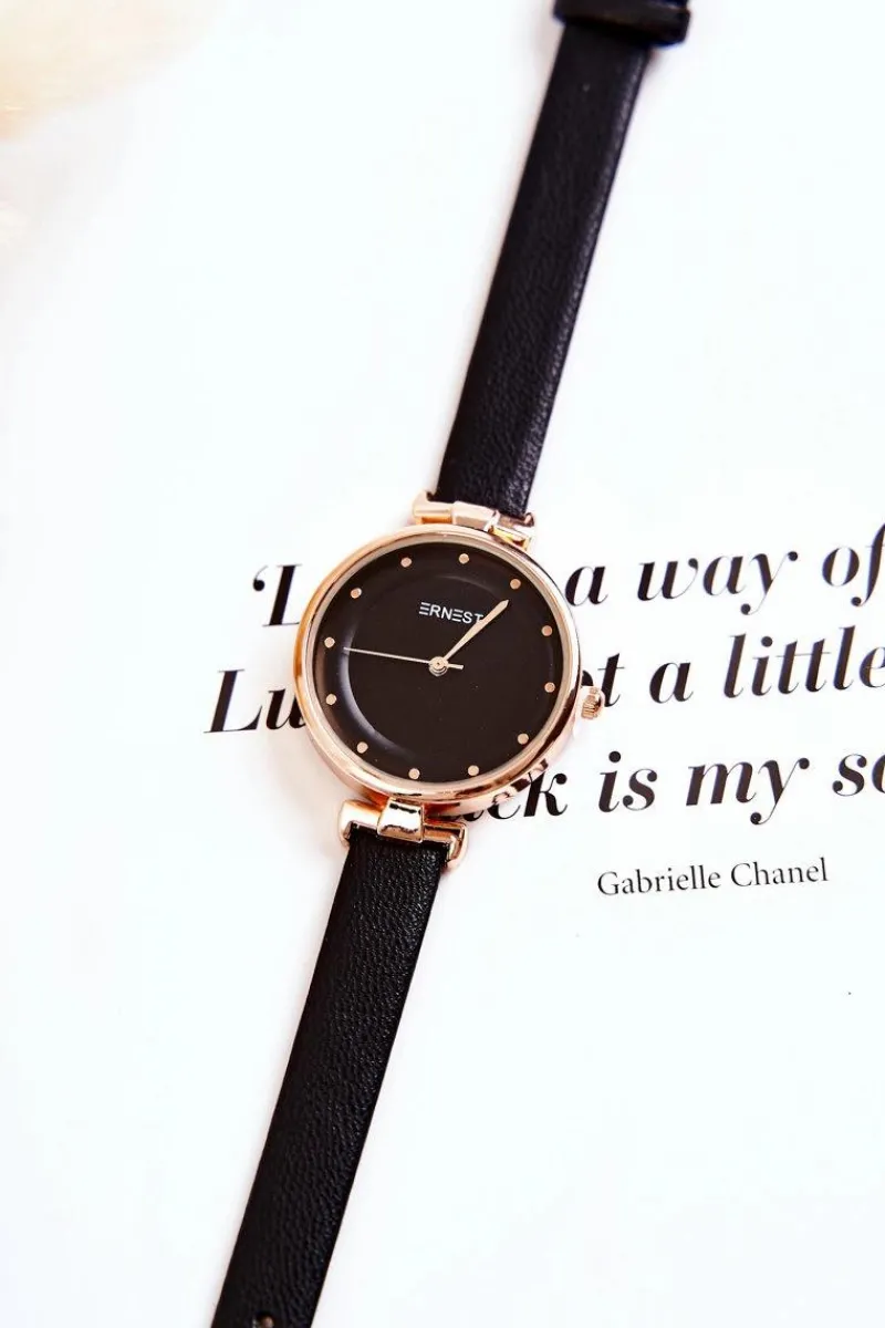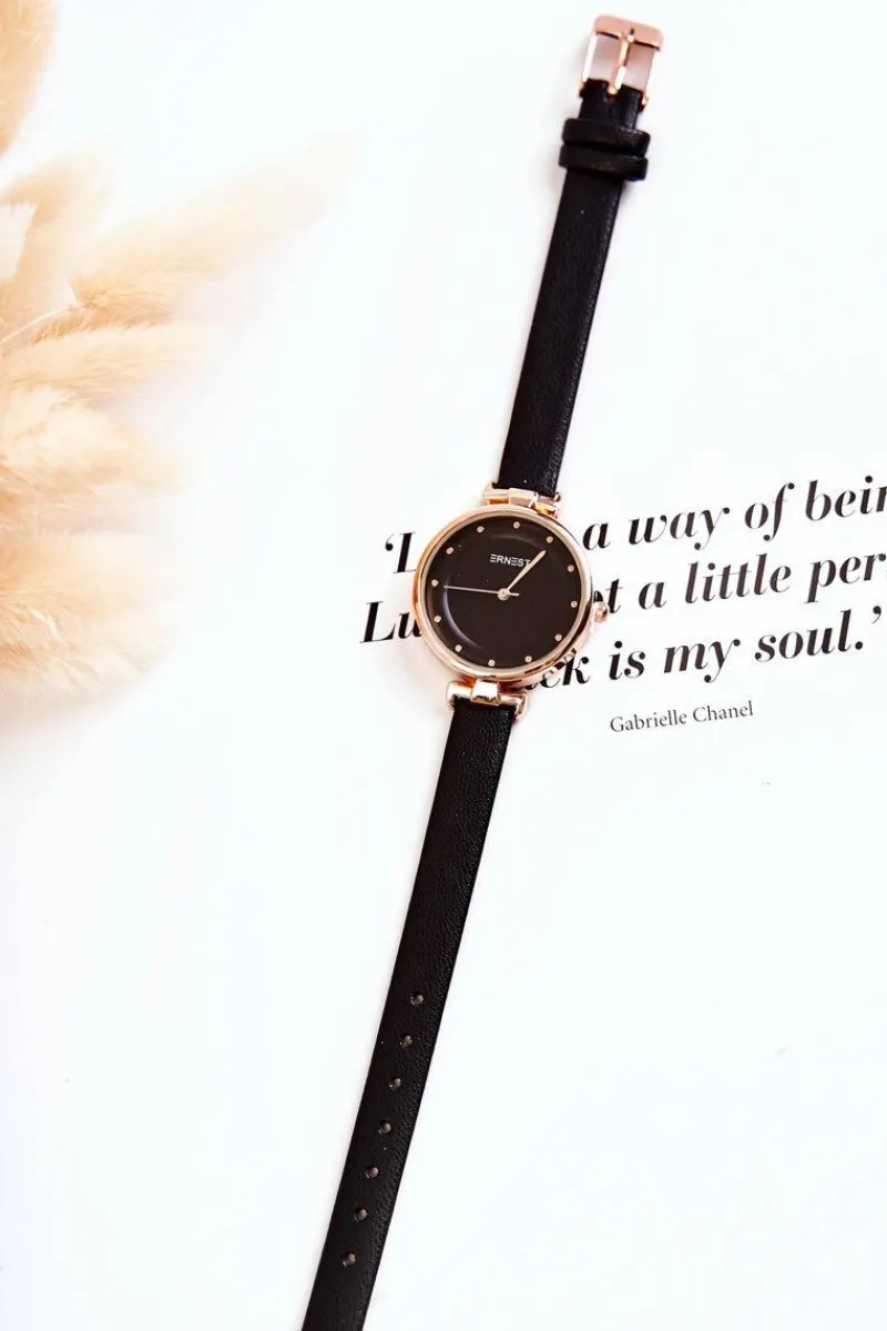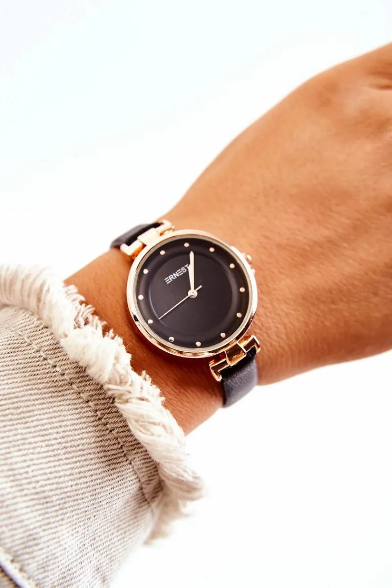 Damski zegarek Ernest to model dla każdej kobiety uwielbiającej modne dodatki! Zegarek idealny na co dzień. Posiada regulowany pasek ze skóry ekologicznej. Zapinany na sprzączkę. Tarcza w odcieniu paska zegarka. Wykonany z nierdzewnej stali. Nie zawiera niklu. Koniecznie powinnaś go mieć!