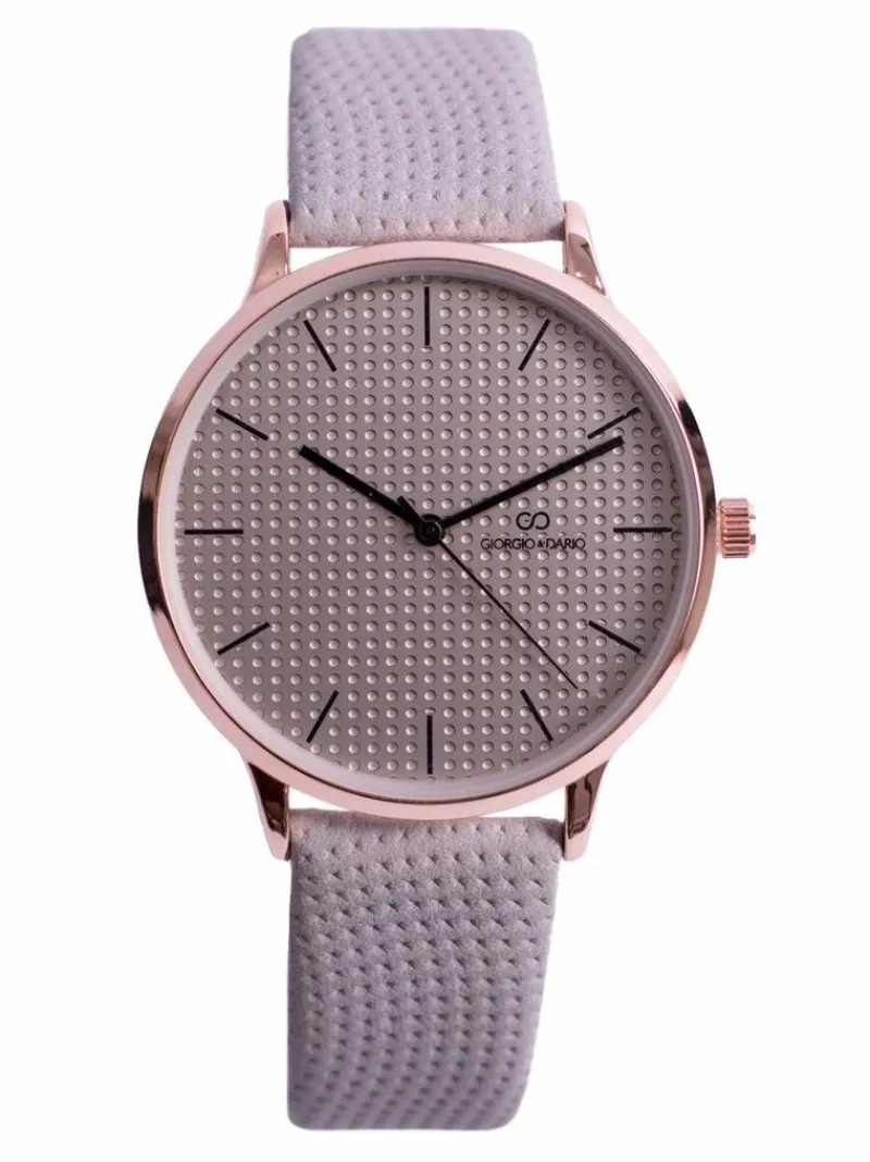 Chloe to klasyczna i elegancka linia damskich zegarków Giorgio & Dario. Zegarek posiada delikatnie płaskie szkiełko, dzięki temu jeszcze lepiej prezentuje się na ręce a jednocześnie jest bardziej czytelny. Pikowany pasek wykonany z delikatnej w dotyku skóry ekologicznej z możliwością łatwiej regulacji, koperta w złotym kolorze ze stali chirurgicznej, pasuje zarówno do eleganckich jak i codziennych stylizacji. Wysoka jakość wykonania mechanizmu i koperty.