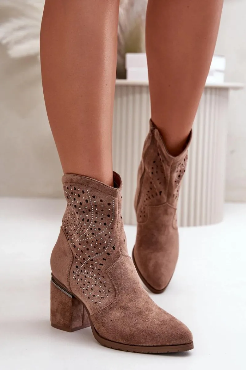 Sale Damskie buty S.Barski Zdobione Ażurowe Botki Damskie Na Słupku Z Eko Zamszu Brązowe S.Barski HY42-029 Brązowy