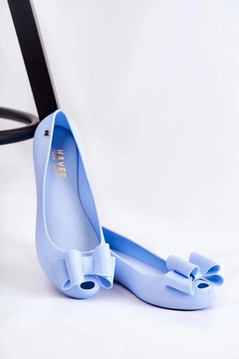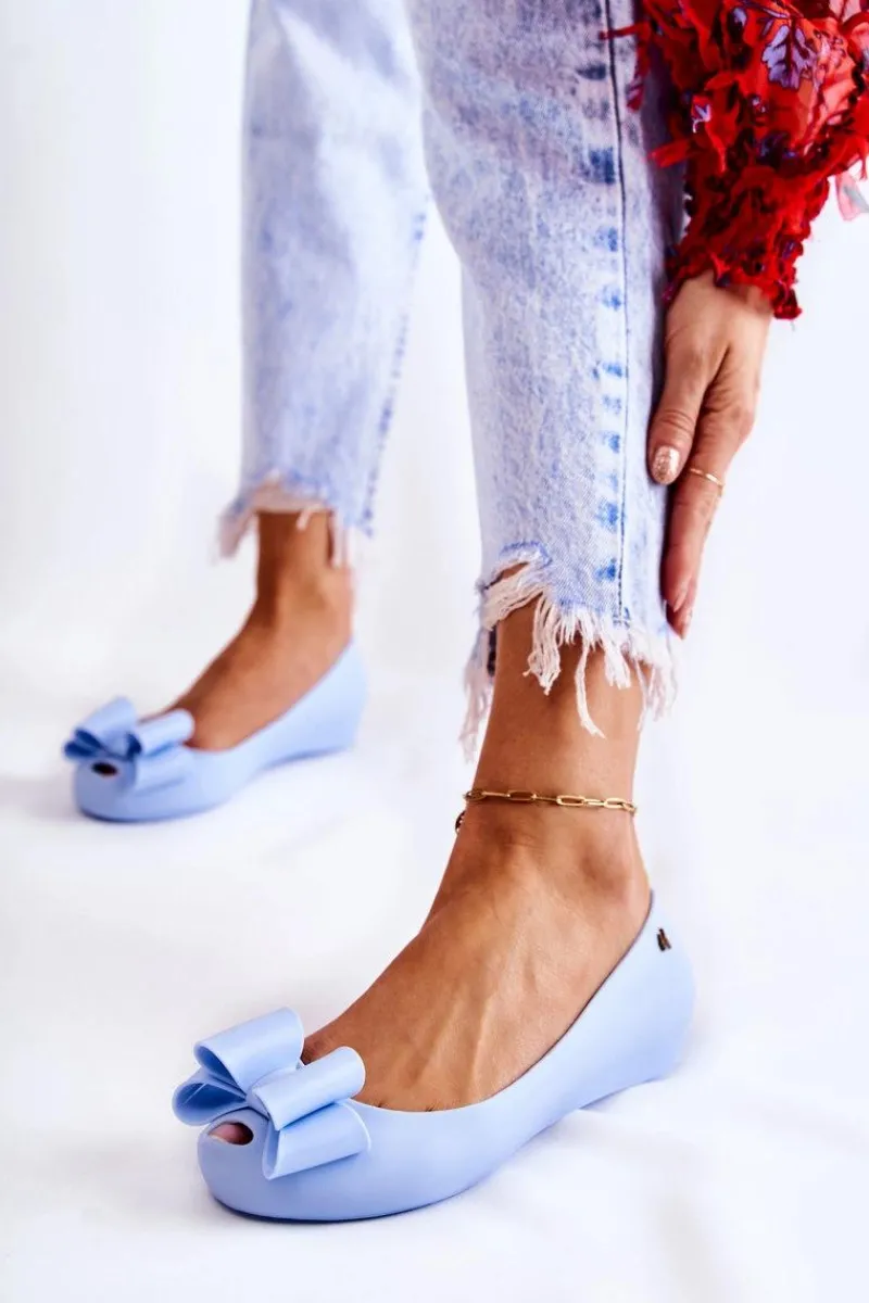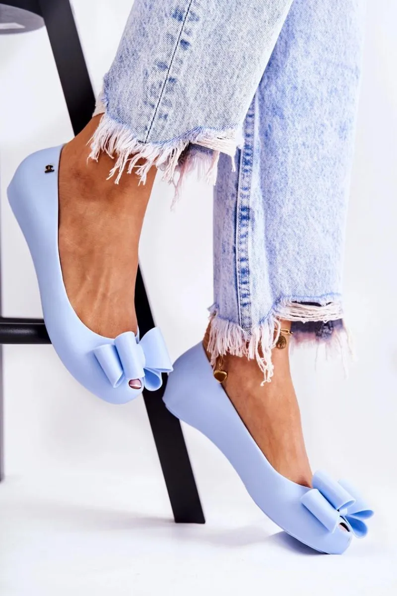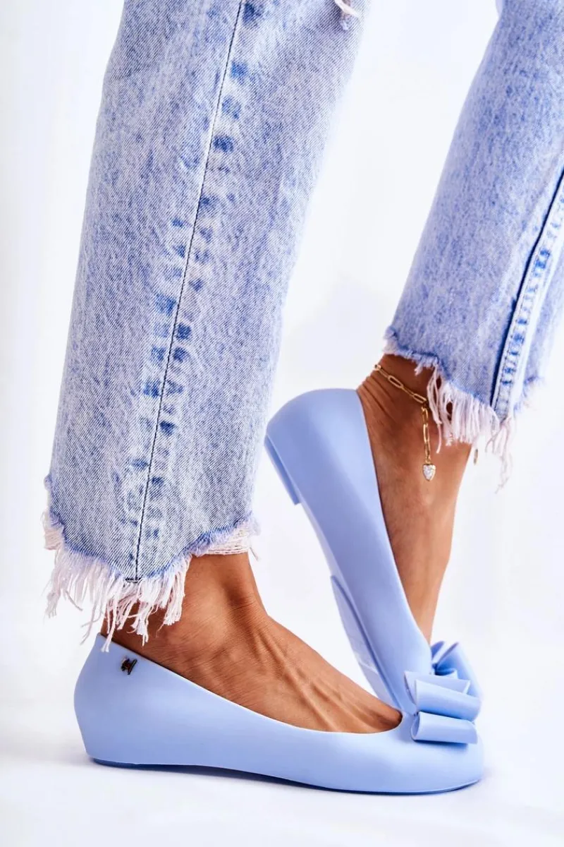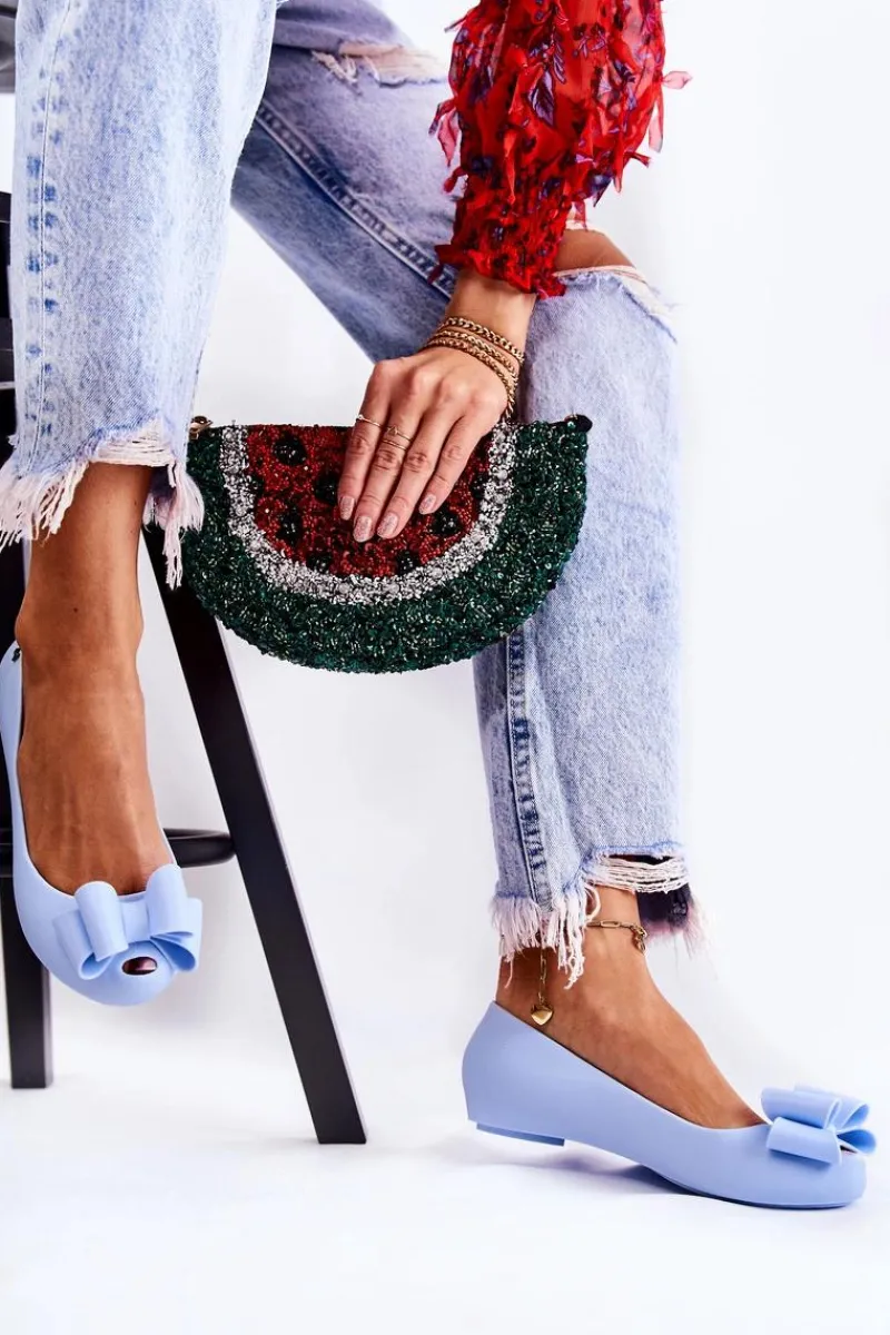 Wyjątkowe baleriny z ozdobną kokardą na przodzie. Dodatkowo na zaokrąglonym nosku znajduje się delikatne wycięcie. Buty zostały wykonane z gumowego tworzywa. Baleriny osadzone są na płaskim obcasie z antypoślizgową podeszwą. Miękka wkładka zapewni komfort podczas użytkowania. Z boku cholewki znajduje się ozdobny element. Te baleriny świetnie sprawdzą się na różnego rodzaju uroczystościach. Przy wyborze rozmiaru prosimy sugerować się tabelą rozmiarów.