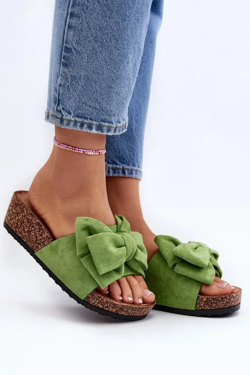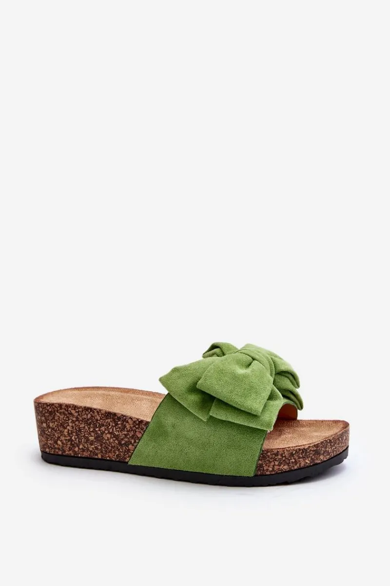 Klapki damskie na korkowej platformie. Buty posiadają lekko profilowaną wkładkę, która zagwarantuje komfort podczas użytkowania. Cholewka wykonana z przyjemnego w dotyku eko zamszu. Urocza kokarda na przodzie. Model ten idealnie sprawdzi się na co dzień, do pracy czy na zakupy. Idealne na upalne dni! Koniecznie powinnaś je mieć! Przy wyborze rozmiaru prosimy sugerować się tabelą rozmiarów.