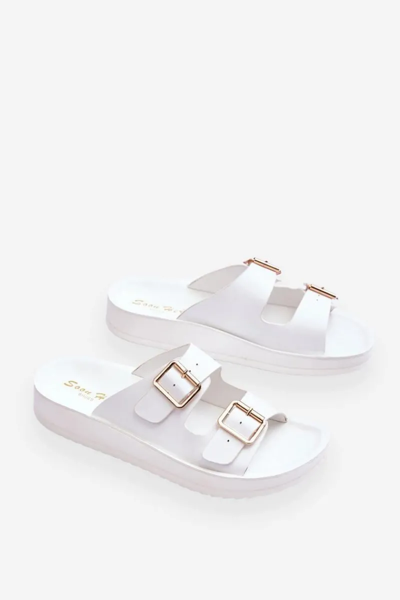 Klasyczne, damskie buty zostały wykonane z eko skóry. Posiadają ozdobną klamrę z regulowanymi paskami. Model ten został osadzony na platformie z tworzywa sztucznego. Idealne obuwie na letni sezon. Klapki te są niezwykle przewiewne i wygodne. Koniecznie powinnaś je mieć! Przy wyborze rozmiaru prosimy sugerować się tabelą rozmiarów.