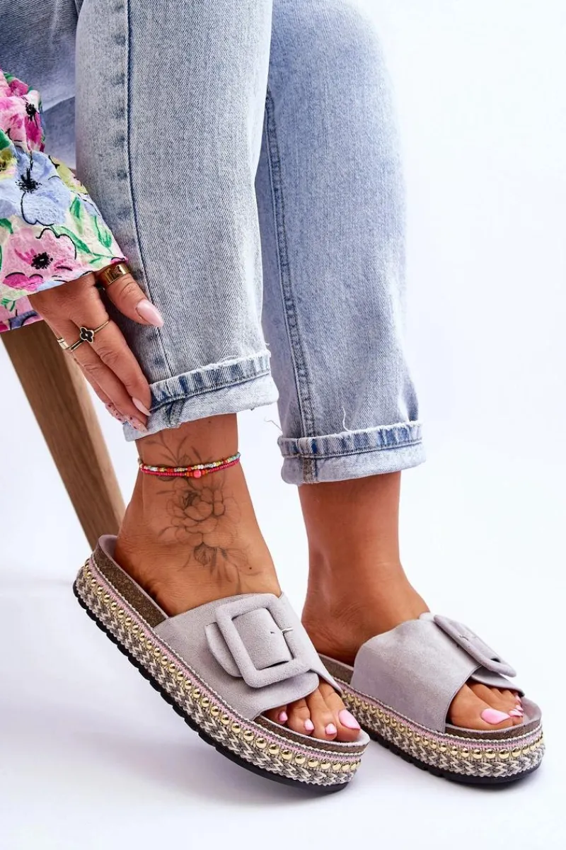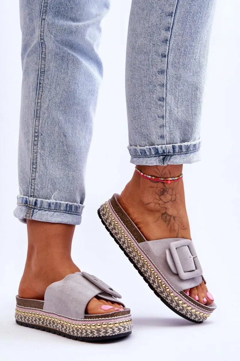 Wyjątkowe, damskie klapki zostały osadzone na platformie ozdobionej nitami oraz kolorowymi plecionkami. Model klasyczny, wsuwany, ozdobną klamrą i regulowanym paskiem, który pozwoli na odpowiednie dopasowanie obuwia do tęgości nogi. Profilowana wkładka zapewni wygodę w użytkowaniu. Świetny model do wielu stylizacji! Przy wyborze rozmiaru prosimy sugerować się tabelą rozmiarów.