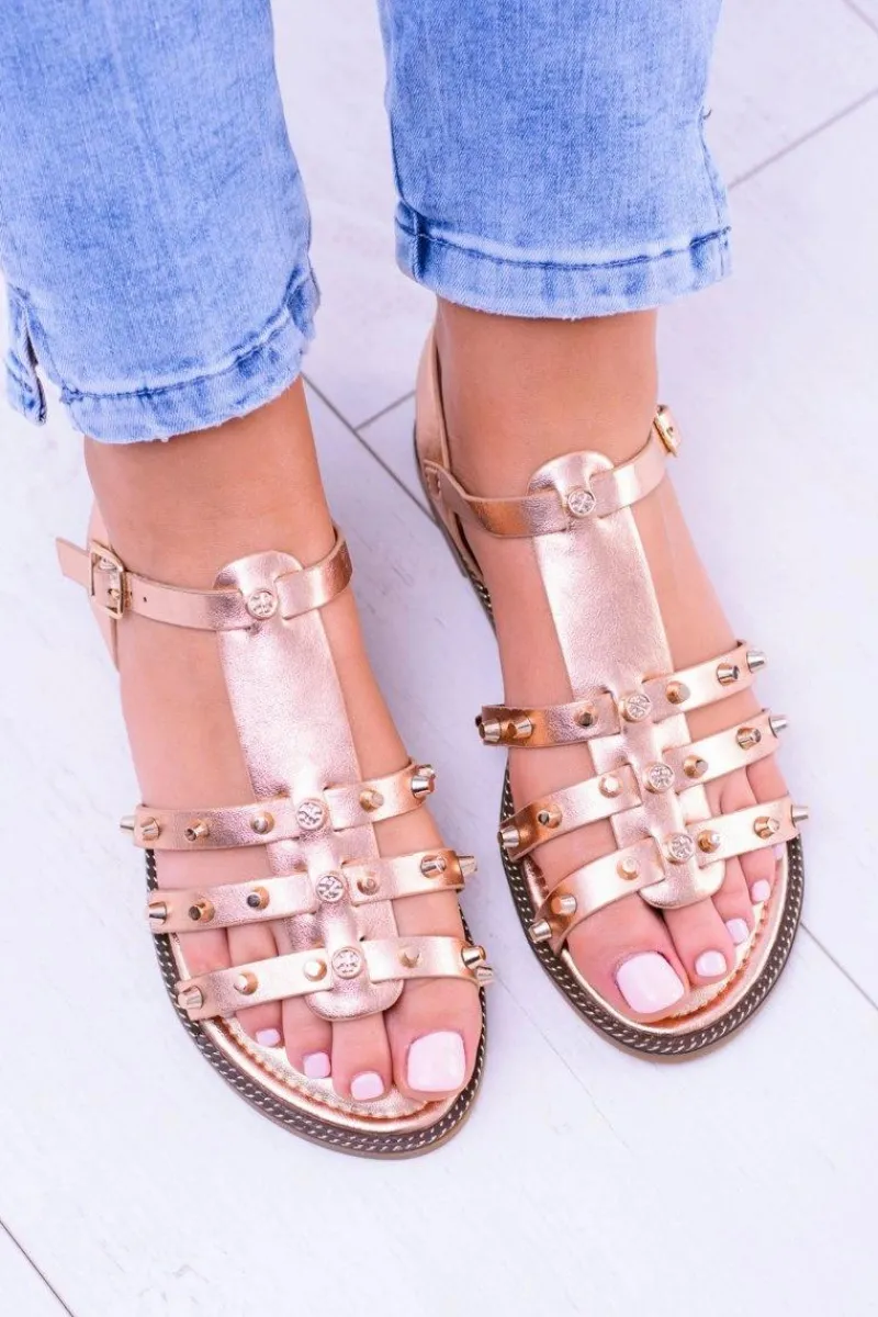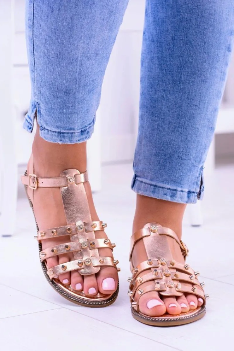 Sale Damskie Sandałki z Ćwiekami Aglet Różowe Złoto Damskie Sandały Płaskie