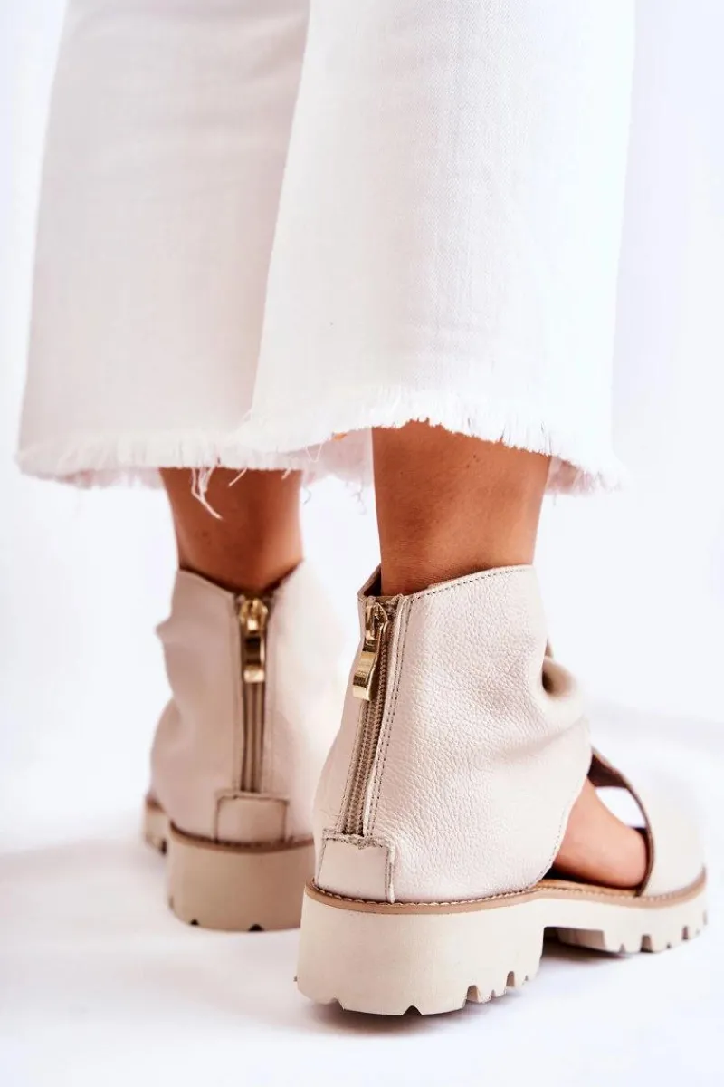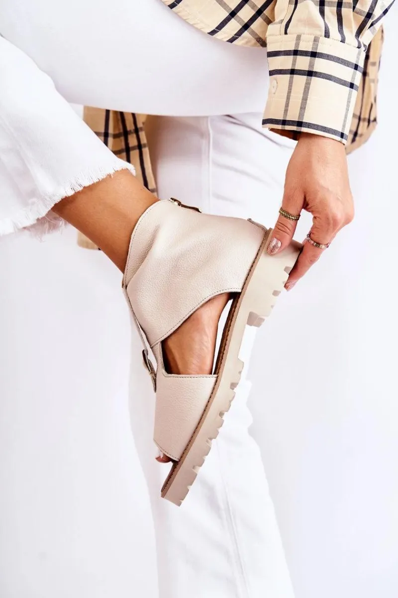 Wyjątkowe sandały z cholewką za kostkę. Posiadają paseczek ze sprzączką na środku. Z tyłu są zapinane na suwak. Po bokach znajdują się wycięcia. Nosek odkryty, zaokrąglony. Buty zostały osadzone na płaskim obcasie i delikatnej platformie. Ciekawy fason, który powinien znaleźć się w Twojej szafie! Miękka wkładka z naturalnej skóry zapewni wygodę podczas użytkowania. Przy wyborze rozmiaru prosimy sugerować się tabelą rozmiarów.