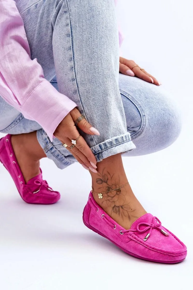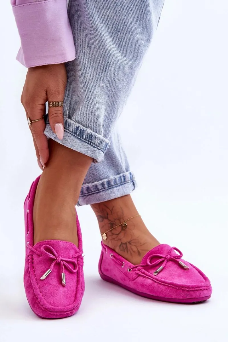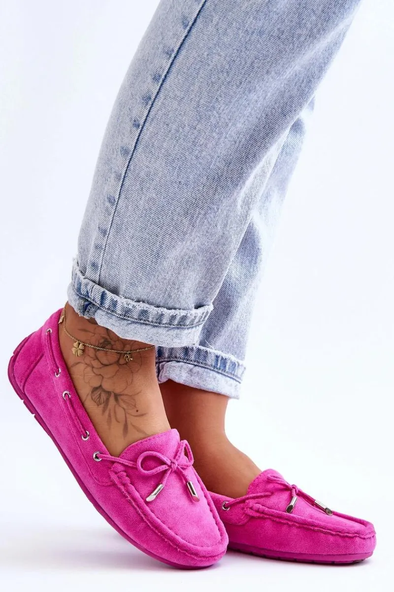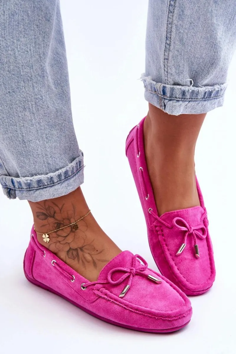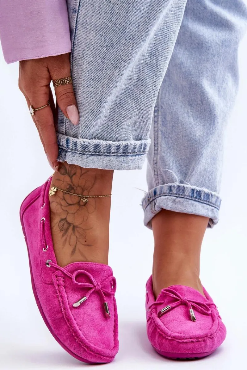 Damskie, klasyczne mokasyny zostały wykonane z eko zamszu. Model ten posiada na przodzie ozdobną kokardkę oraz przeplatające się przez boki cholewki sznureczki. Mokasyny osadzono na antypoślizgowej podeszwie. Miękka wkładka z eko skóry zapewni komfort podczas użytkowania obuwia. Dodatkowo jest delikatnie perforowana. Koniecznie powinnaś je mieć w swojej kolekcji obuwia! Przy wyborze rozmiaru prosimy sugerować się tabelą rozmiarów.
