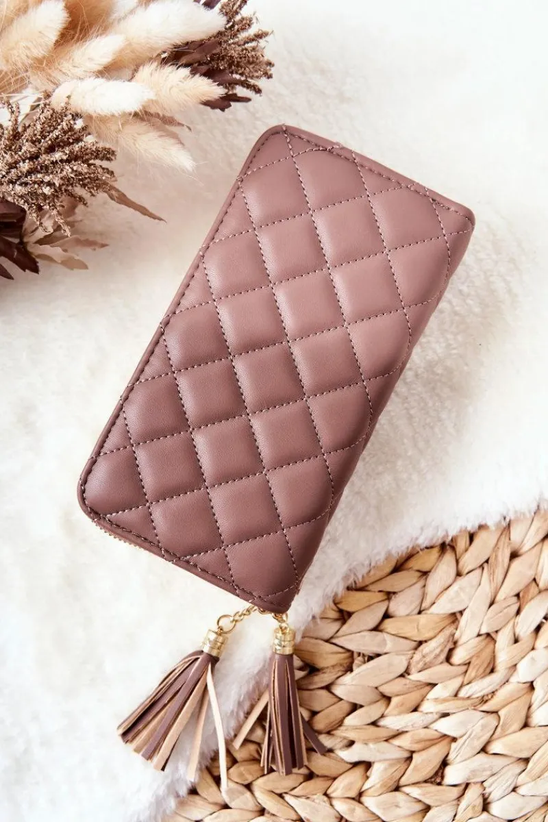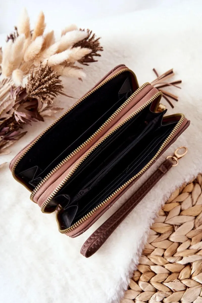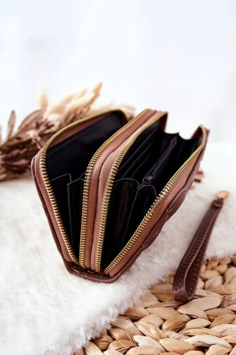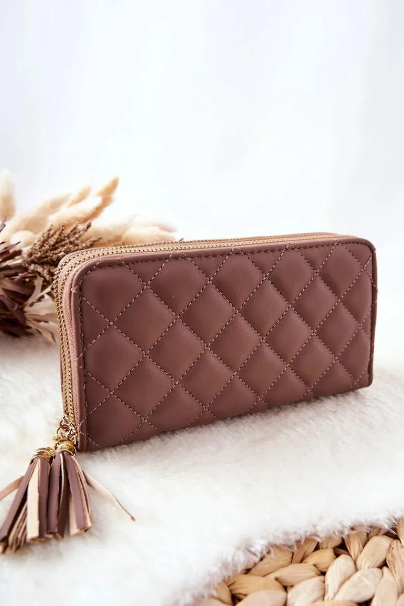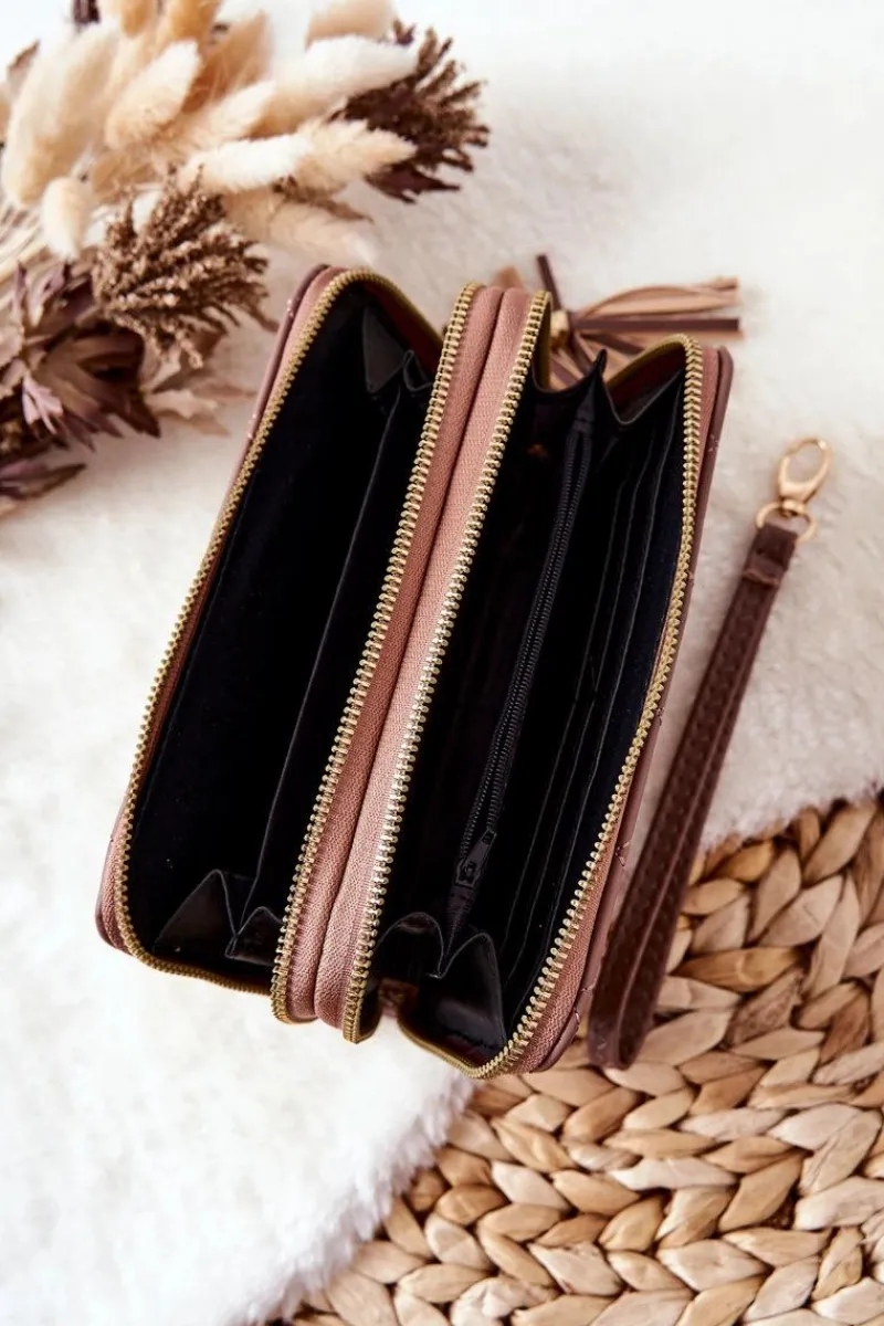 Duży i praktyczny portfel zapinany z zewnątrz na dwa zamki błyskawiczne. W jednej z przegródek można znaleźć miejsce na bilony, banknoty oraz wizytówki, natomiast w drugiej można umieścić niewielkiego smartfona lub banknoty czy dokumenty. Z zewnątrz portfel został wykonany z pikowanej eko skóry, a przy zamkach znajdują się frędzelki. Dodatkowo w zestawie jest dołączony paseczek.