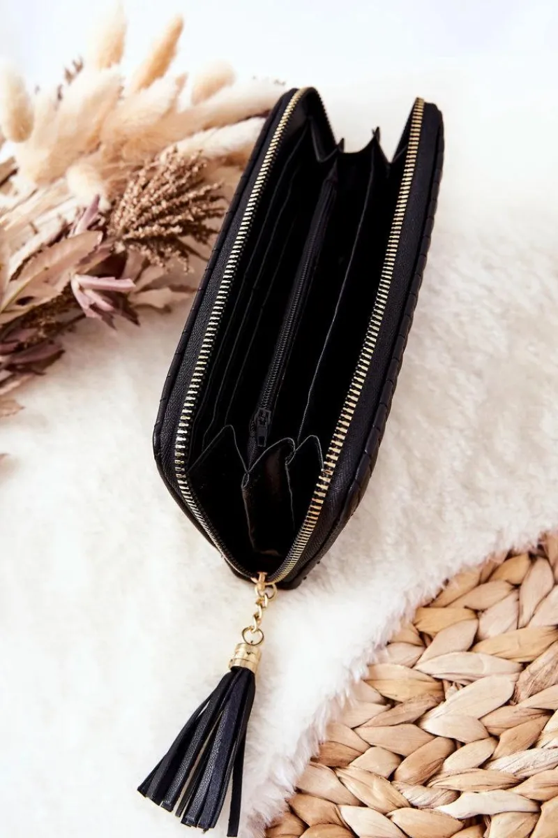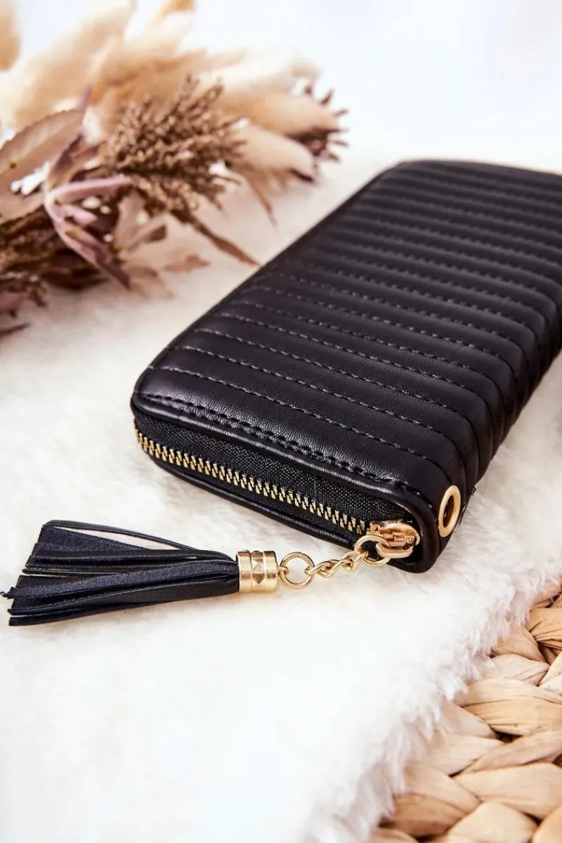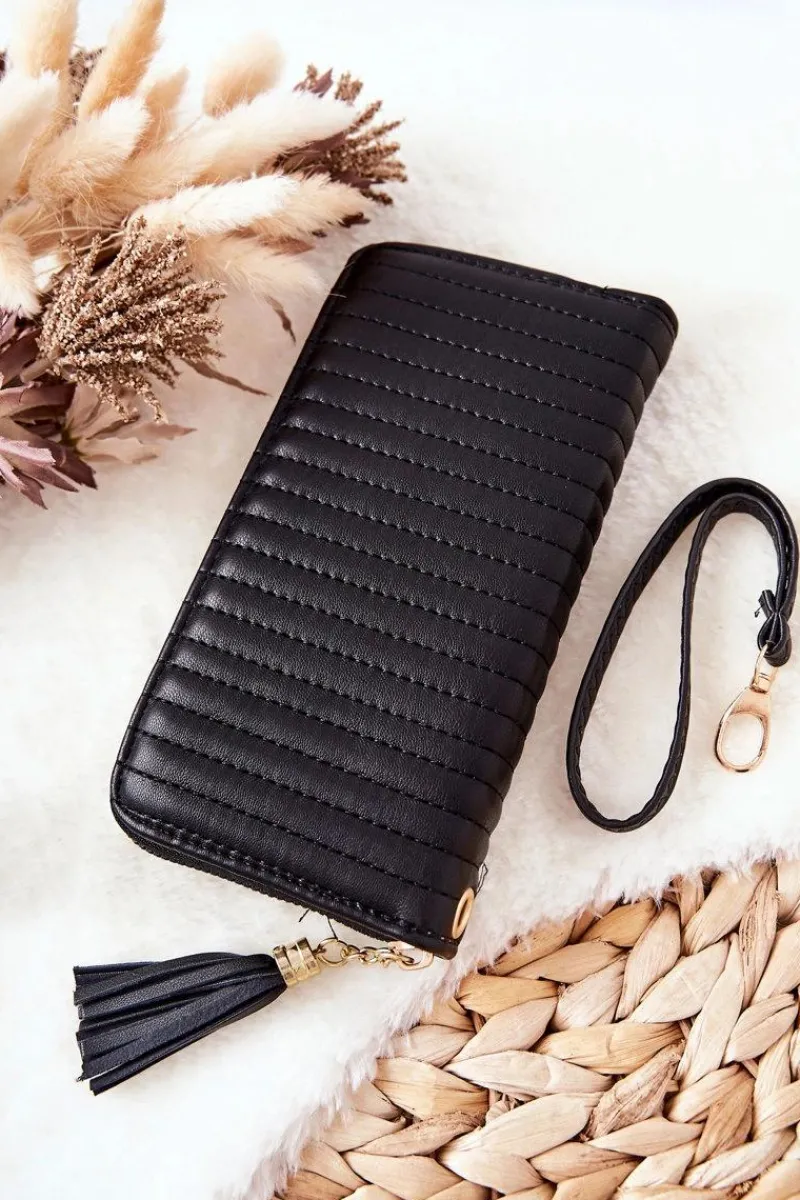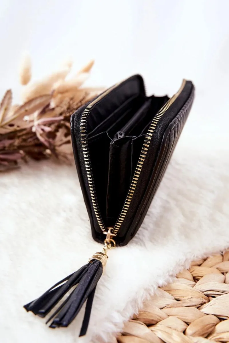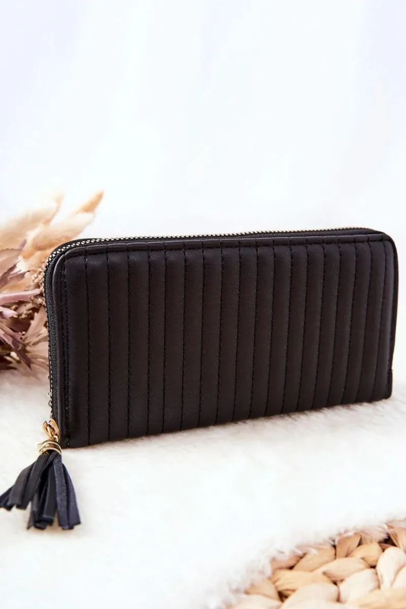 Duży portfel został wykonany z pikowanej eko skóry. Posiada przy zamku frędzelek. W zestawie jest dołączony paseczek w tym samym kolorze i materiale. Portfel w środku posiada miejsce na bilony, banknoty oraz wizytówki. Poznaj inne modele z naszej kolekcji ! Na pewno znajdziesz model idealny dla siebie!