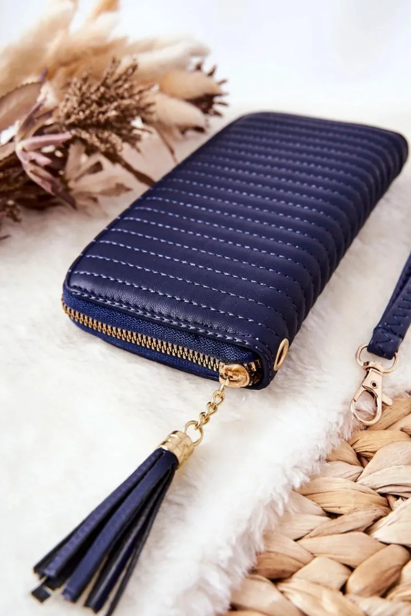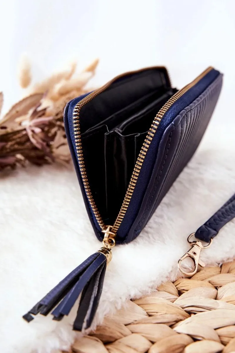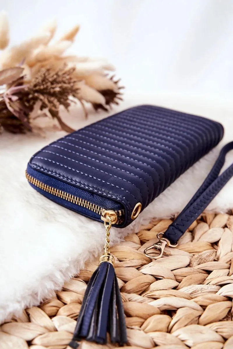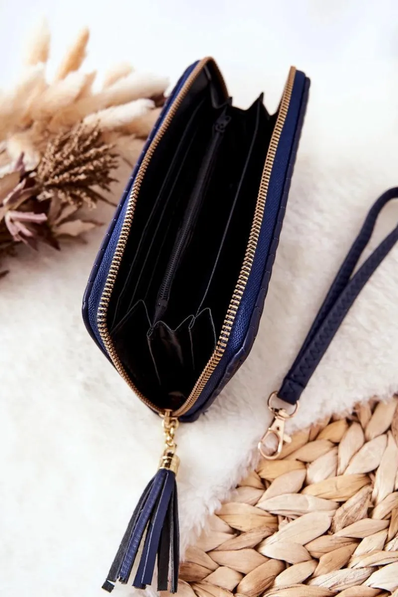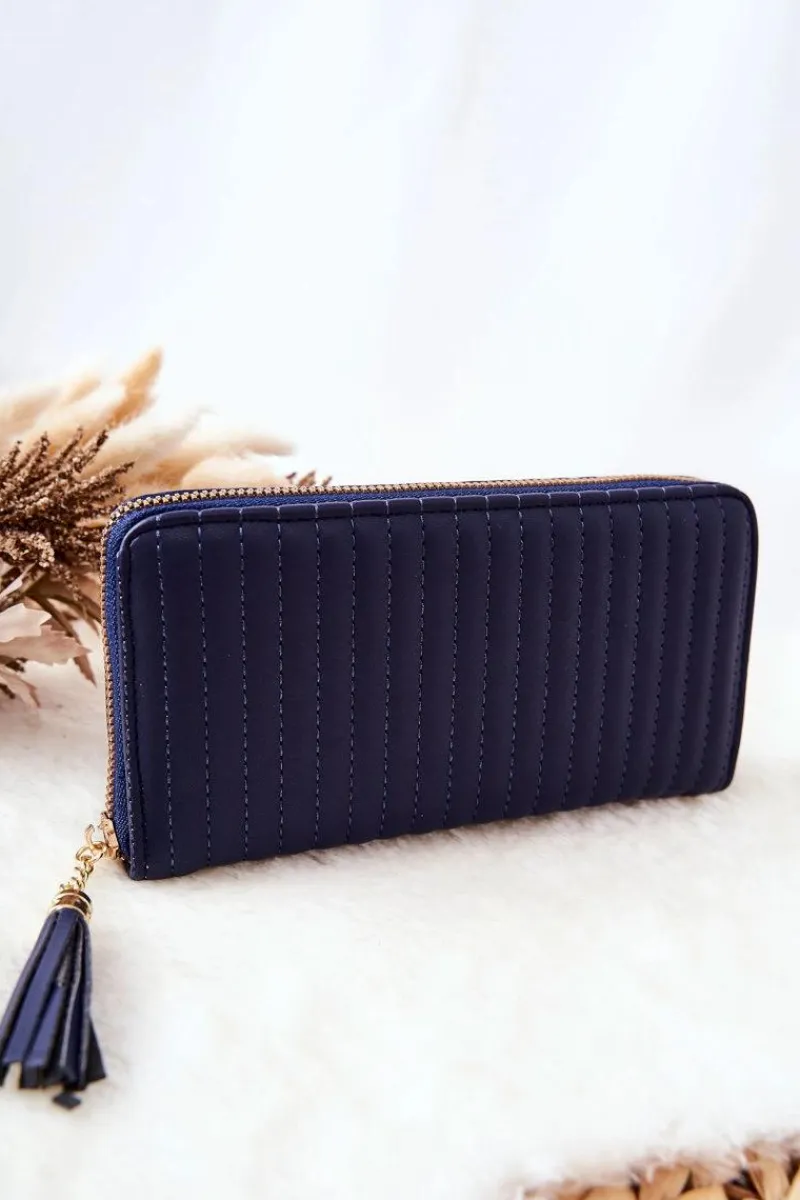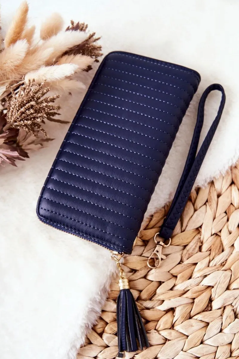 Duży portfel został wykonany z pikowanej eko skóry. Posiada przy zamku frędzelek. W zestawie jest dołączony paseczek w tym samym kolorze i materiale. Portfel w środku posiada miejsce na bilony, banknoty oraz wizytówki. Poznaj inne modele z naszej kolekcji ! Na pewno znajdziesz model idealny dla siebie!