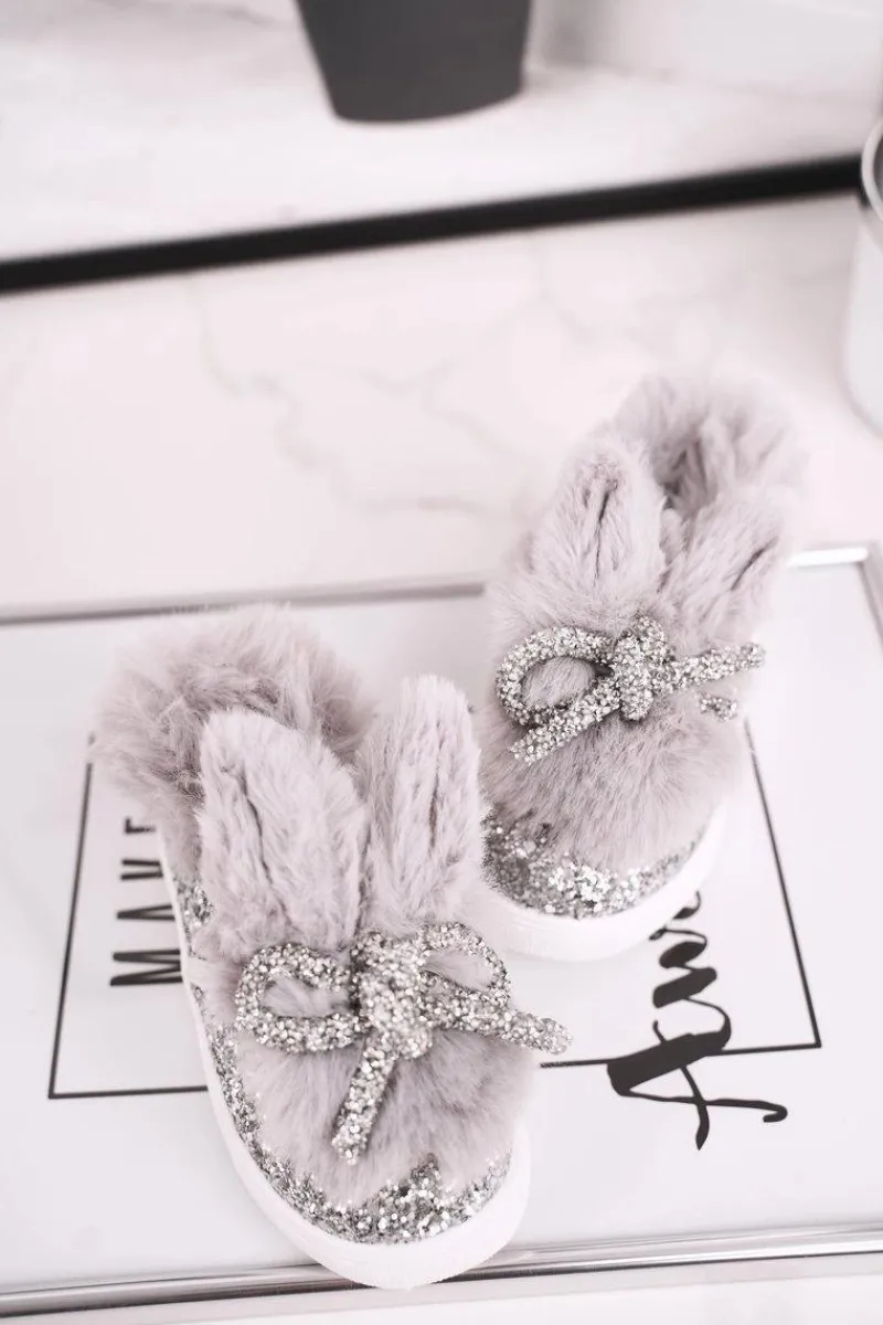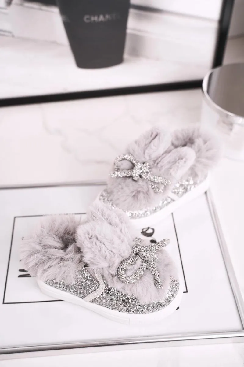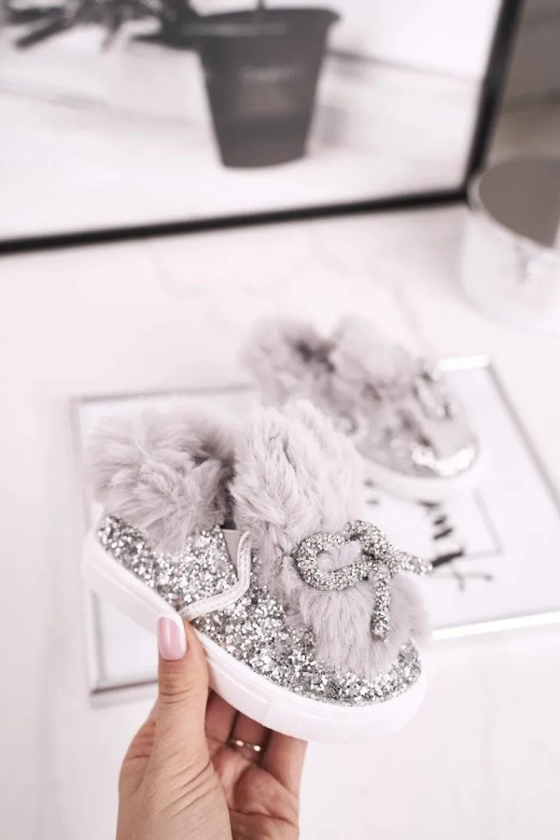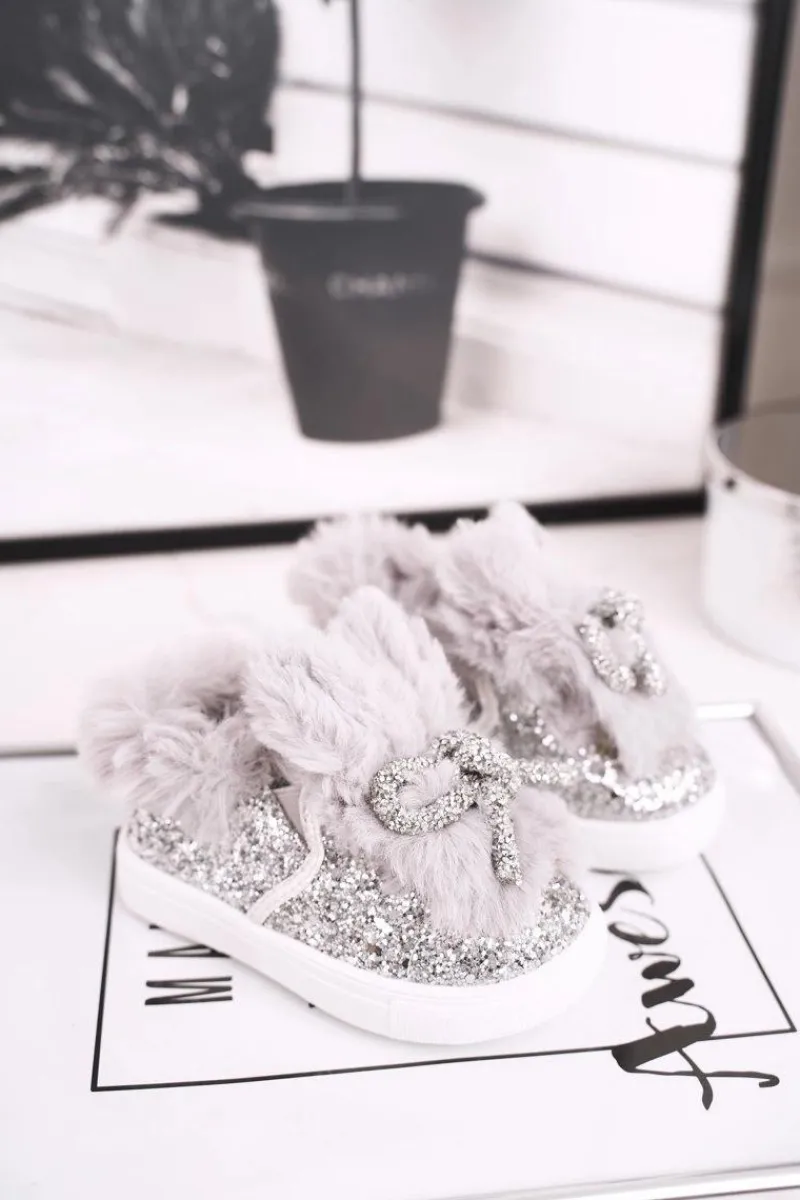 Klasyczne trampki wykonane z przyjemnego w dotyku futerka. Modne brokatowe noski i uszka oraz rzepy ułatwią najmłodszym ubieranie. Buciki pięknie wyglądają oraz są wygodne. Wnętrze nie jest ocieplone. Przy wyborze rozmiaru prosimy sugerować się tabelą rozmiarów. Ze względu na różne grupy rozmiarowe, rozmiary 24, 25, 26 mogą posiadać tę samą długość wkładki. Rozmiary 25 i 26 należą do dużej grupy rozmiarowej – będą delikatnie szersze.