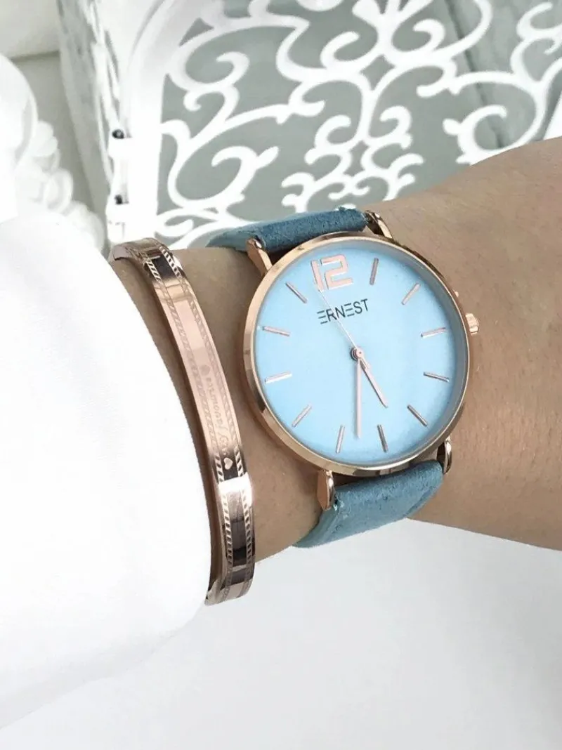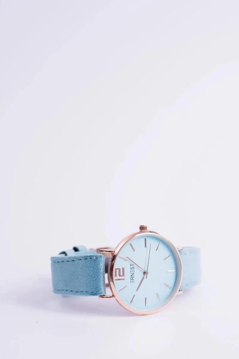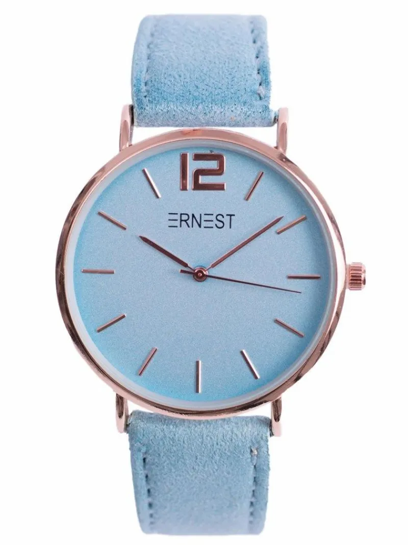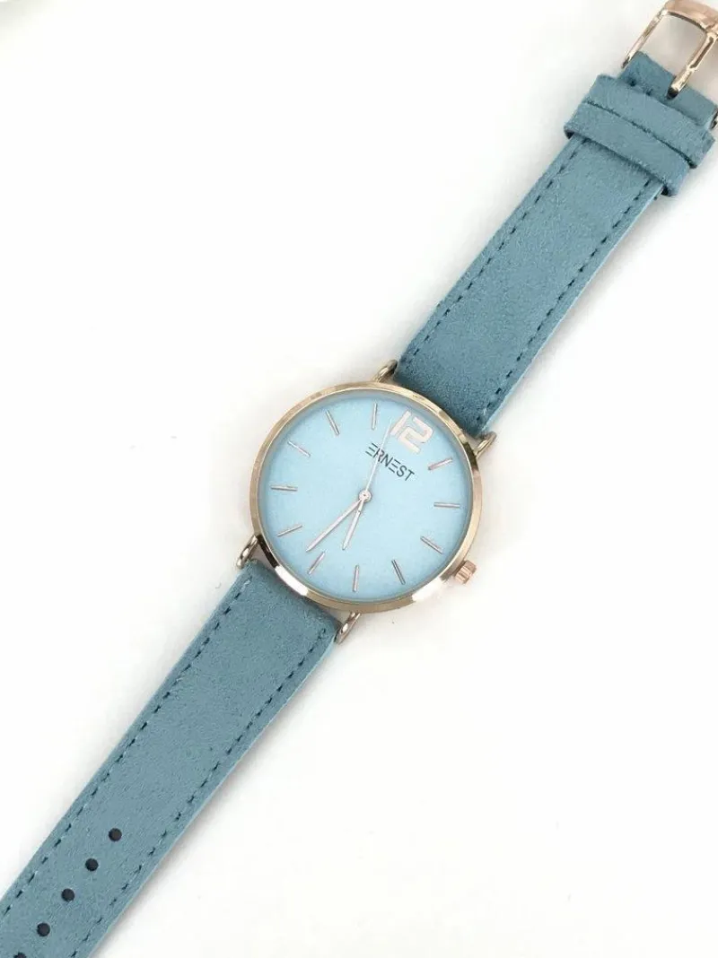 Zegarek Manon marki Ernest to gratka stworzona z myślą o kobietach kochających gustowne dodatki nie tylko do eleganckich ale również do codziennych stylizacji. Zegarek posiada płaskie szkiełko, dzięki temu jeszcze lepiej prezentuje się na ręce a jednocześnie jest bardziej czytelny. Zamszowy pasek w kolorze tarczy oraz koperta utrzymana w kolorystyce złota wykonana ze stali chirurgicznej z możliwością łatwej i szybkiej regulacji. Wysoka jakość wykonania mechanizmu i koperty.