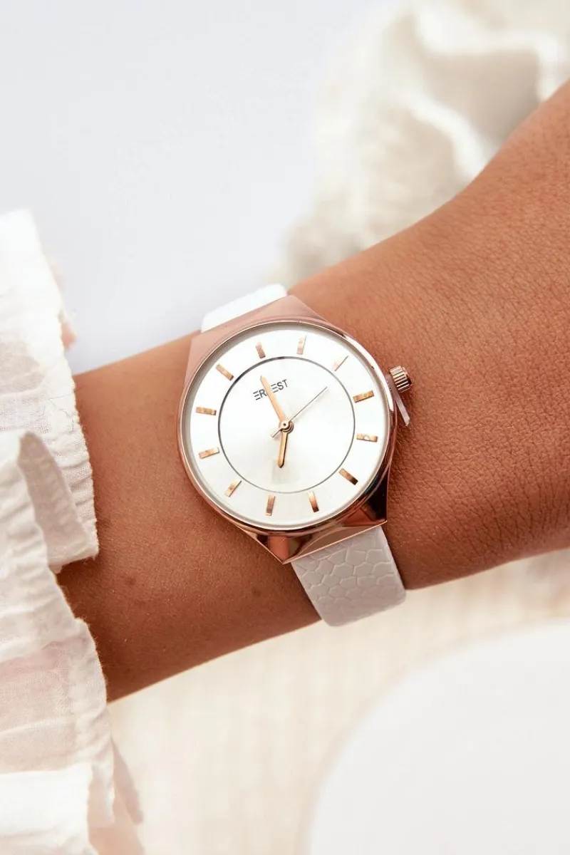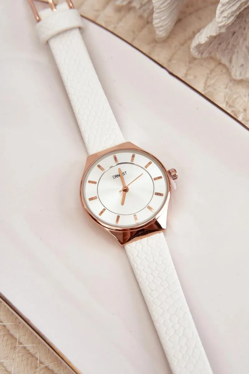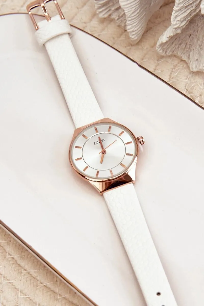 Zegarek Ernest to model dla każdej kobiety, która ceni sobie eleganckie i modne dodatki. Zegarek posiada regulowany pasek ze skóry ekologicznej. Zapinany na sprzączkę. Tarcza w odcieniu paska zegarka. Wykonany z nierdzewnej stali. Nie zawiera niklu.