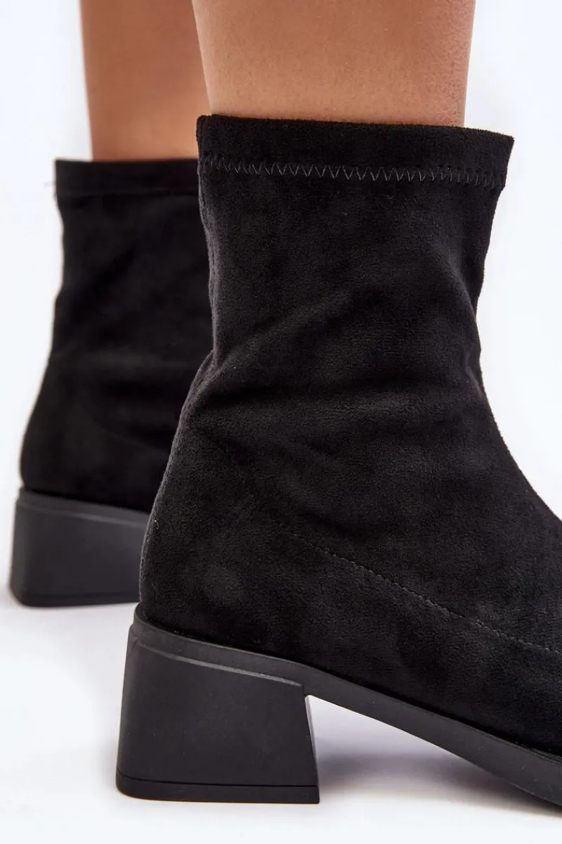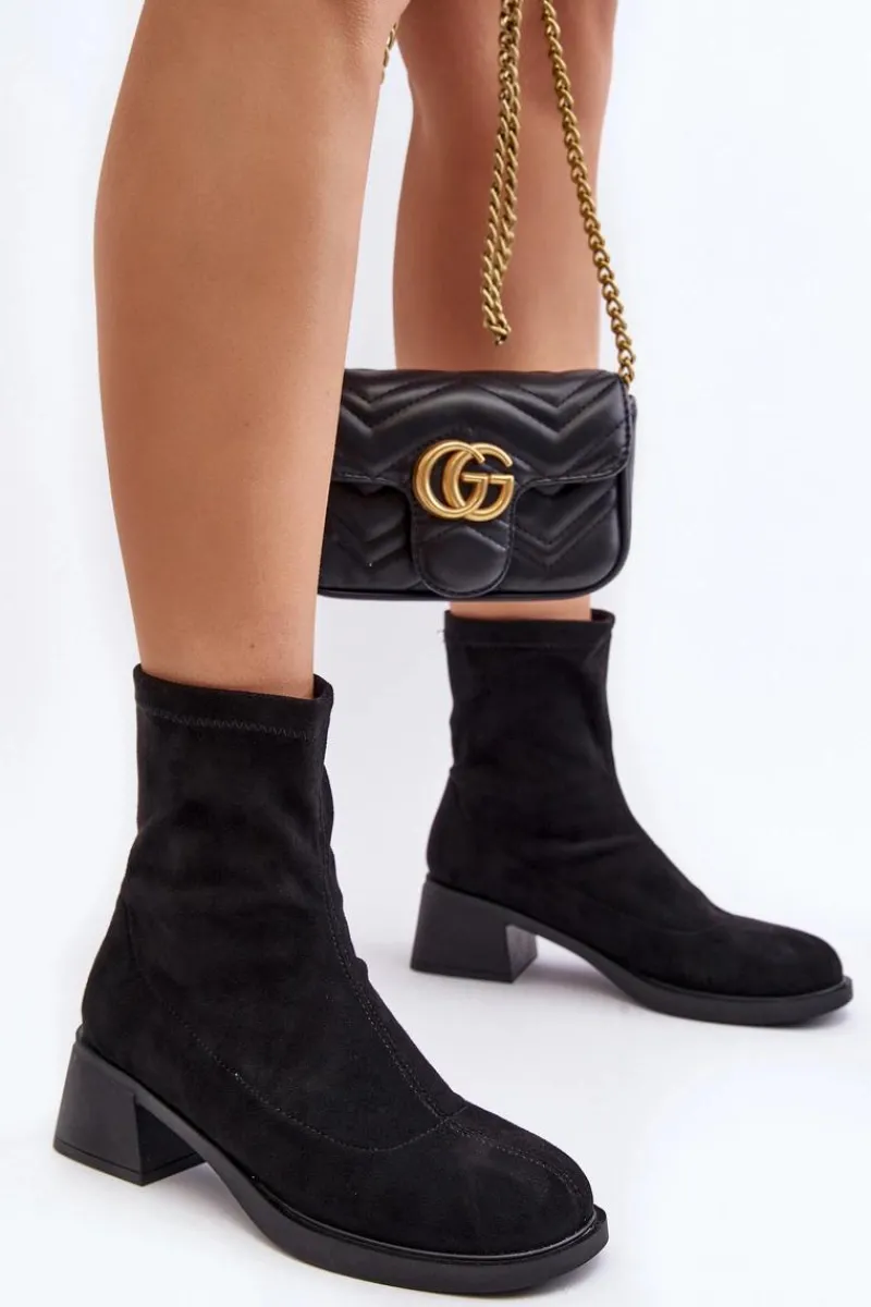 Damskie, wsuwane botki wykonane z eko zamszu. Osadzone na niskim obcasie w postaci klocka. Noski zaokrąglone. Cholewka za kostkę. Klasyczny fason, który dopasujesz do niemalże każdej jesiennej stylizacji! Przy wyborze rozmiaru prosimy sugerować się tabelą rozmiarów.