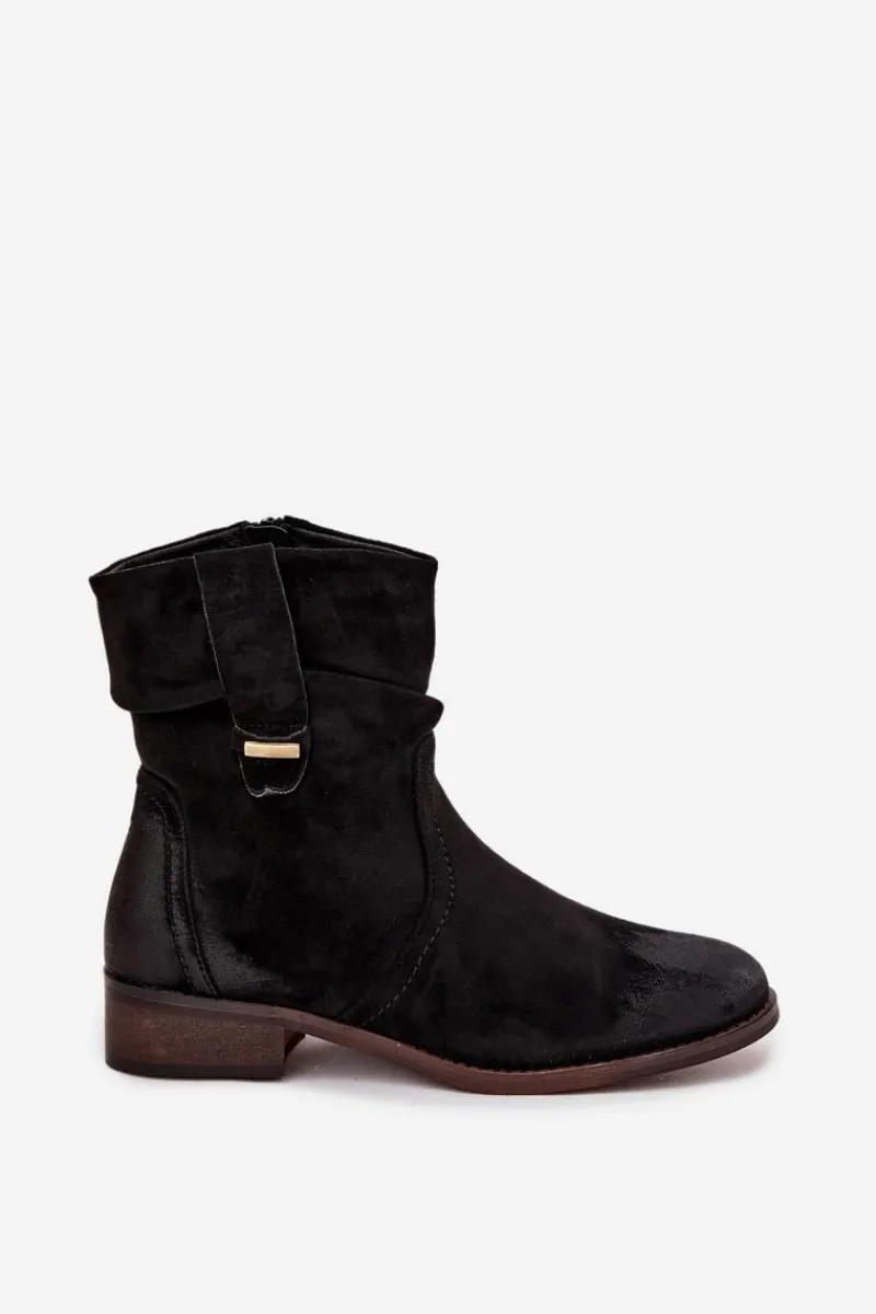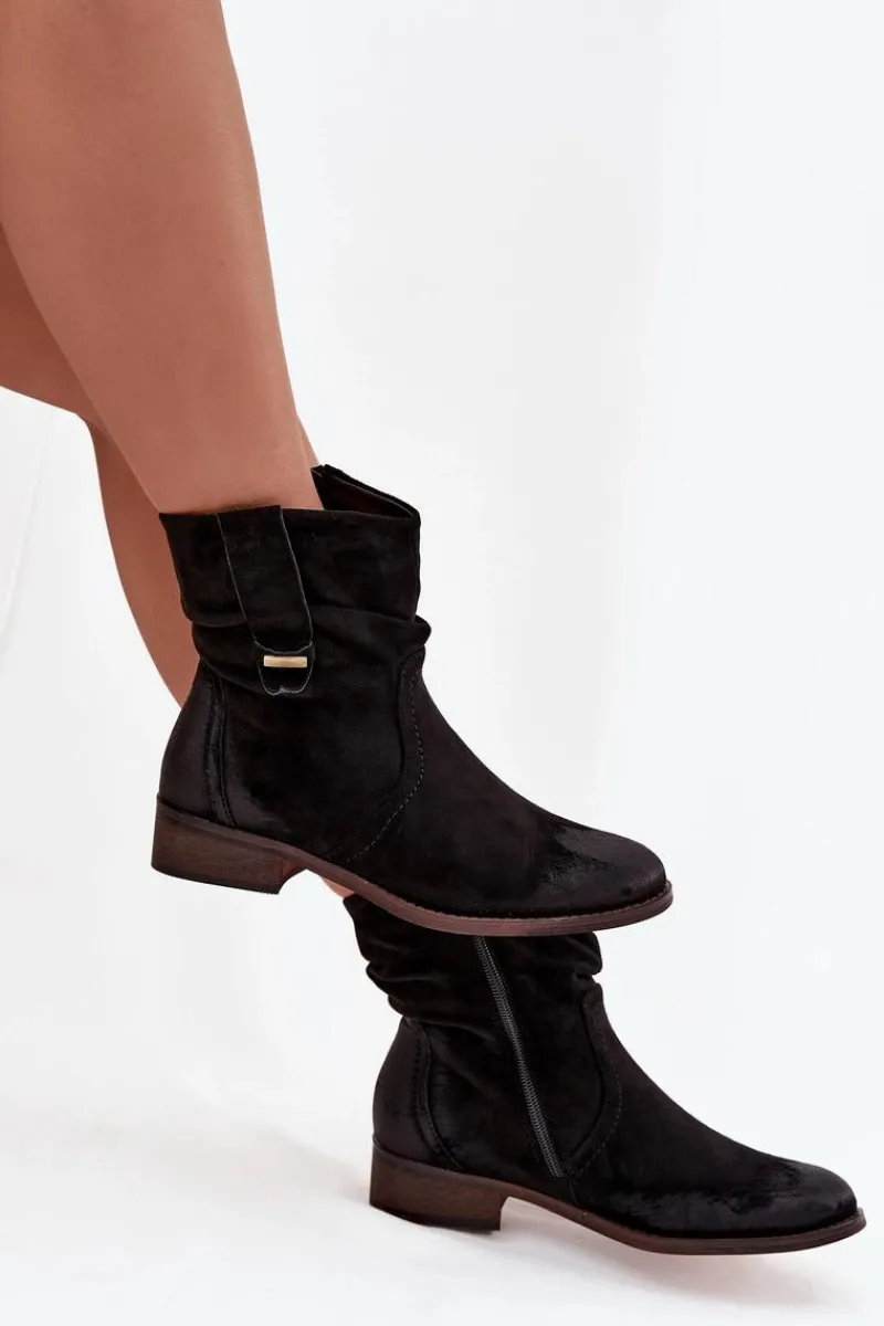 Botki damskie wykonane z miękkiego eko zamszu. Model osadzony na niskim obcasie zapewnia komfort noszenia, a ocieplane wnętrze doskonale sprawdza się w chłodniejsze dni. Zamek ułatwia zakładanie i zdejmowanie butów, natomiast zaokrąglone noski nadają im klasycznego charakteru. Uroku dodaje marszczona cholewka, która podkreśla stylowy, kobiecy wygląd. To uniwersalne botki idealne do codziennych stylizacji – świetnie pasują zarówno do spodni, jak i sukienek.Przy wyborze rozmiaru prosimy sugerować się tabelą rozmiarów.