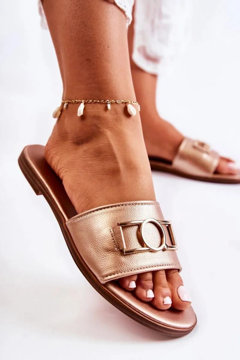 Modne damskie klapki na płaskim obcasie to idealny model na co dzień! Wykonane z eko skóry. Model wsuwany, z odkrytym, zaokrąglonym noskiem. Z przodu znajduje się ozdobny emblemat. Podeszwa wykonana z gumowego tworzywa, antypoślizgowa. Wkładka wykonana z eko skóry. Jest miękka i komfortowa w użytkowaniu. Świetny model, idealny do wielu stylizacji! Koniecznie powinnaś je mieć! Przy wyborze rozmiaru prosimy sugerować się tabelą rozmiarów.