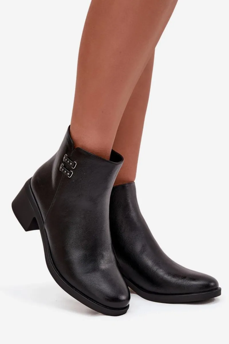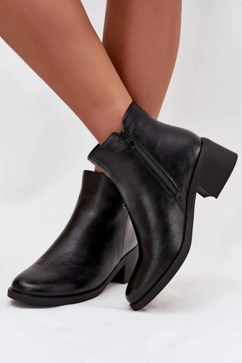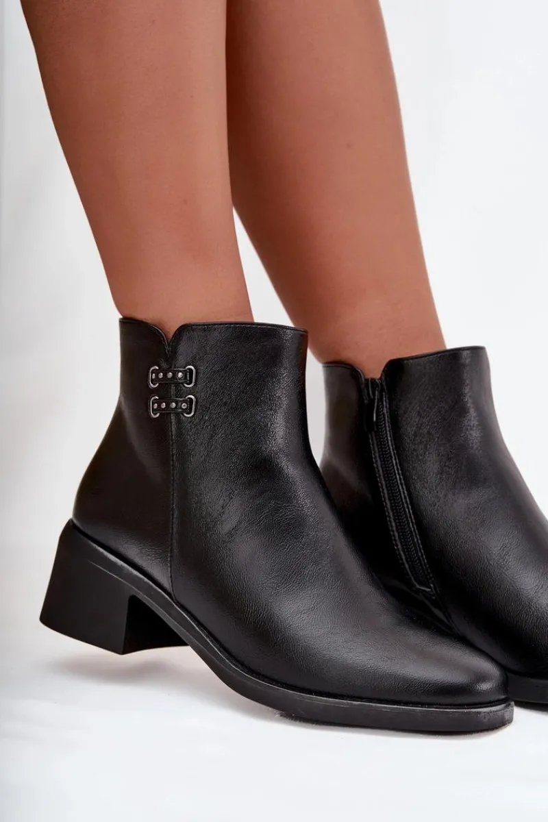 Botki damskie z eko skóry to wygodna i stylowa propozycja na chłodniejsze dni. Osadzone na obcasie w formie klocka, zapewniają stabilność i komfort noszenia, a zaokrąglone noski nadają im klasycznego charakteru. Zapinane na zamek, są praktyczne i łatwe w zakładaniu. Wnętrze zostało ocieplone miękkim futerkiem, które gwarantuje ciepło i wygodę. Dodatkowego uroku dodają im dwa krótkie ozdobne paseczki umieszczone na górze cholewki.