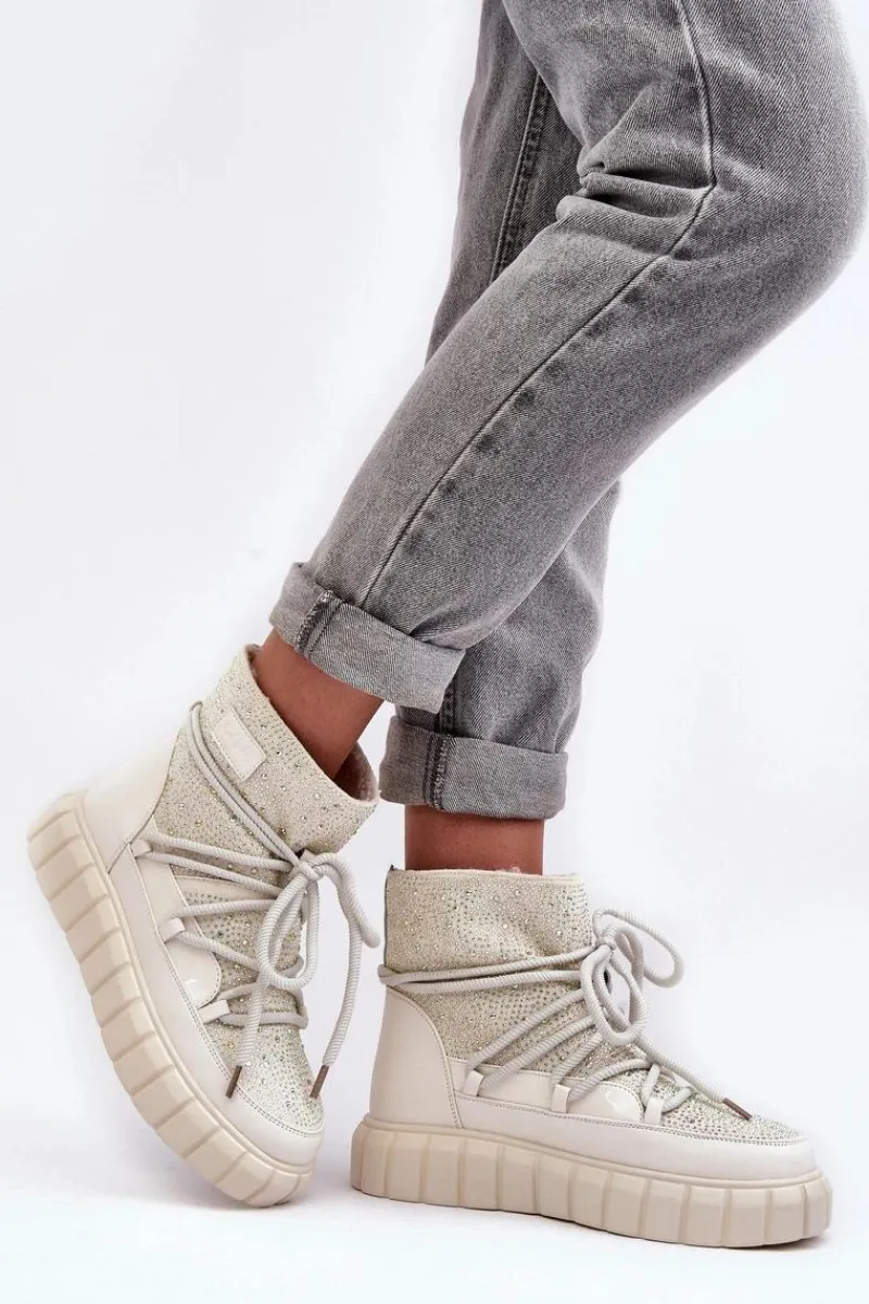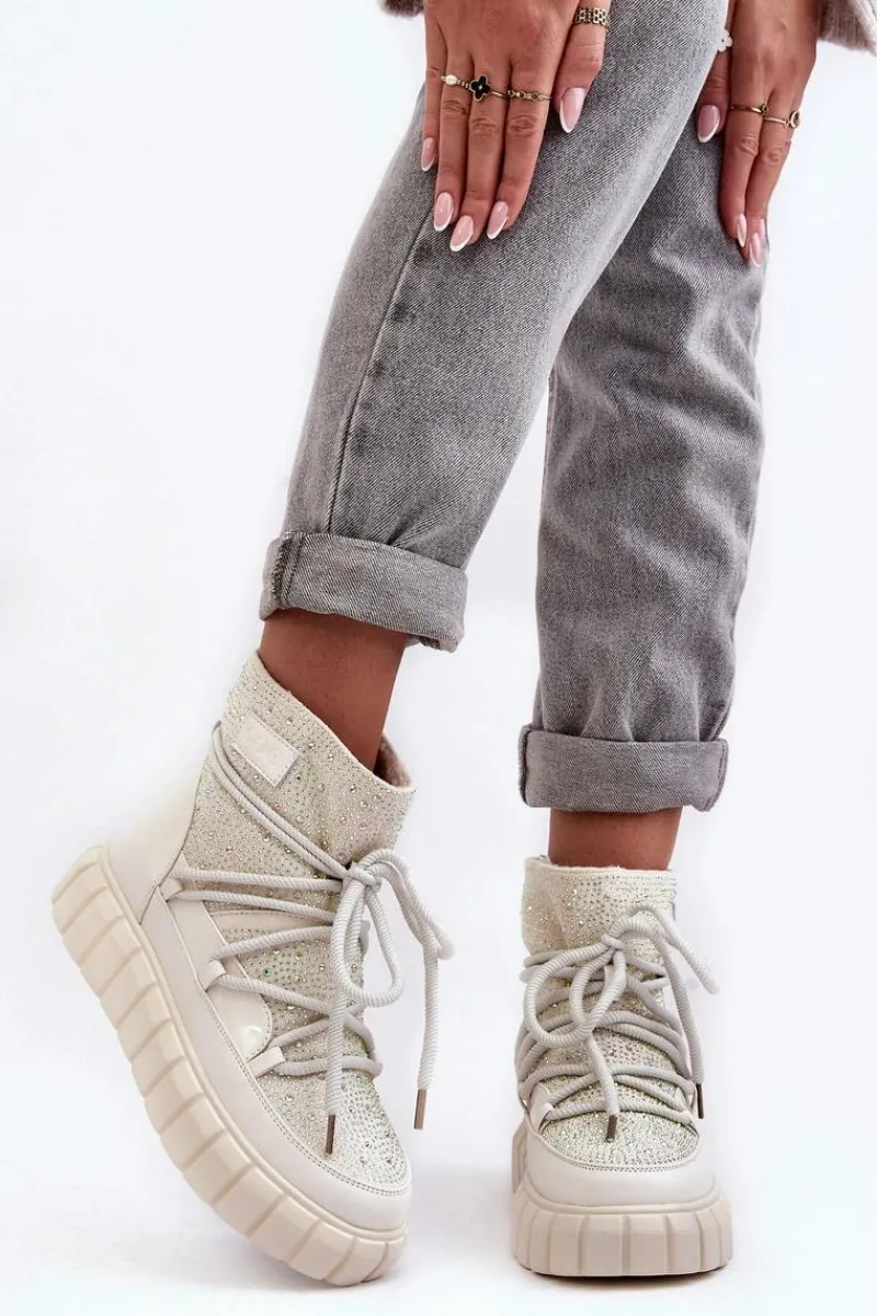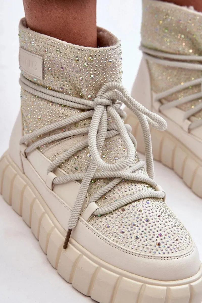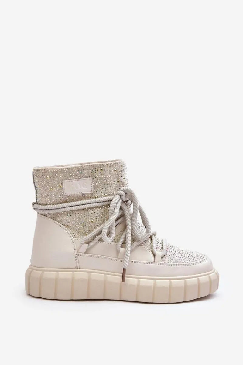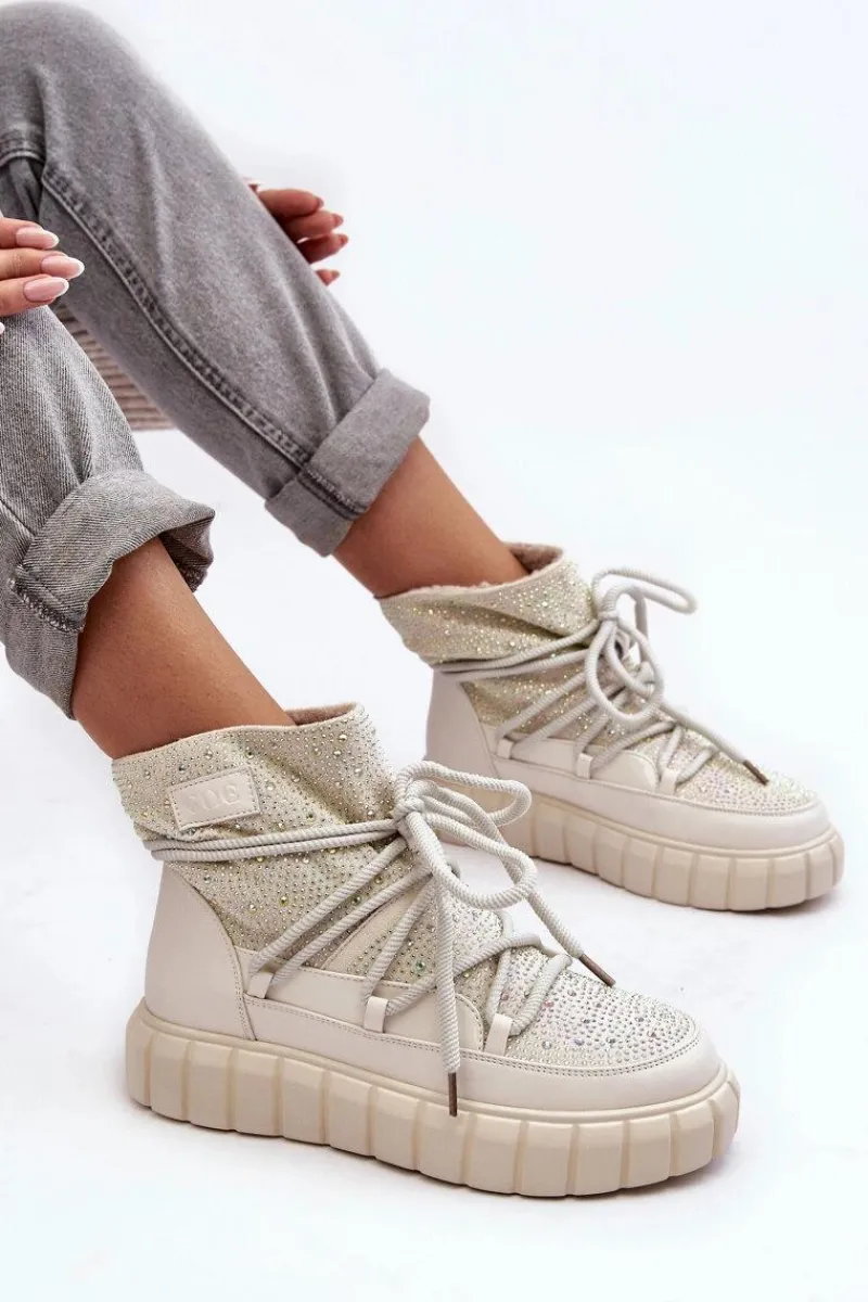 Śniegowce marki GOE zostały wykonane z połączenia skóry naturalnej i materiału tekstylnego. Środek ocieplony kożuchem. Model wsuwany z dodatkowym wiązaniem. Cholewka ozdobiona licznymi, błyszczącymi dżetami. Zapiętek jest usztywniony. Niezwykle ciepłe, a zarazem stylowe. Koniecznie powinnaś je mieć! Przy wyborze rozmiaru prosimy sugerować się tabelą rozmiarów.
