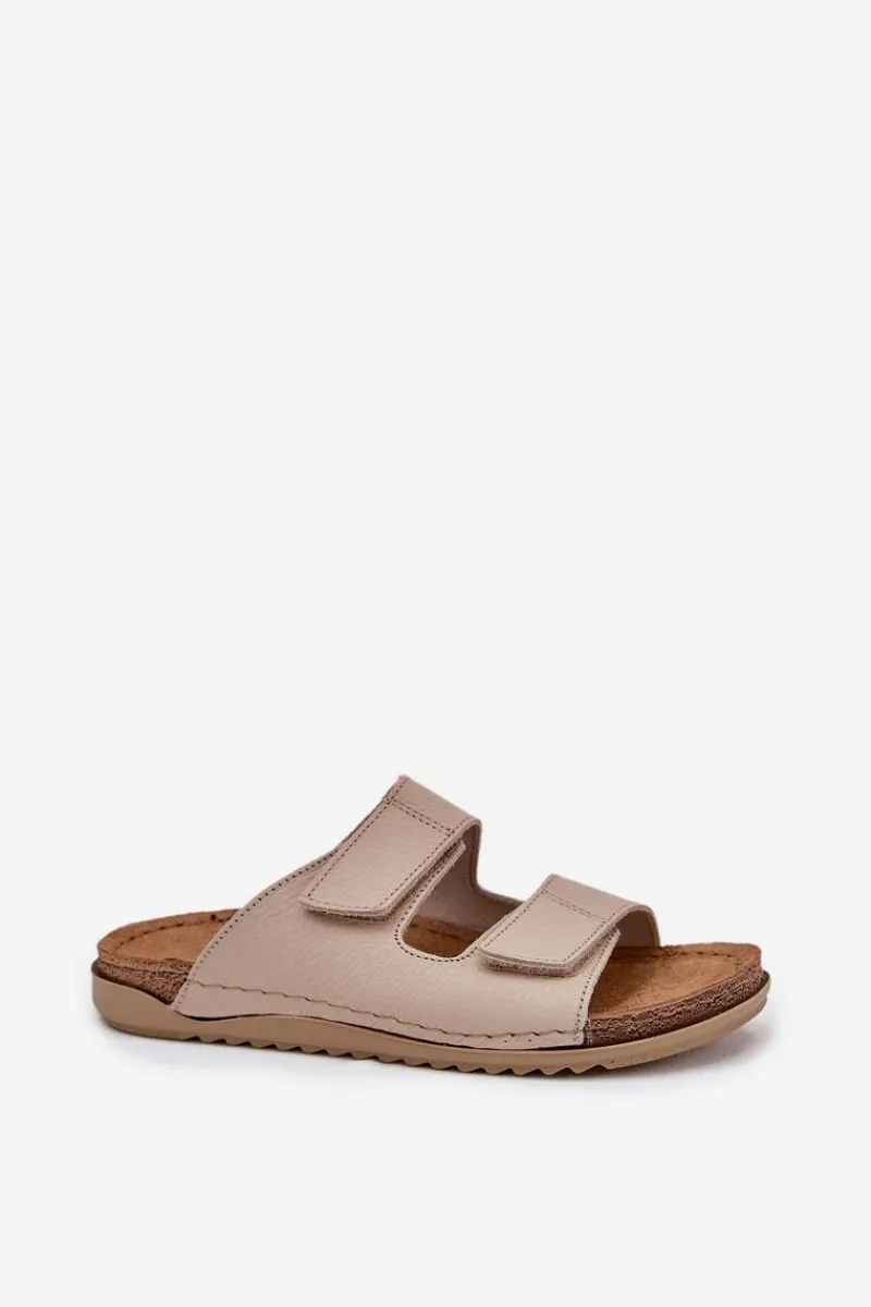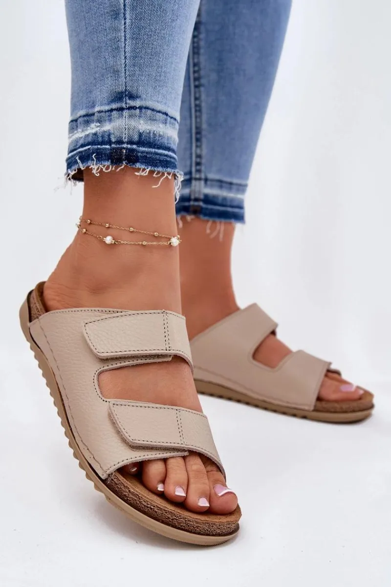 Klapki damskie od marki INBLU. Wykonane z naturalnej skóry. Model ten posiada paski z rzepami, co pozwala na doskonałe dopasowanie do tęgości stopy. Wnętrze wyłożone materiałem skóropodobnym dobrze przepuszczającym powietrze. Wkładka wewnętrzna „COMFORT ANATOMICO” profilowana, dostosowana do kształtu anatomicznego stopy, wykonana z miękkiej, naturalnej skóry. Spód wykonany z lekkiego i elastycznego tworzywa – poliuretanu – zapewnia sprężystość i bardzo dobre przenoszenie obciążeń na podłoże. Użyte materiały i zastosowana technologia zapewnia wysoki komfort użytkowania i wygodę. Przy wyborze rozmiaru prosimy sugerować się tabelą rozmiarów.