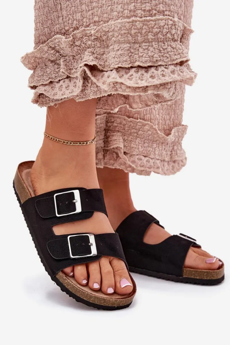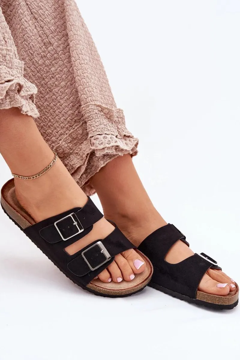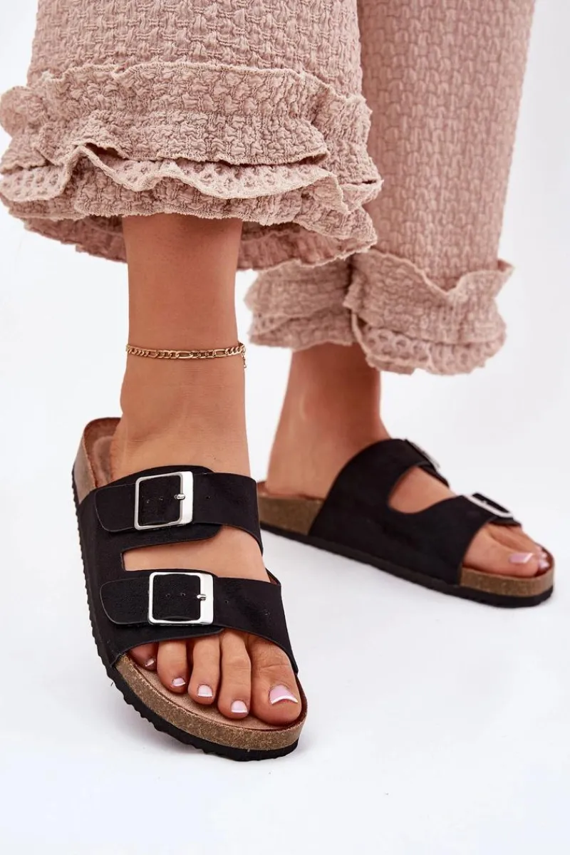 Klapki damskie z eko zamszu to połączenie stylu i wygody na co dzień. Wyposażone w dwa regulowane paski z klamrami, które umożliwiają idealne dopasowanie do stopy. Profilowana wkładka zapewnia komfort, a korkowa platforma dodaje lekkości i stabilności. Doskonałe na codzienne stylizacje, łączą funkcjonalność z modnym wyglądem. Przy wyborze rozmiaru prosimy sugerować się tabelą rozmiarów.