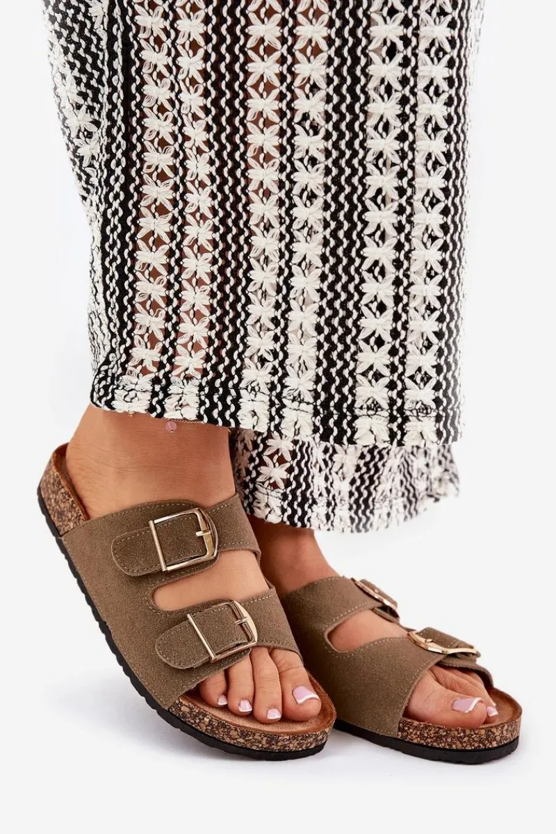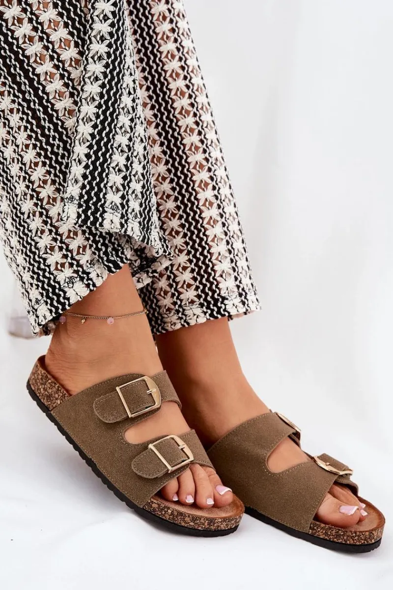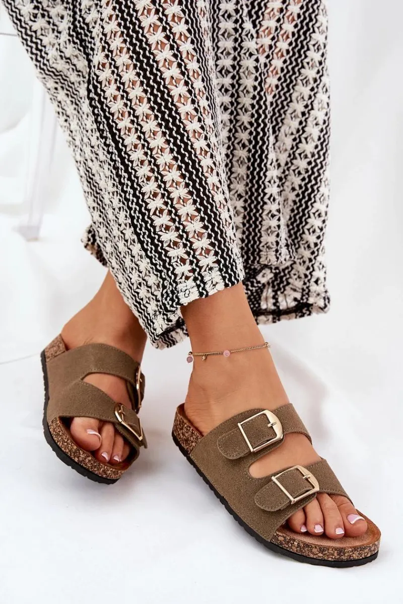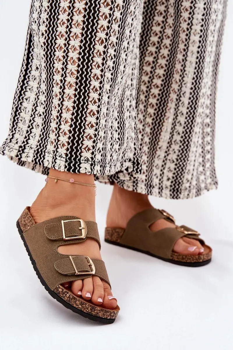 Stylowe klapki damskie na korkowej platformie, które łączą wygodę z modnym wyglądem. Z przodu znajdują się dwa paski z klamrami, które zapewniają idealne dopasowanie. Profilowana eko zamszowa wkładka gwarantuje komfort przez cały dzień. Te klapki będą doskonałym wyborem na letnie dni, świetnie komponując się z sukienkami, spódnicami i spodniami. Przy wyborze rozmiaru prosimy sugerować się tabelą rozmiarów.