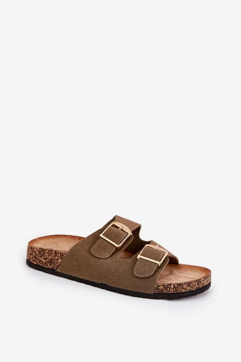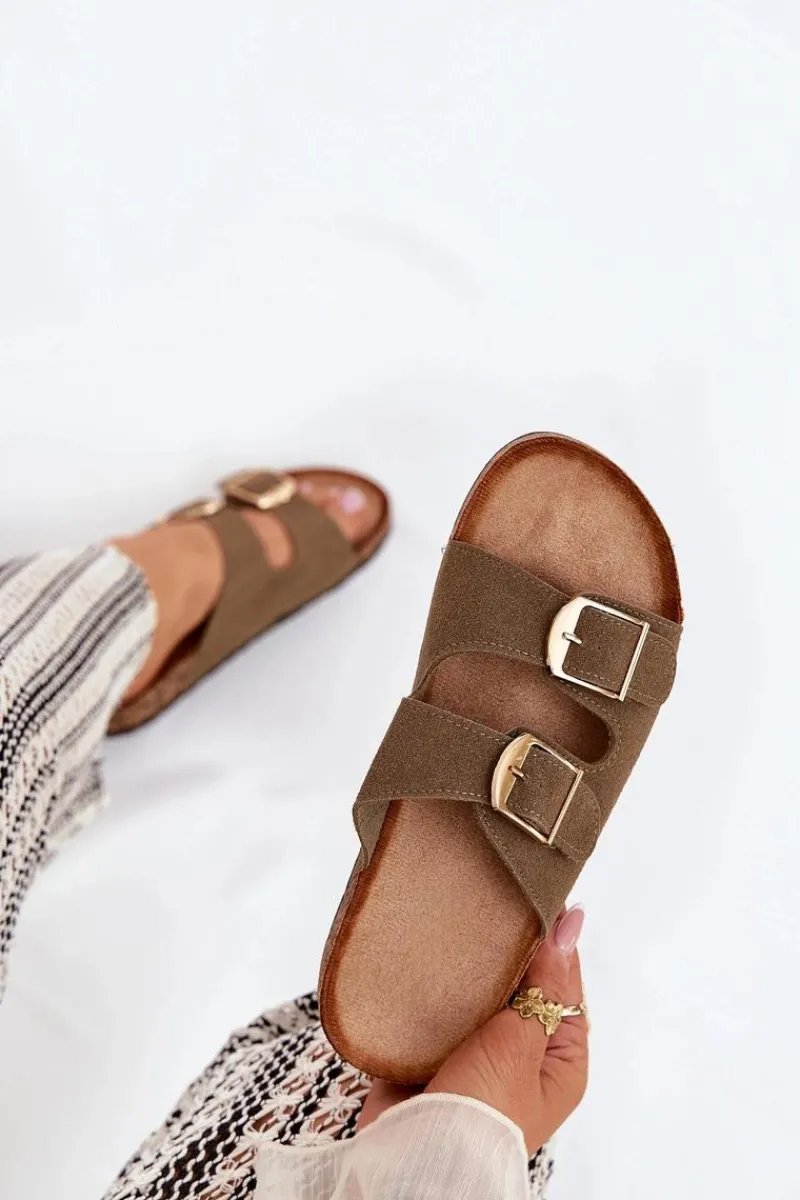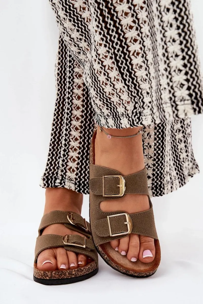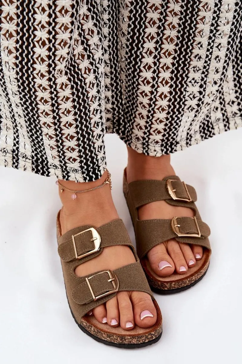 Stylowe klapki damskie na korkowej platformie, które łączą wygodę z modnym wyglądem. Z przodu znajdują się dwa paski z klamrami, które zapewniają idealne dopasowanie. Profilowana eko zamszowa wkładka gwarantuje komfort przez cały dzień. Te klapki będą doskonałym wyborem na letnie dni, świetnie komponując się z sukienkami, spódnicami i spodniami. Przy wyborze rozmiaru prosimy sugerować się tabelą rozmiarów.