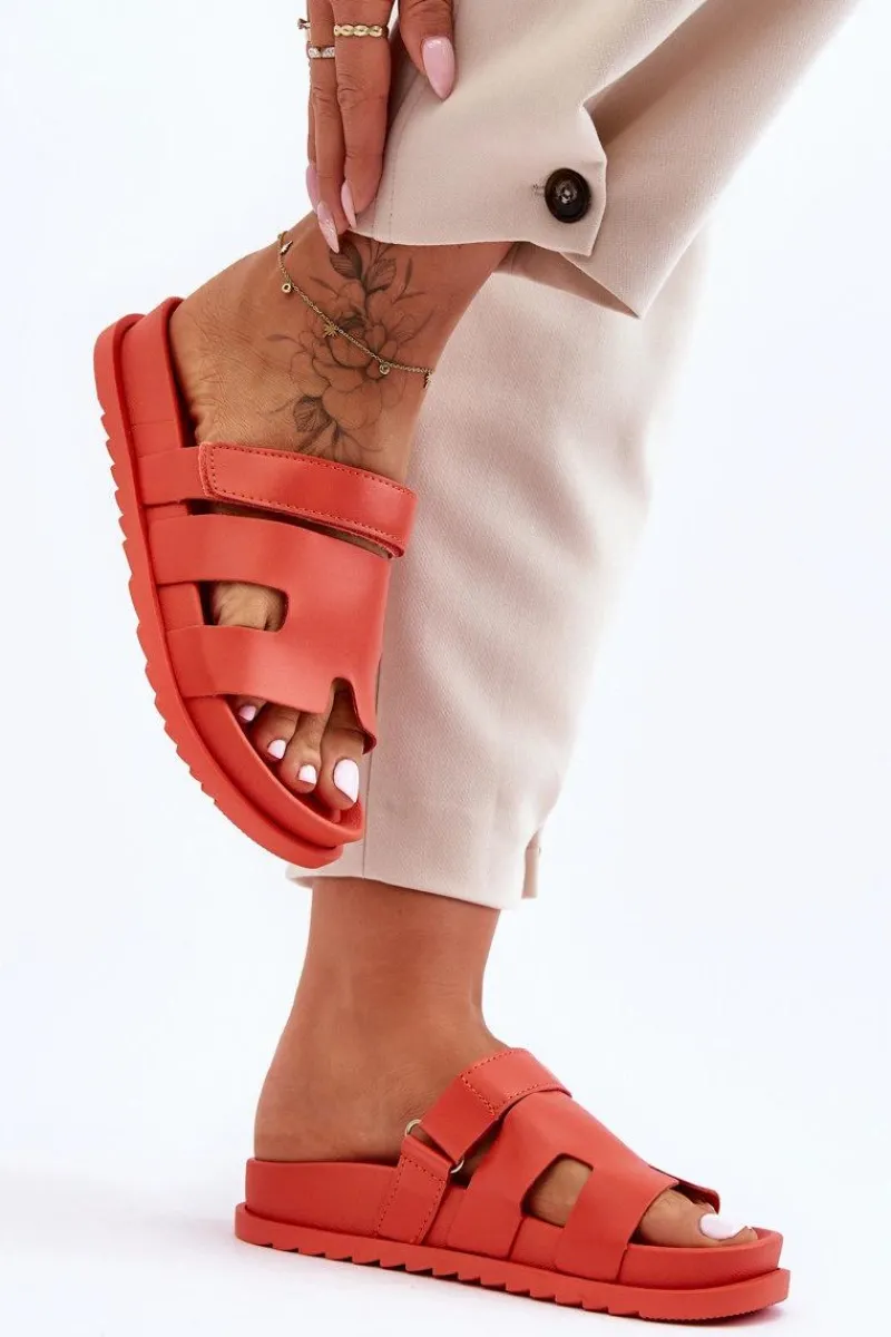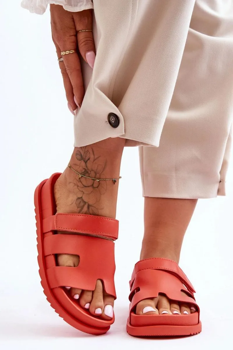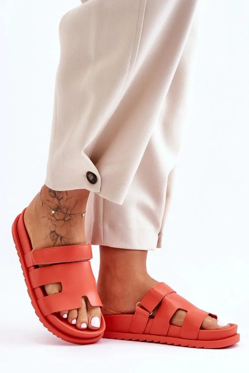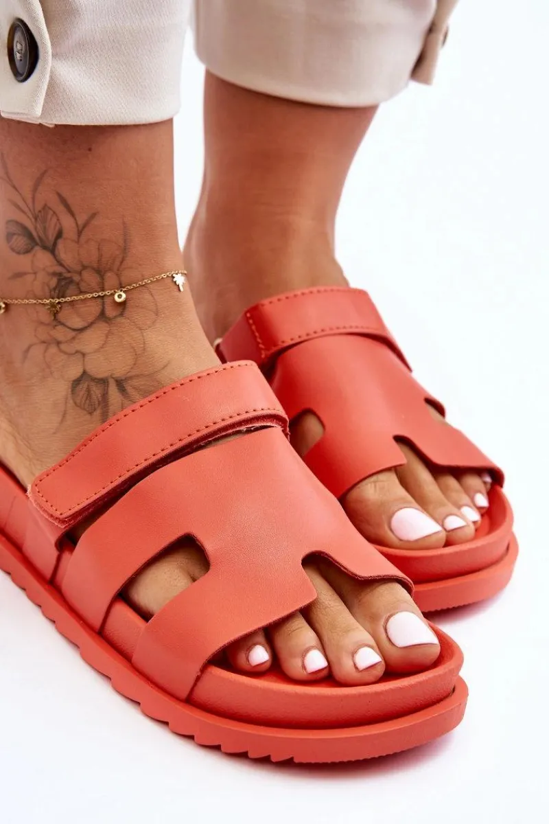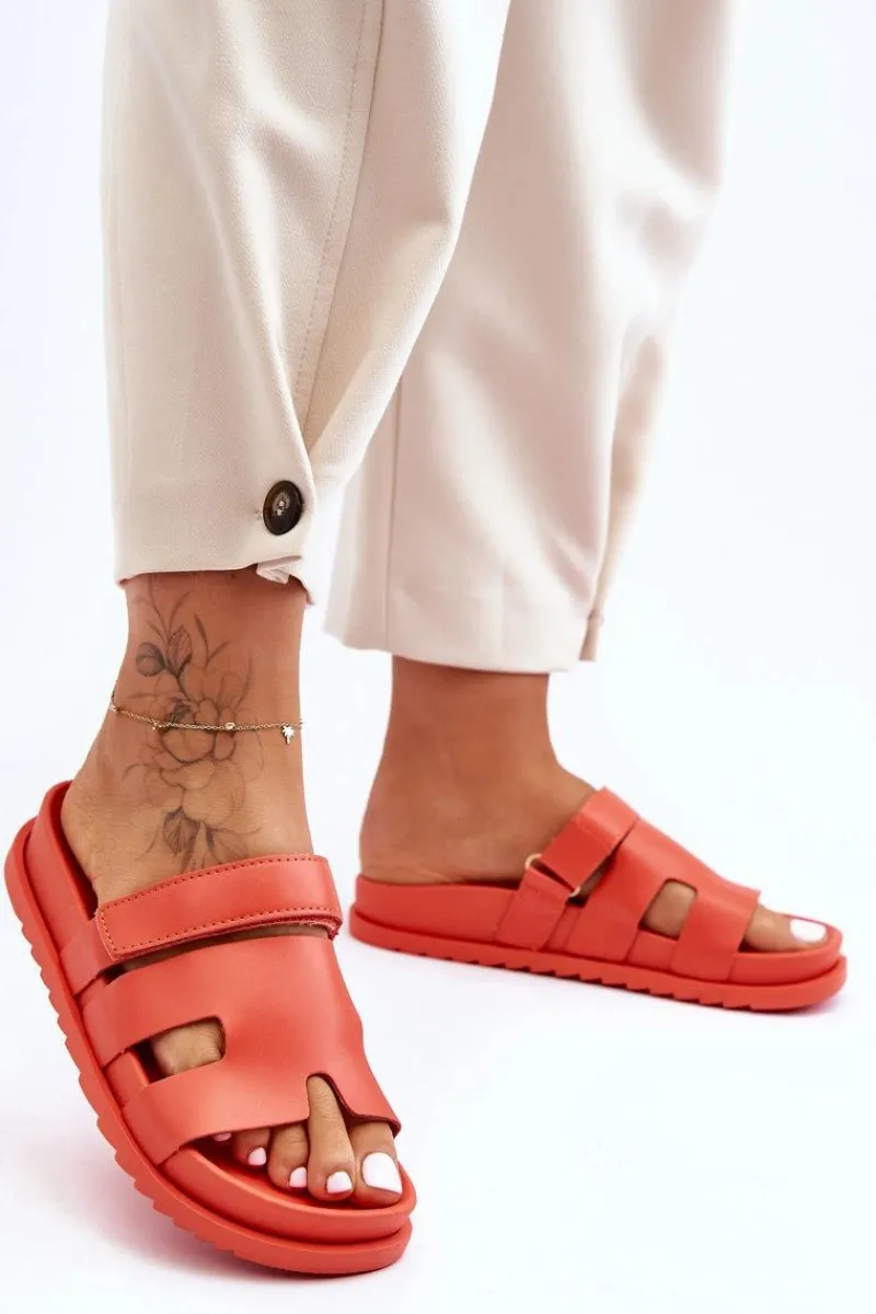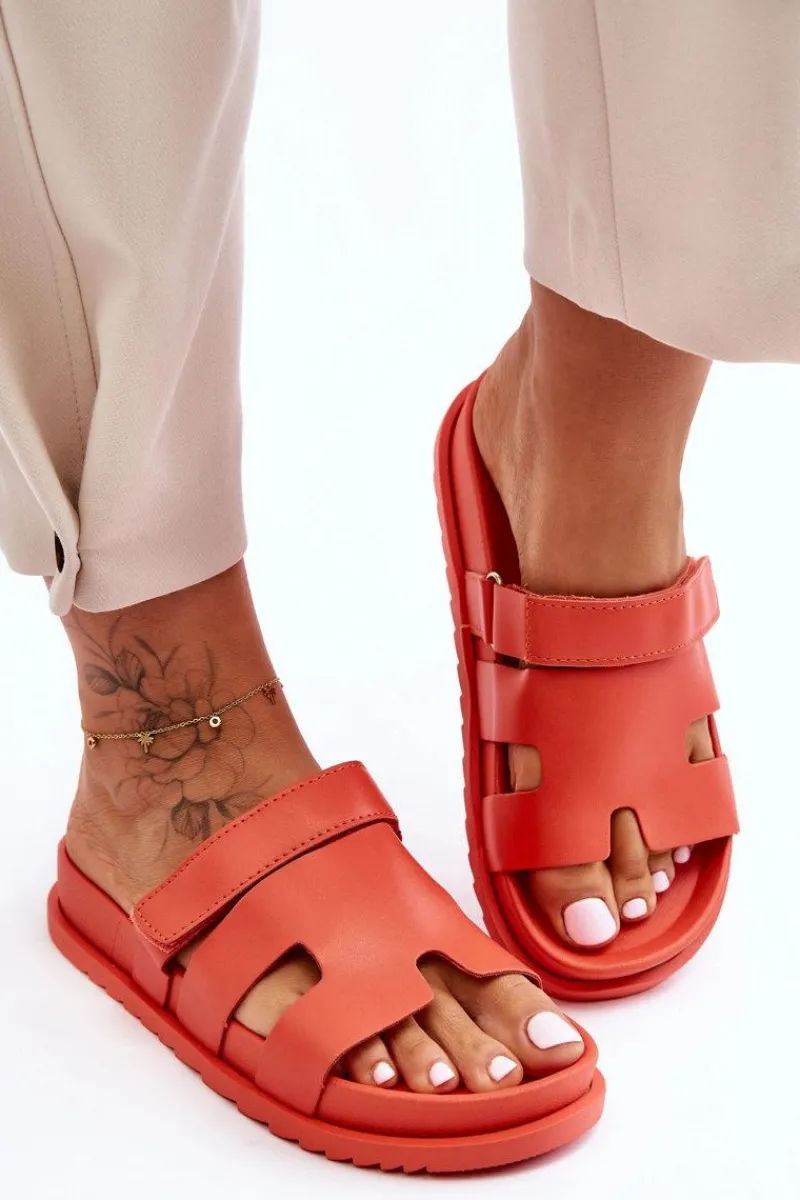 Klasyczne klapki damskie na lekkiej platformie zostały wzbogacone zapięciem na rzep, dzięki któremu obuwie można dopasować do tęgości nogi. Dobrze wyprofilowana wkładka zapewni komfort podczas użytkowania. Klapki te o ciekawym fasonie z pewnością sprawdzą się w wielu stylizacjach! Zostały wykonane z eko skóry. Przy wyborze rozmiaru prosimy sugerować się tabelą rozmiarów.