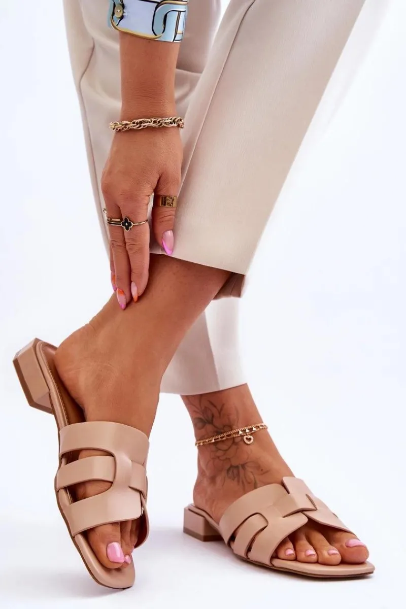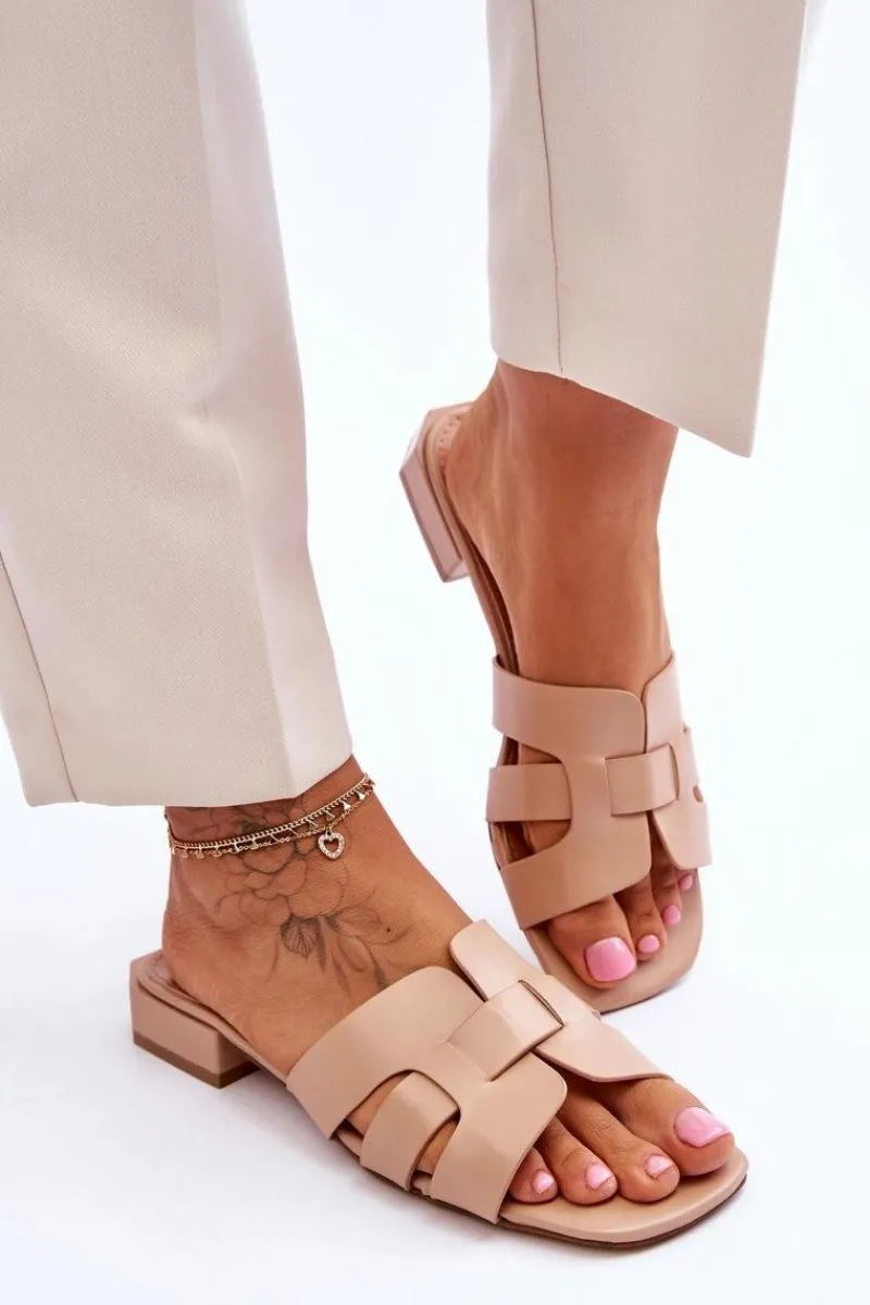 Klasyczne klapki damskie zostały wykonane z ekologicznej skóry. Osadzone na modnym, płaskim obcasie. Klapki posiadają wycięcia w cholewce. Nosek jest odkryty, kwadratowy. Wygodna wkładka z eko skóry zapewni komfortowe użytkowanie obuwia. Idealne na co dzień, na spacer, do pracy czy do miasta! Przy wyborze rozmiaru prosimy sugerować się tabelą rozmiarów.