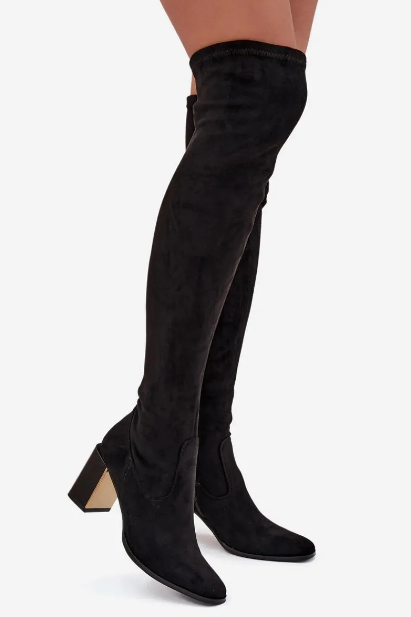 Kozaki damskie z cholewką sięgającą za kolano to elegancka propozycja na chłodniejsze dni. Wykonane z eko zamszu, osadzone na obcasie typu słupek, który zyskuje wyjątkowy efekt dzięki lustrzanemu elementowi. Model wsuwany z dodatkowym suwakiem ułatwia zakładanie i zdejmowanie. Wnętrze ocieplone na wysokości stopy gwarantuje ciepło, a zaokrąglony krój sprawia, że kozaki będą doskonałym wyborem do sukienek mini i spódniczek. Idealne na jesień i zimę, te kozaki będą świetnym dopełnieniem Twoich zimowych stylizacji! Przy wyborze rozmiaru prosimy sugerować się tabelą rozmiarów.