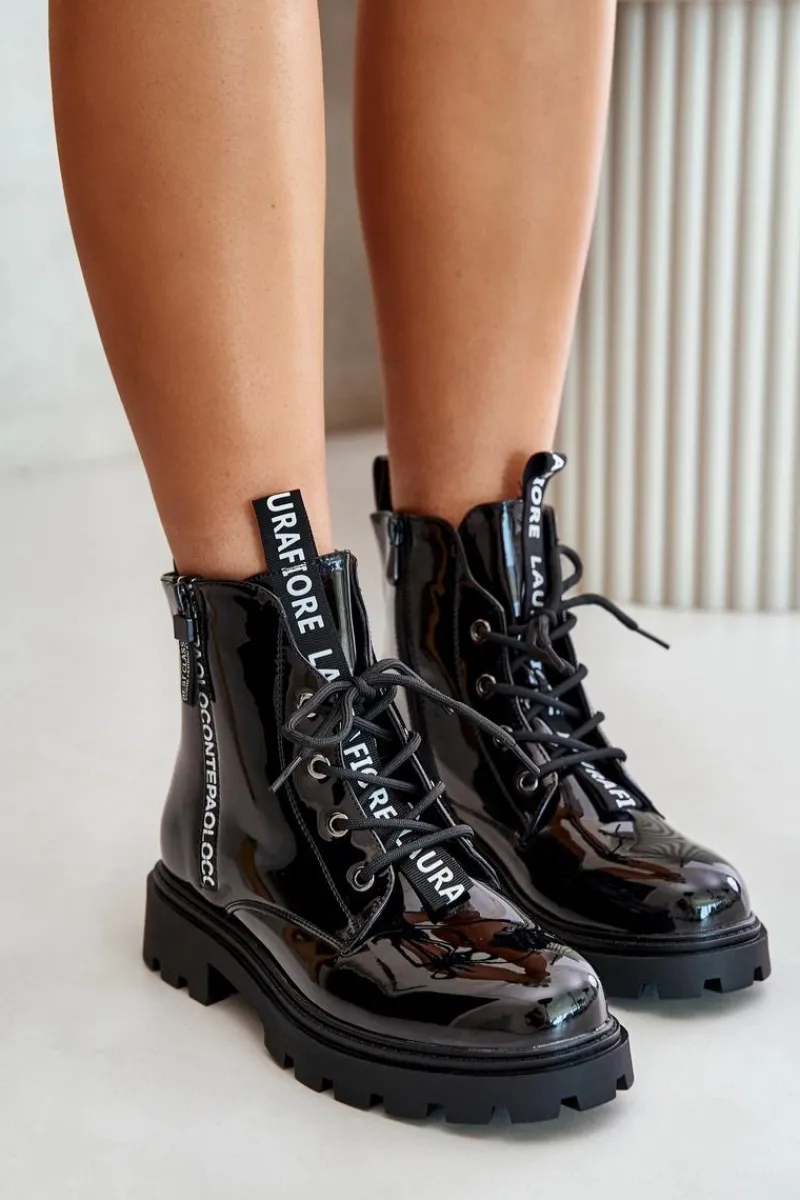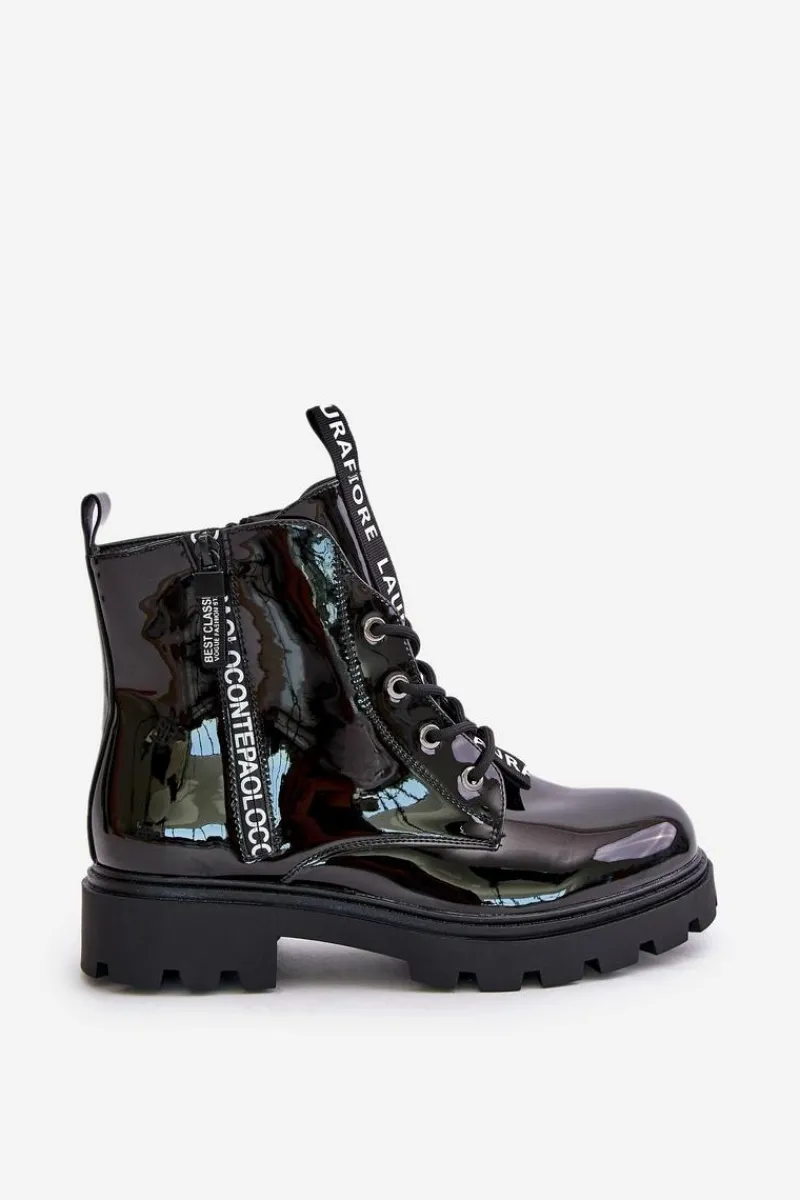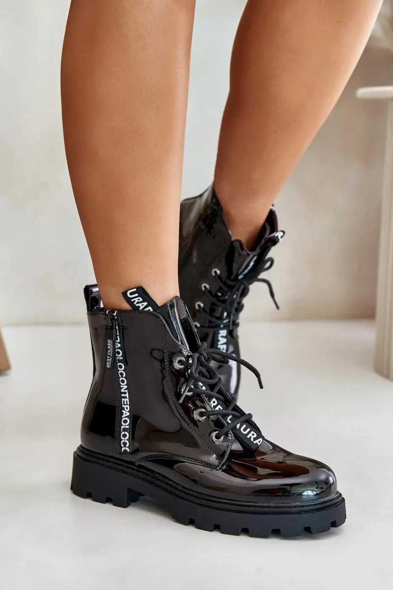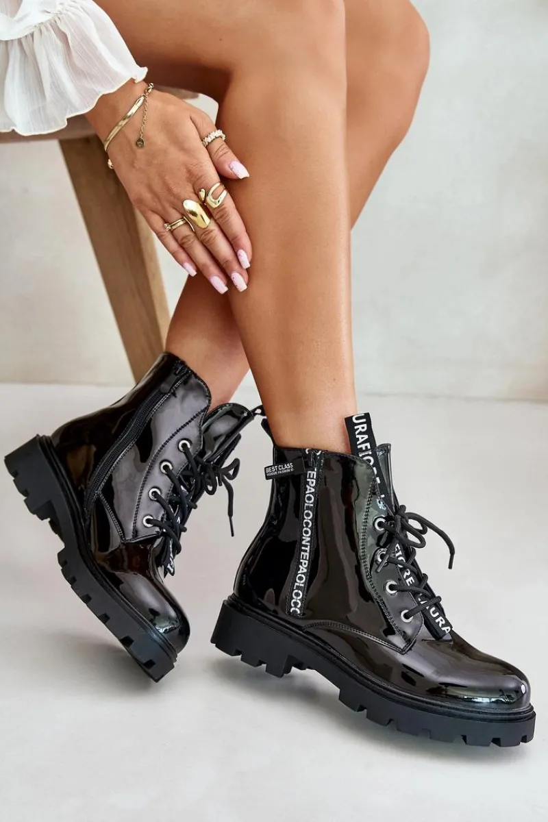 Stylowe botki damskie z ociepleniem, idealne na chłodne dni. Model zapinany na zamek oraz dodatkowo sznurowany, co zapewnia idealne dopasowanie. Cholewka ozdobiona modnymi napisami, dodającymi oryginalnego charakteru. Świetny wybór dla kobiet ceniących wygodę i modny wygląd. Przy wyborze rozmiaru prosimy sugerować się tabelą rozmiarów.