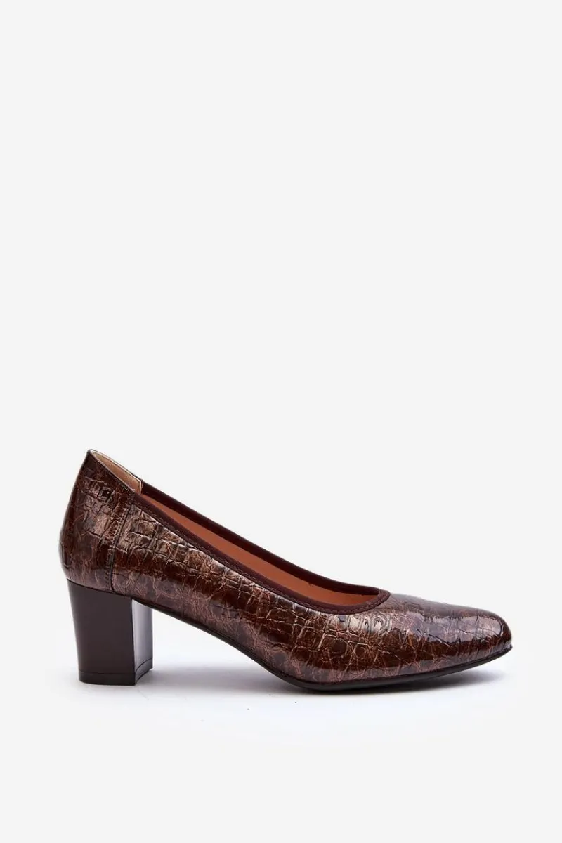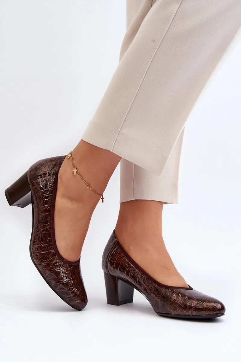 Piękne czółenka osadzone na obcasie w postaci niskiego słupka. Miękka i komfortowa w użytkowaniu wkładka została wykonana ze skóry naturalnej. Noski w migdał. Model z ozdobnym tłoczeniem. Klasyczne czółenka powinny znaleźć się w Twojej garderobie! Na pewno wykorzystasz je w wielu sytuacjach. Przy wyborze rozmiaru prosimy sugerować się tabelą rozmiarów.