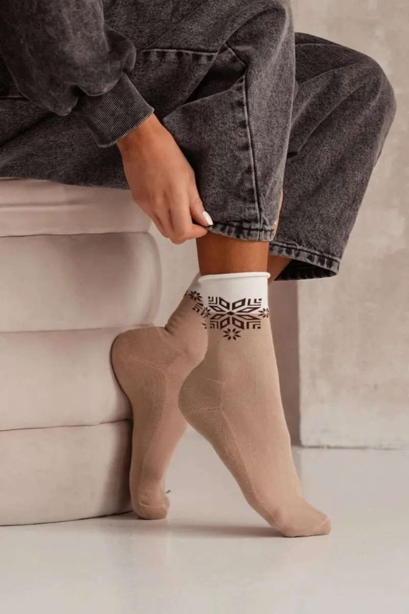 Model damskich skarpetek termoaktywnych ze wzmocnioną podeszwą frotte i uroczym wzorem. Jeśli uprawiasz takie dyscypliny sportowe, jak jak tenis, bieganie czy nordic walking, z pewnością sprawdzą Ci się ze względu na ich dużą wytrzymałość. Jednakże będą odpowiednie również do innych dyscyplin zapewniając pełen komfort noszenia.