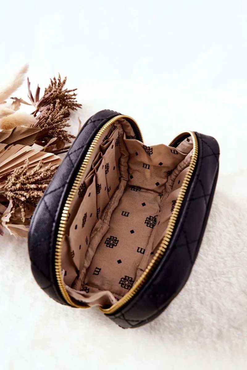 Kosmetyczka została wykonana z pikowanej eko skóry. Na przodzie posiada emblemat z logo marki Monnari. Jest zapinana na zamek błyskawiczny. Kosmetyczka w środku ma materiałową podszewkę oraz kilka otwartych kieszeni. Pomieści małe kosmetyki np.: tusz do rzęs, pomadki czy fluid. Z zewnątrz posiada jedną kieszeń zapinaną na magnes.