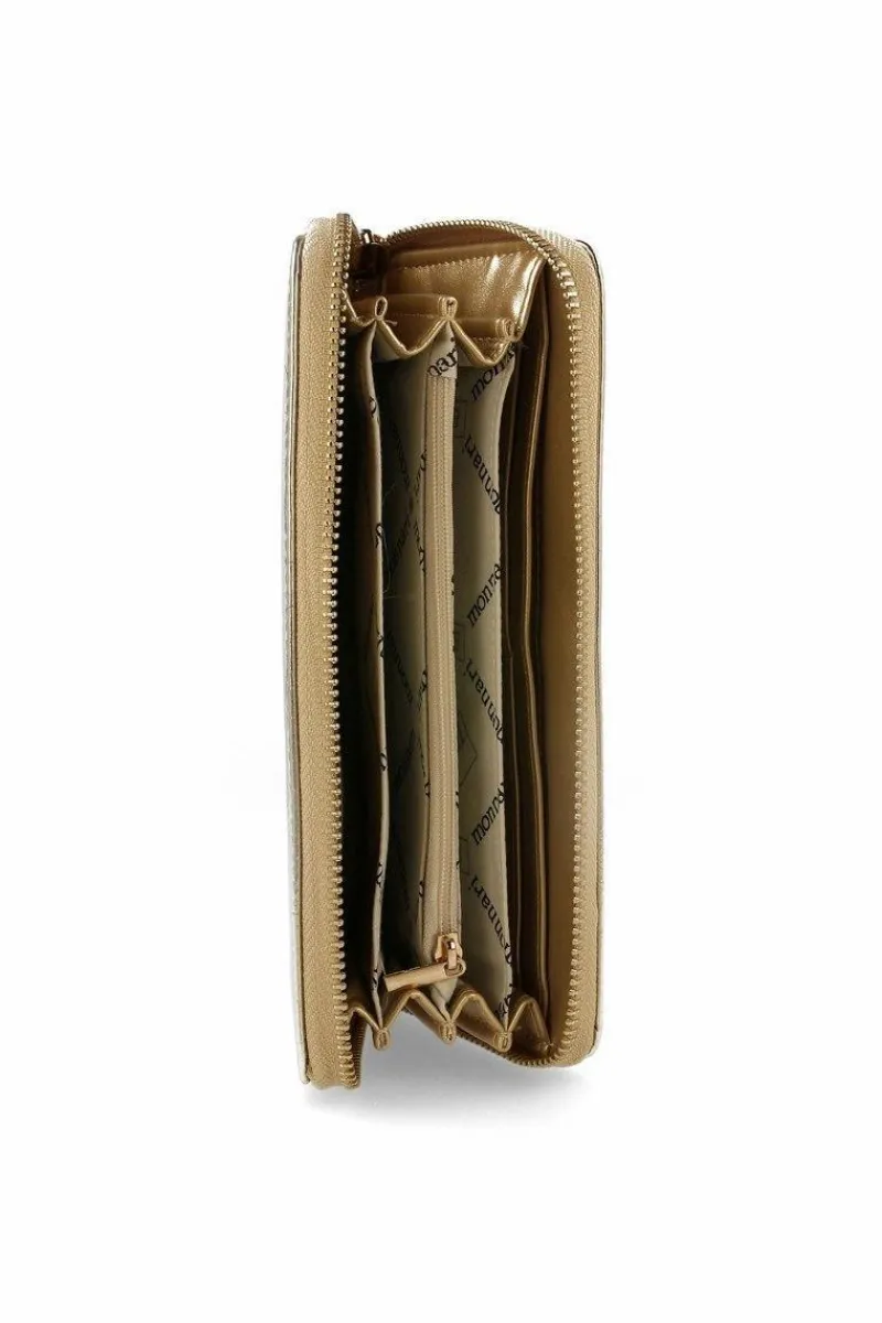 Elegancki damski portfel. Klasyczny wzór wykonany z lakierowanej skóry ekologicznej. Z przodu znajduje się złote logo MONNARI. Portfel posiada cztery główne przegrody, dwie kieszenie na banknoty oraz jedną kieszeń zapinaną na suwak. W środku beżowa wyściółkę z napisami MONNARI .
