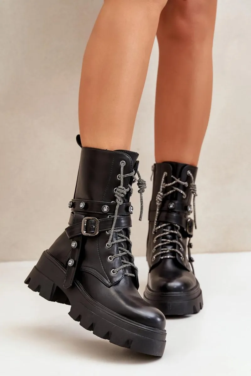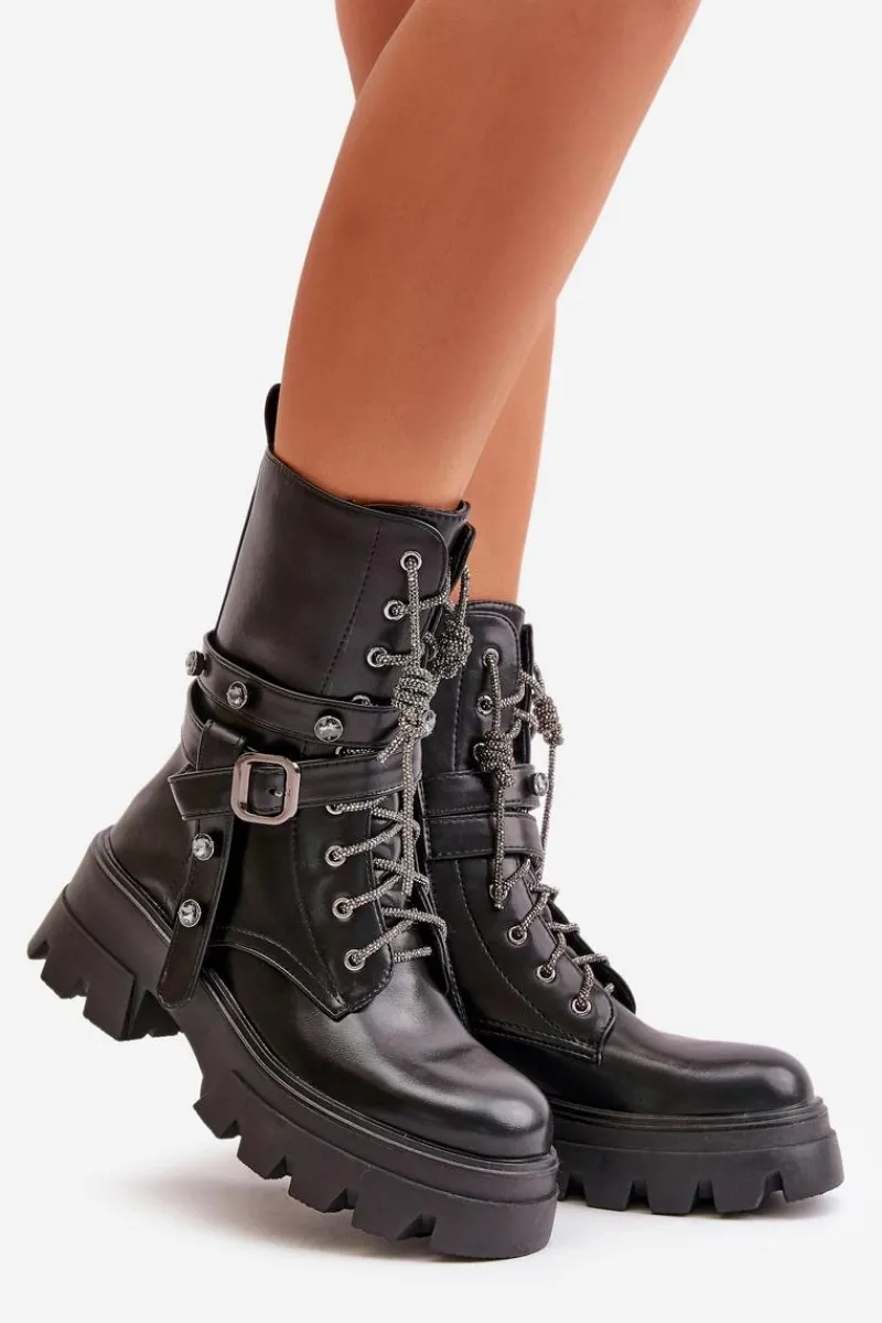 Damskie botki wykonane z ekologicznej skóry. Osadzone na płaskim, masywnym obcasie i platformie. Noski zaokrąglone. Środek ocieplony kocem obuwniczym. Zapinane na zamek oraz dodatkowo posiadają ozdobne sznurowanie. Na cholewce dwa paski z klamrą. Model ten doskonale uzupełni Twoje outfity w chłodniejsze dni! Przy wyborze rozmiaru prosimy sugerować się tabelą rozmiarów.