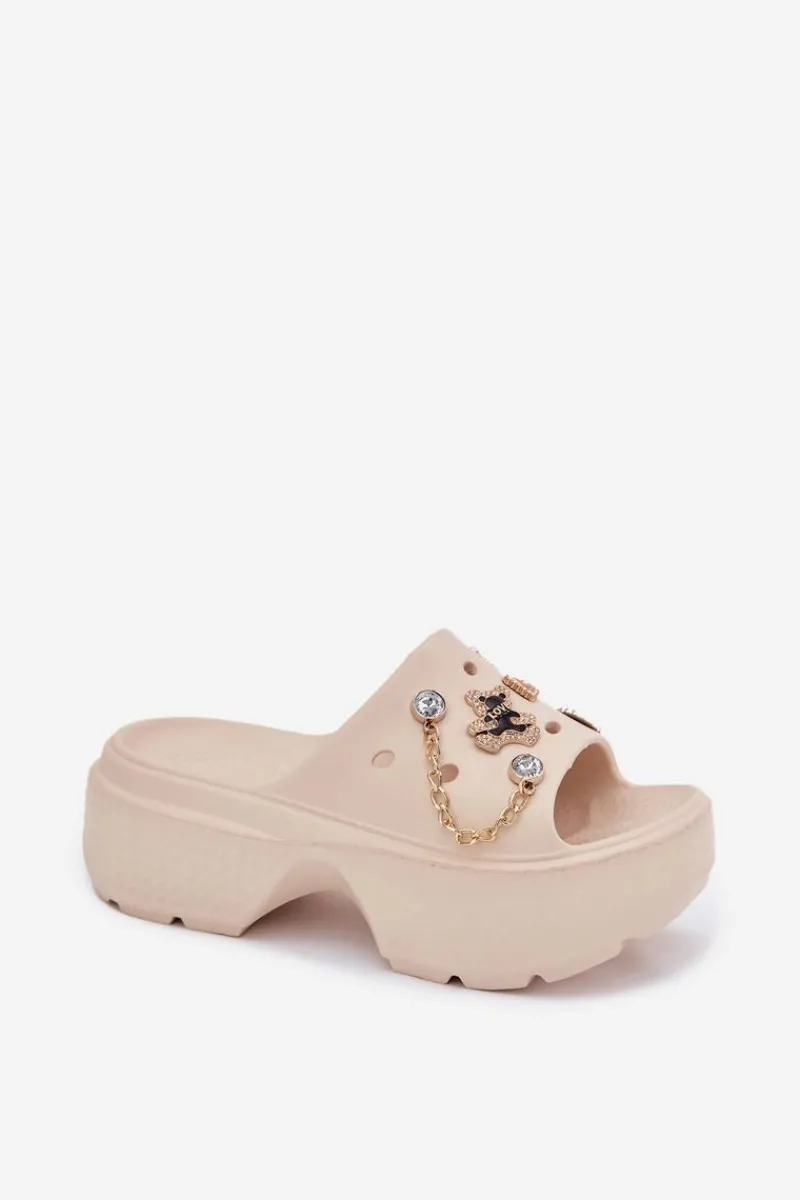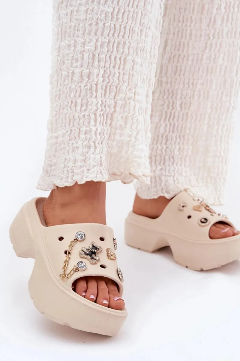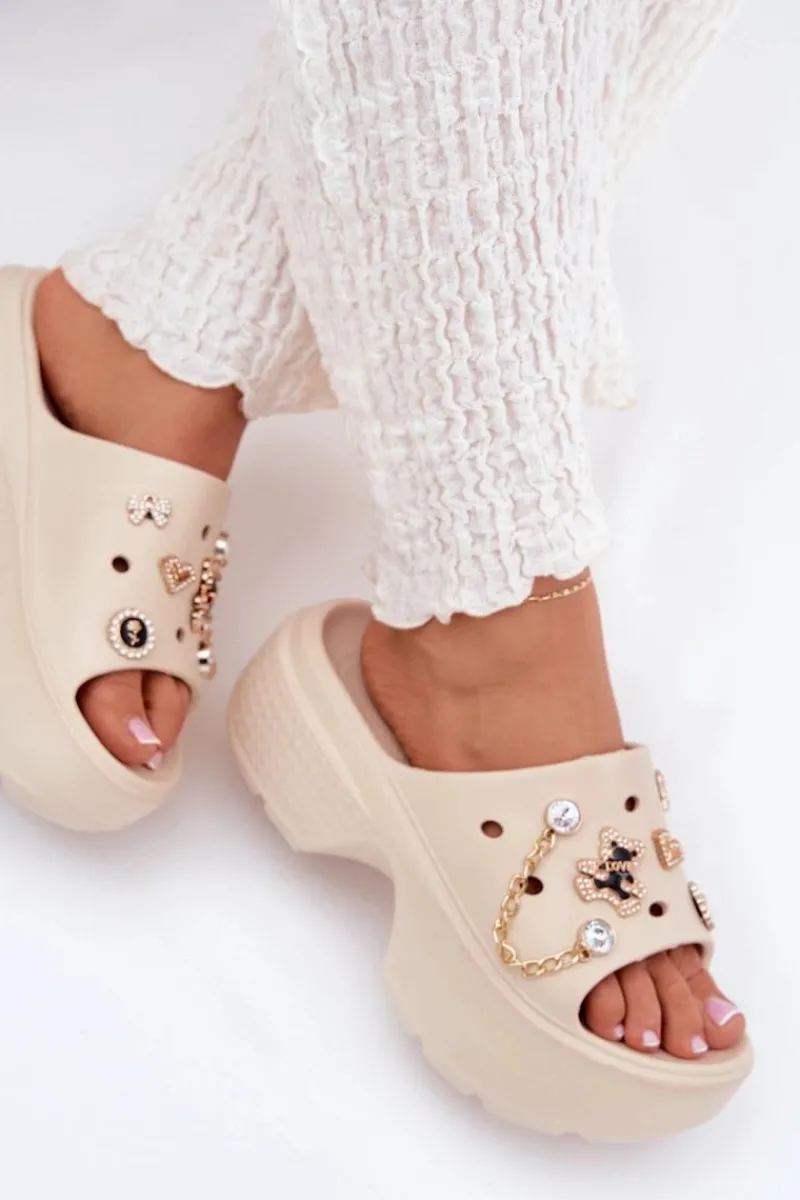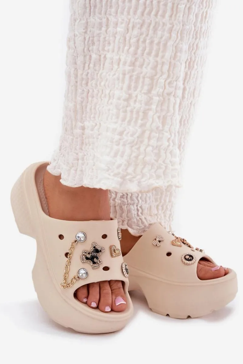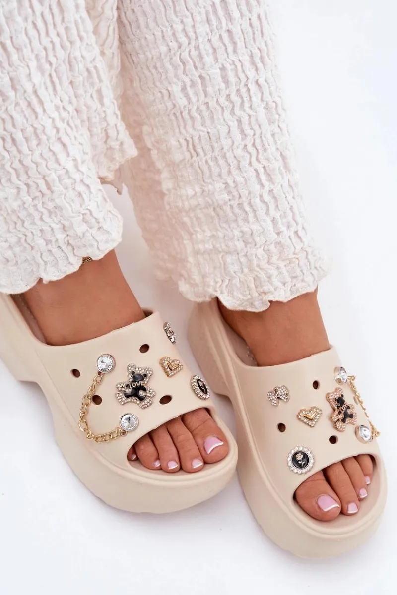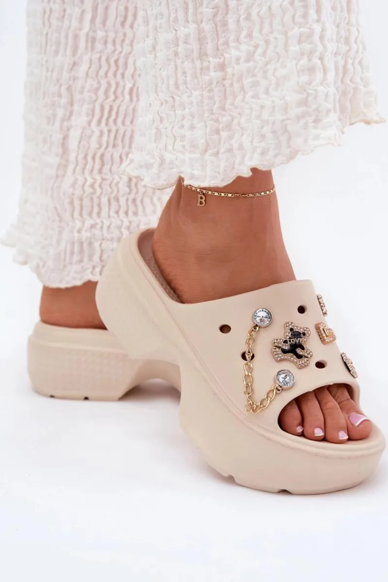 Klapki z piankowego tworzywa na masywnej platformie to świetny wybór na ciepłe dni. Złote przypinki na pasku przyciągają wzrok, nadając im stylowego charakteru. Idealne na co dzień, łączą komfort z modnym wyglądem. Przy wyborze rozmiaru prosimy sugerować się tabelą rozmiarów.