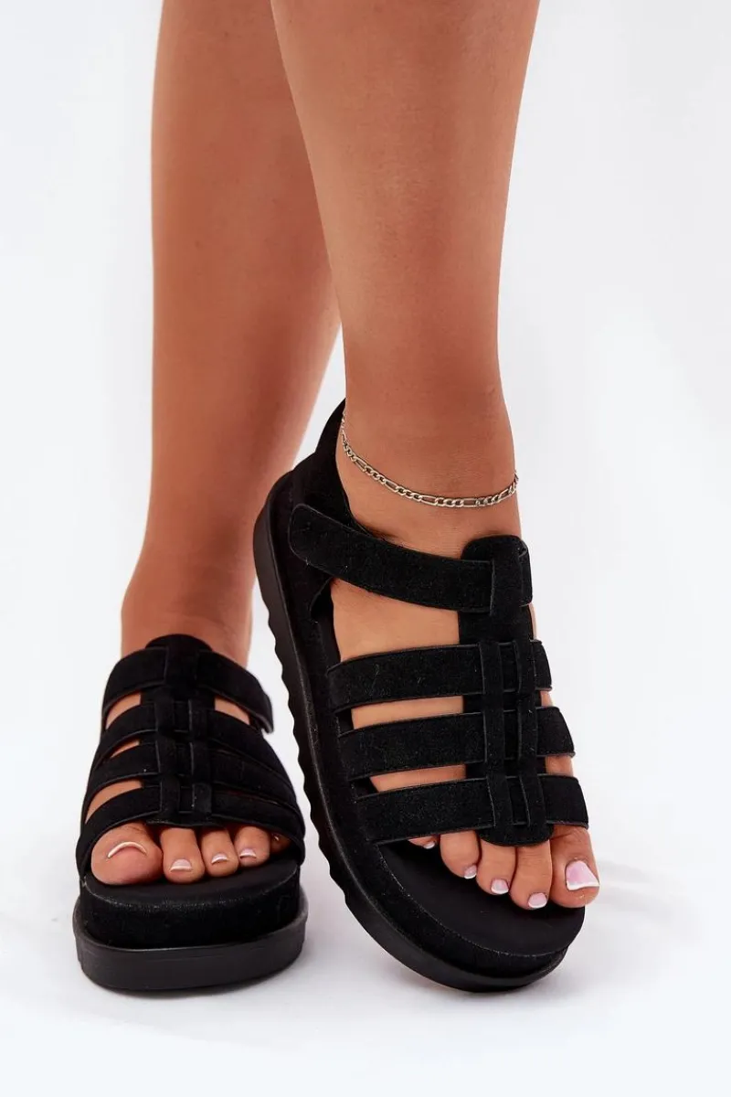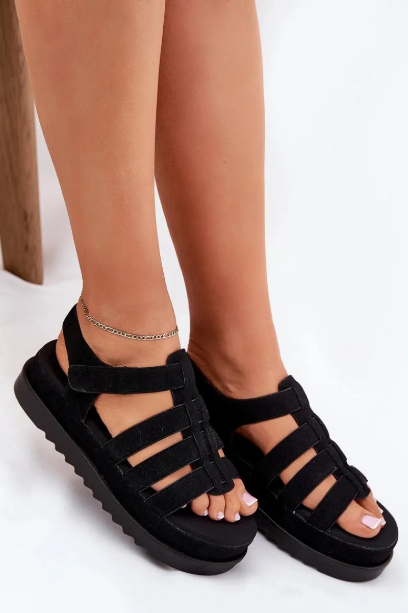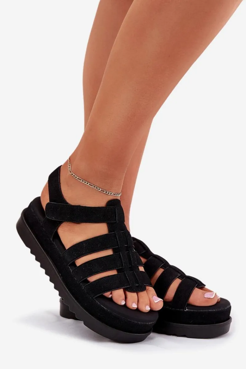 Damskie sandały z eko zamszu to idealna propozycja na ciepłe dni. Osadzone na platformie, zapewniają komfort i lekkość podczas chodzenia. Model zapinany na rzep umożliwia łatwe dopasowanie, a paski z przodu dodają im stylowego wyglądu. Te sandały doskonale sprawdzą się w letnich stylizacjach, łącząc funkcjonalność z modnym wyglądem. Przy wyborze rozmiaru prosimy sugerować się tabelą rozmiarów.