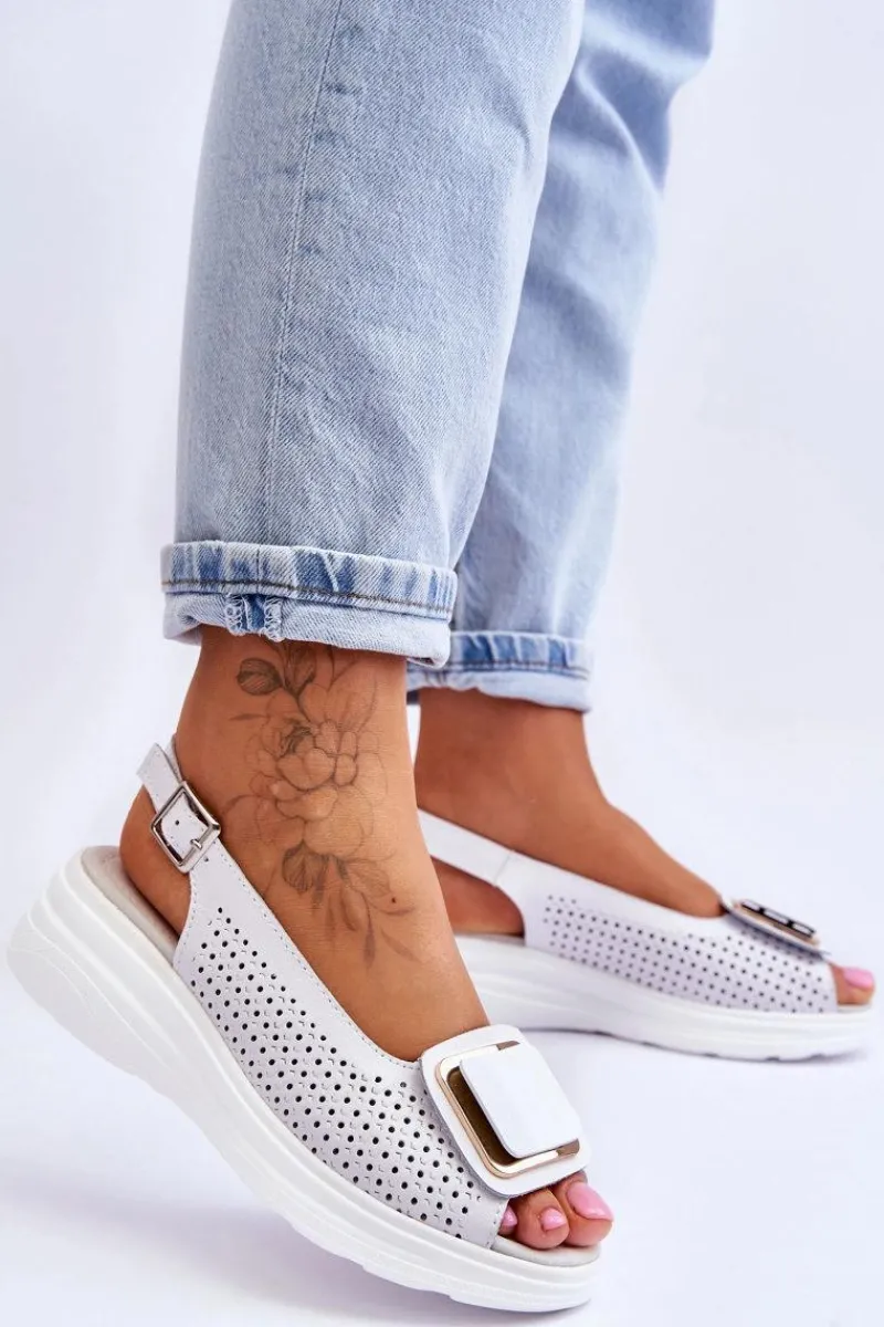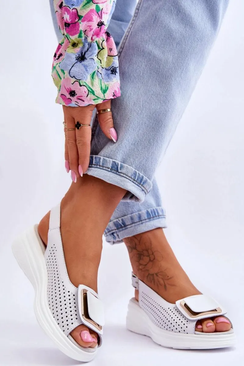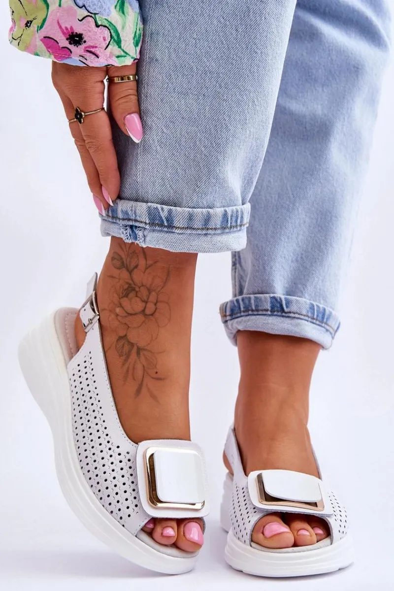 Niezwykle wygodne sandały damskie zostały wykonane z wysokiej jakości naturalnej skóry. Model ten posiada zapinanie na regulowany pasek ze sprzączką. Sandałki są przewiewne, dzięki ażurowemu wzorkowi. Miękka wkładka z naturalnej skóry zapewni komfortowe użytkowanie. Sandałki osadzono na koturnie i platformie. Na przodzie znajduje się ozdobny element z tworzywa. Przy wyborze rozmiaru prosimy sugerować się tabelą rozmiarów.