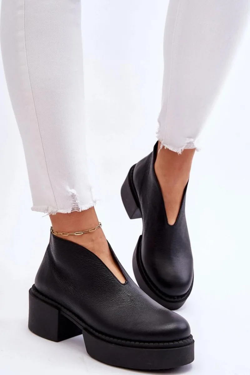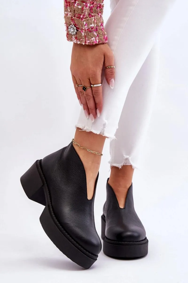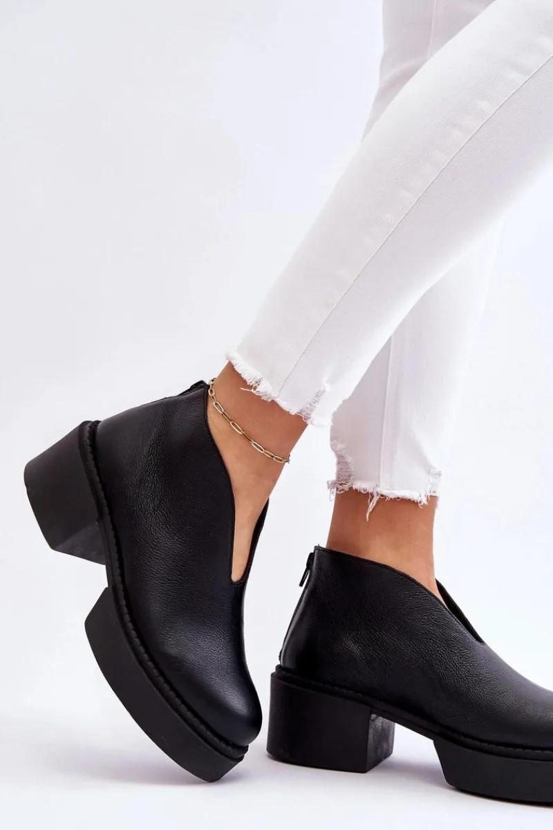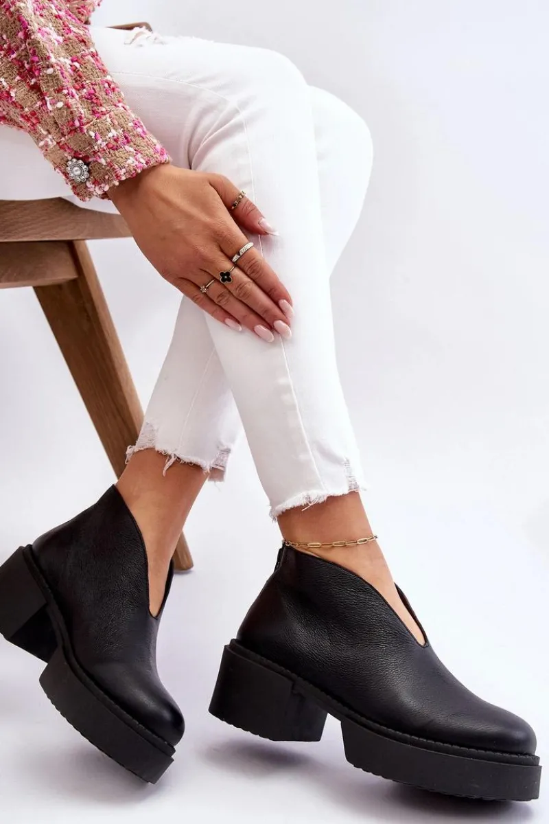 Modne botki damskie na masywnym obcasie i platformie zostały wykonane z naturalnej skóry. Model ten jest zapinany na suwak z tyłu cholewki. Dodatkowo zapiętek w tych botkach jest usztywniany. Miękka i wygodna wkładka została wykonana z naturalnej skóry. Te botki powinny znaleźć się w twojej szafie! Przy wyborze rozmiaru prosimy sugerować się tabelą rozmiarów.