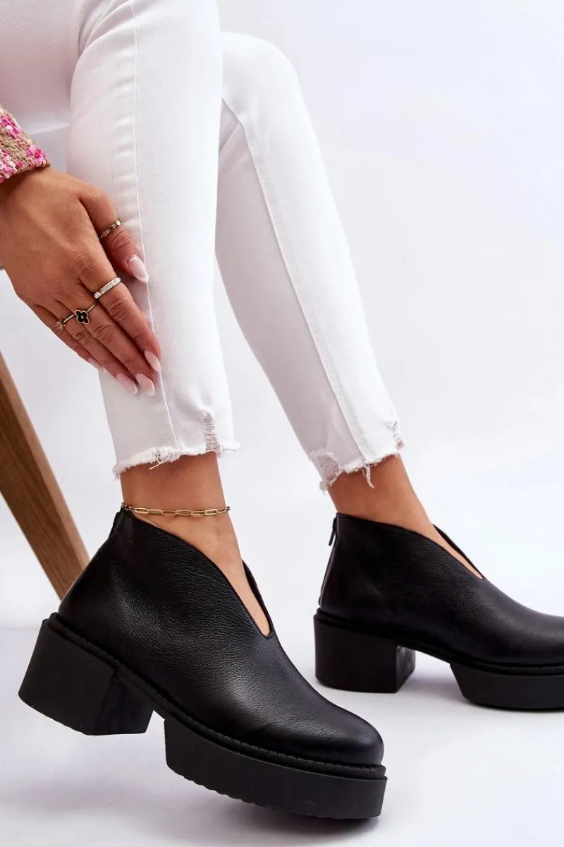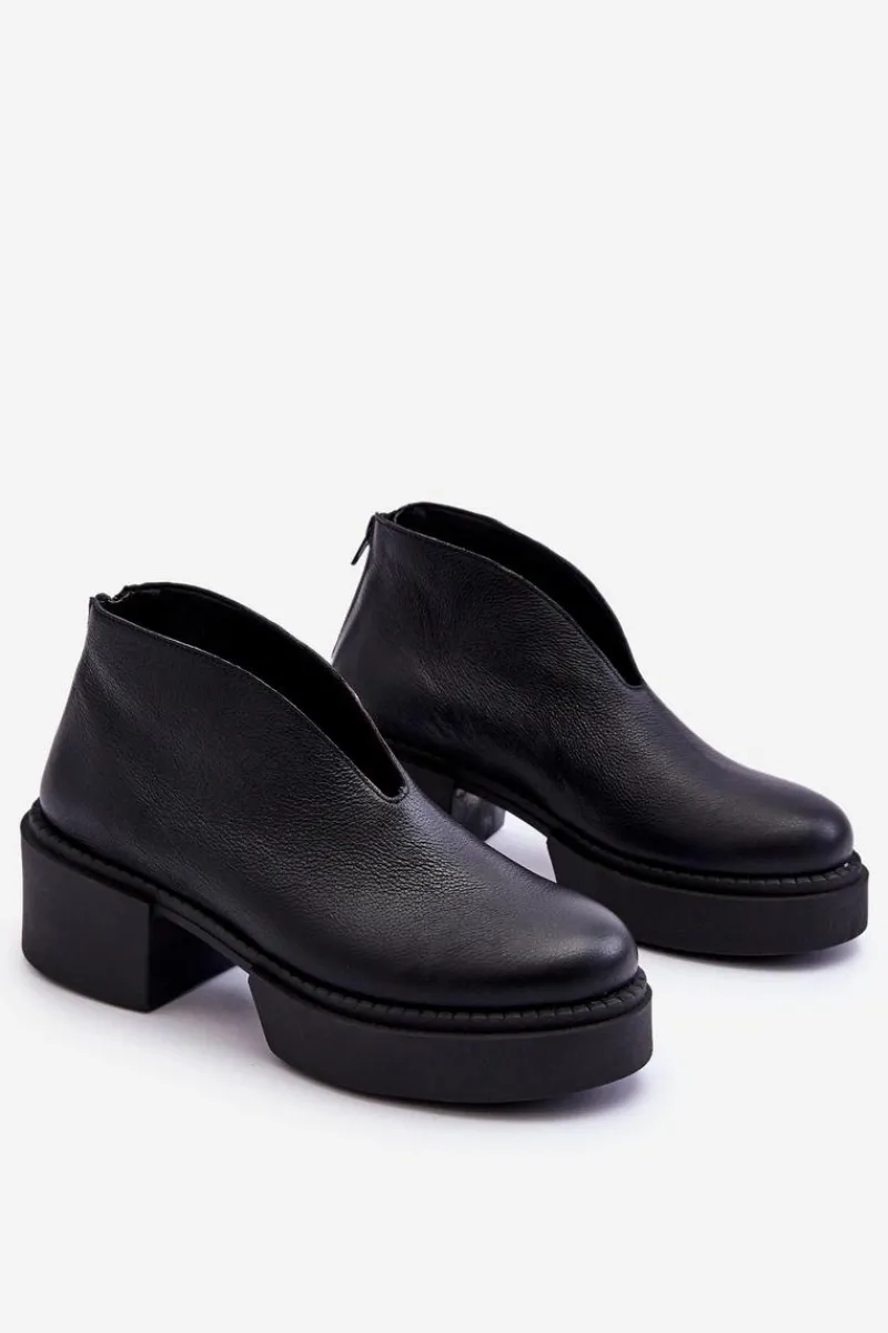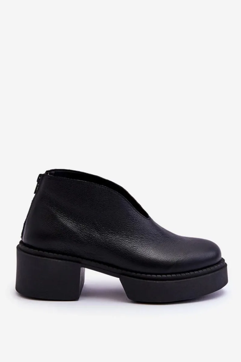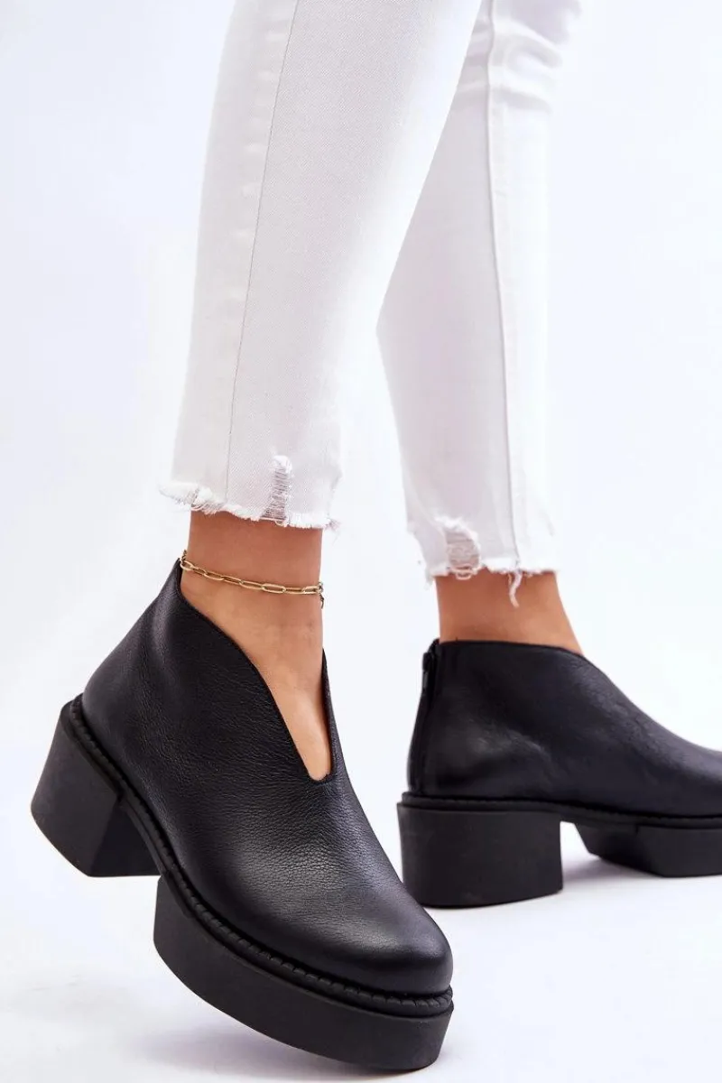 Modne botki damskie na masywnym obcasie i platformie zostały wykonane z naturalnej skóry. Model ten jest zapinany na suwak z tyłu cholewki. Dodatkowo zapiętek w tych botkach jest usztywniany. Miękka i wygodna wkładka została wykonana z naturalnej skóry. Te botki powinny znaleźć się w twojej szafie! Przy wyborze rozmiaru prosimy sugerować się tabelą rozmiarów.