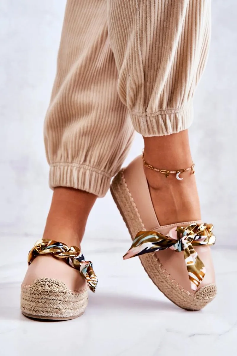 Espadryle zostały wykonane z eko skóry. Posiadają plecionkę na zaokrąglonym nosku. Na przodzie ozdobny łańcuch z efektownym paskiem z tkaniny. Platforma przyozdobiona jutowym warkoczem. Podeszwa wykonana z gumowego tworzywa, antypoślizgowa. Miękka wkładka wykonana z materiału jest bardzo wygodna w użytkowaniu. Wygodna, płaska podeszwa zapewni stabilność na każdym kroku. Świetny model, idealny do wielu stylizacji. Założysz je zarówno do casualowych stylizacji, jak i eleganckich. Przy wyborze rozmiaru prosimy sugerować się tabelą rozmiarów.