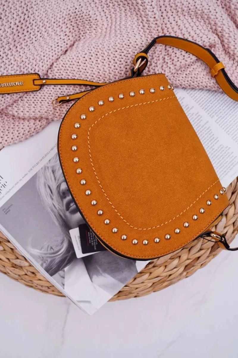 Torebka damska na co dzień małej wielkości z ozdobnymi nitami wokół klapy (23, 20, 10cm), zawieszona na regulowanym pasku, jednokomorowa, z jasną podszewką w środku. Polecamy ten model do codziennych stylizacji.