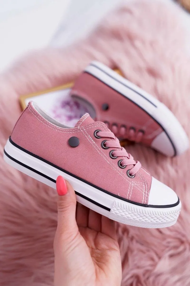 Klasyczne trampki wykonane z materiału tekstylnego. Ponadczasowy wzór w wersji młodzieżowej. Zastosowanie gumowego noska sprawia że buciki pięknie wyglądają oraz są bardziej odporne na uszkodzenia. Zakładanie i dopasowanie do stopy ułatwią elastyczne gumki. Przy wyborze rozmiaru prosimy sugerować się tabelą rozmiarów dostępną po najechaniu bądź kliknięciu na dany rozmiar.