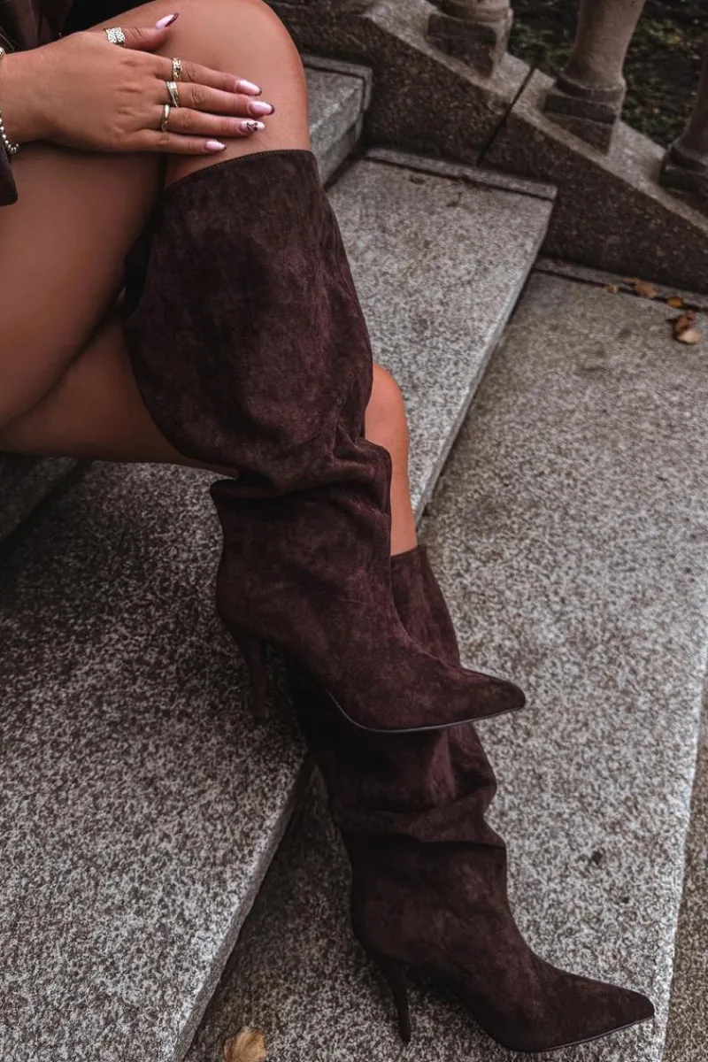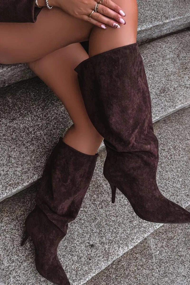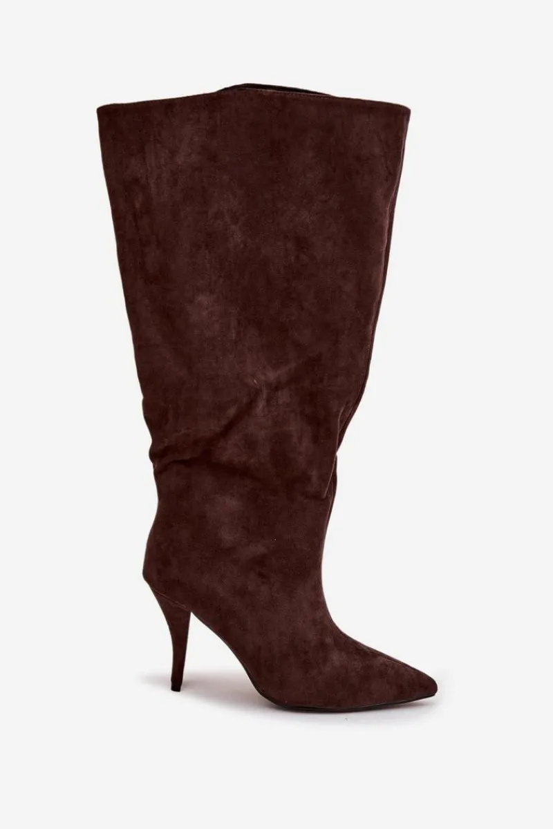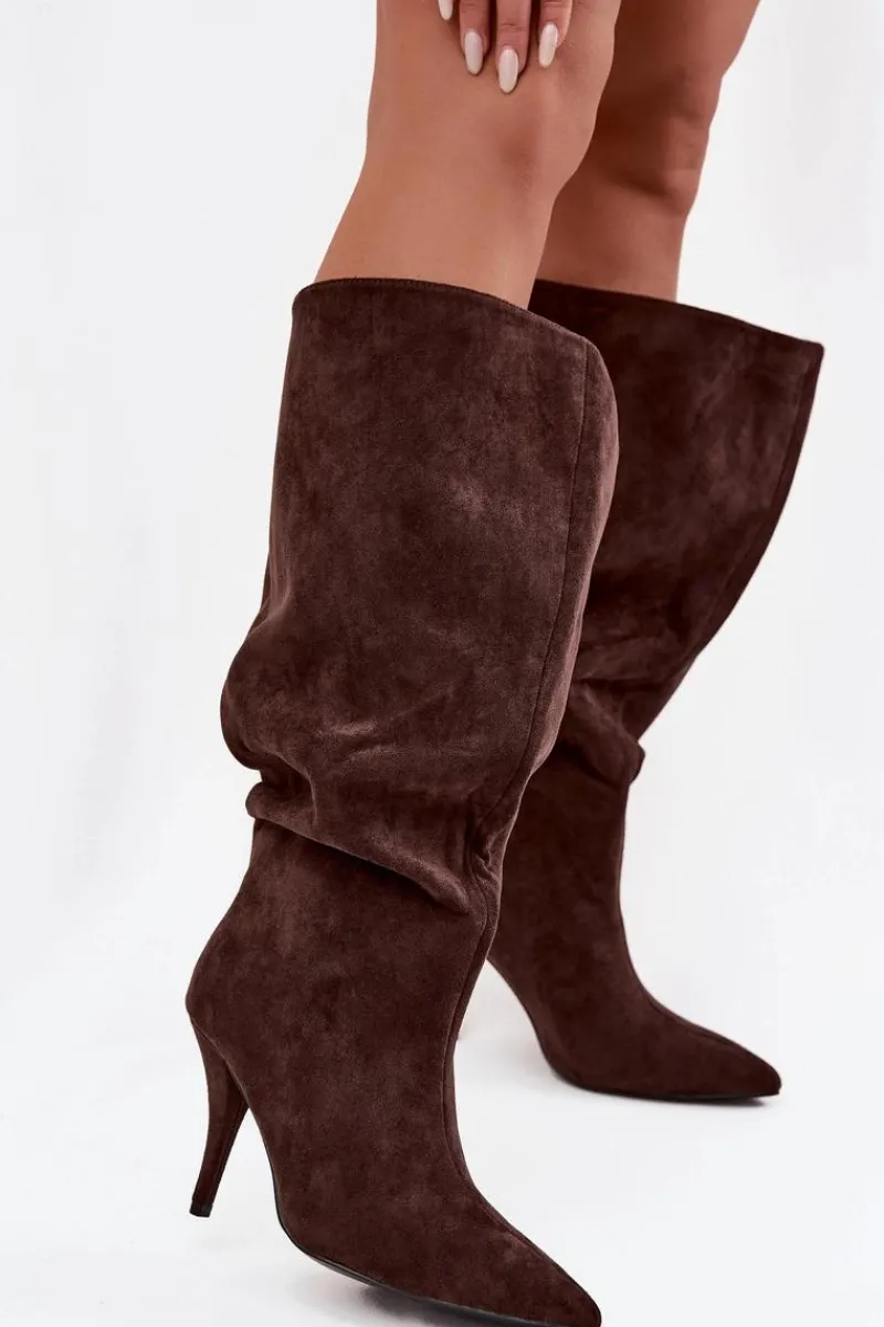 Stylowe kozaki damskie wykonane z miękkiego eko zamszu to doskonały wybór na chłodniejsze dni. Luźna cholewka nadaje im swobodnego, modnego charakteru, a przeszycie biegnące wzdłuż przodu subtelnie wysmukla nogę i dodaje całości elegancji. Model posiada smukły obcas typu szpilka, który pięknie podkreśla sylwetkę, oraz szpiczasty nosek. Idealnie komponują się zarówno z sukienkami i spódnicami, jak i obcisłymi spodniami typu skinny, tworząc kobiece i stylowe zestawy. Wybierz te kozaki, jeśli cenisz połączenie stylu i elegancji w jednym! Przy wyborze rozmiaru prosimy sugerować się tabelą rozmiarów.