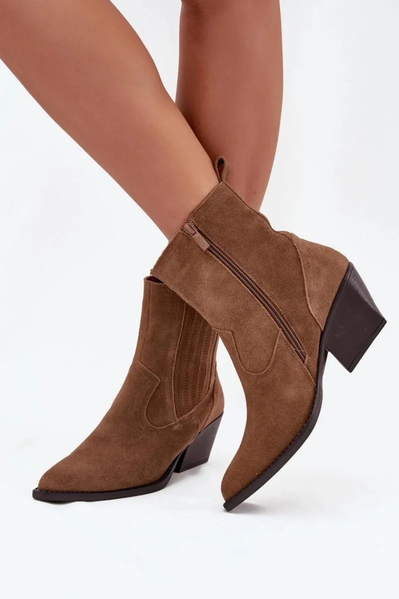 Botki kowbojki damskie z naturalnego zamszu to wyjątkowa propozycja, która łączy styl i komfort. Szpiczaste noski nadają im charakterystycznego wyglądu, a ocieplenie kocem obuwniczym zapewnia ciepło w chłodniejsze dni. Zamek błyskawiczny umożliwia wygodne zakładanie, a obcas słupek zapewnia stabilność i wygodę podczas chodzenia. Idealne do codziennych stylizacji, te botki dodadzą wyjątkowego akcentu każdemu lookowi. Przy wyborze rozmiaru prosimy sugerować się tabelą rozmiarów.