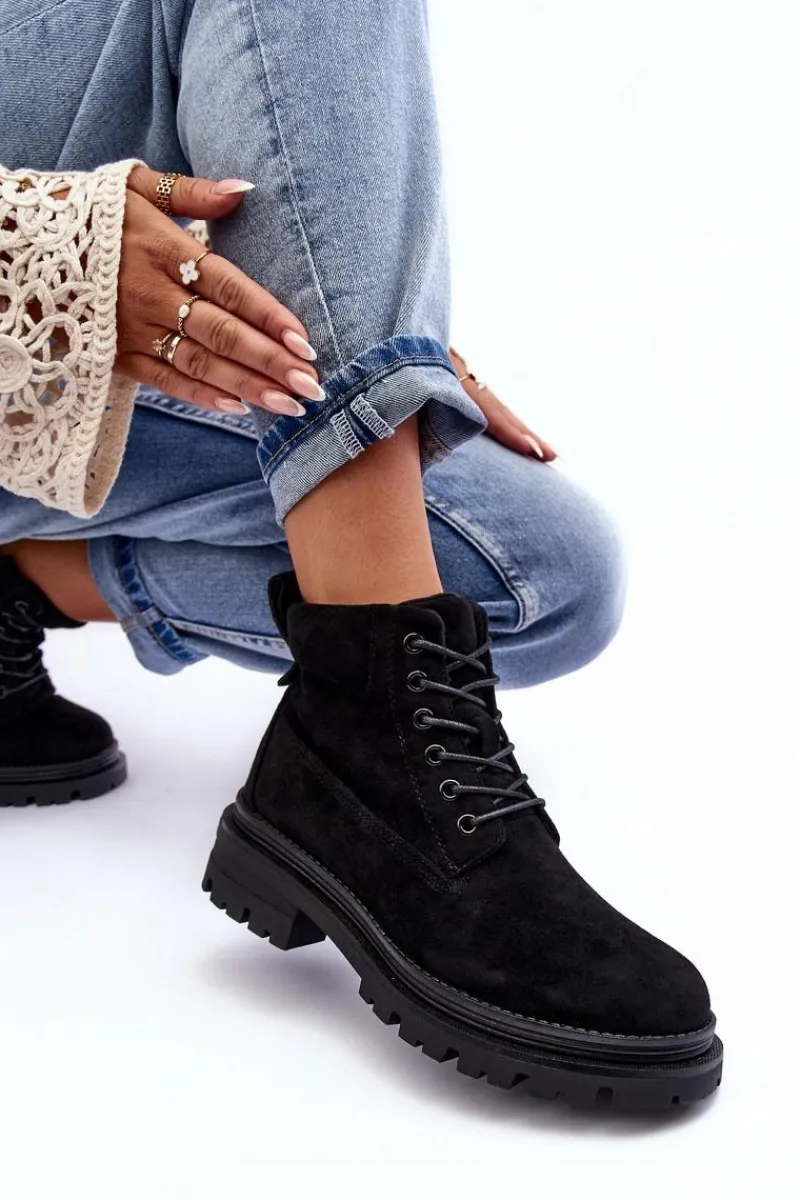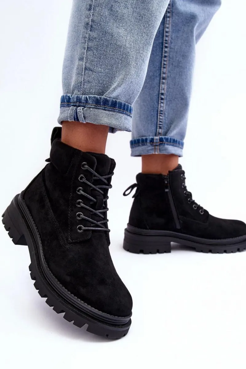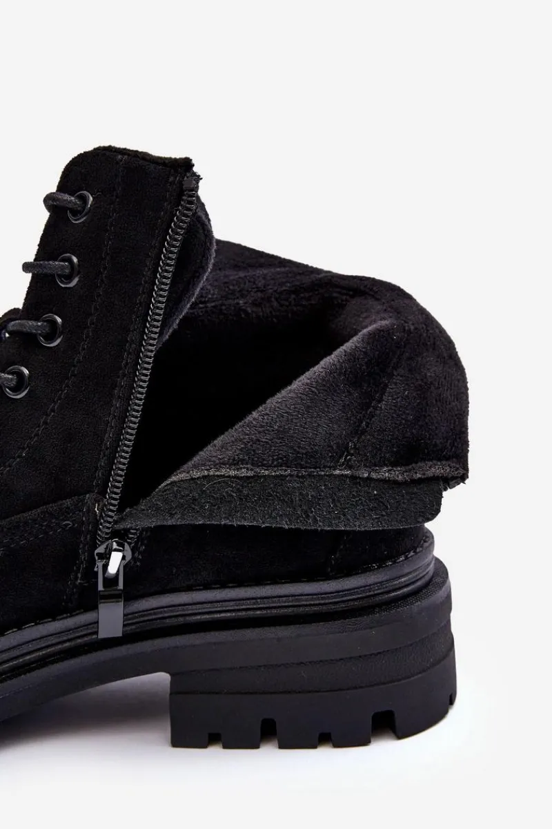 Trapery damskie wykonane z eko zamszu. Osadzone na płaskim, stabilnym obcasie i platformie. Wewnątrz znajduje się ciepłe i miłe w dotyku futerko. Zapinane na suwak oraz dodatkowo posiadają sznurowanie. Zapiętek usztywniony. Buty idealnie sprawdzą się w zimowe dni! Przy wyborze rozmiaru prosimy sugerować się tabelą rozmiarów.