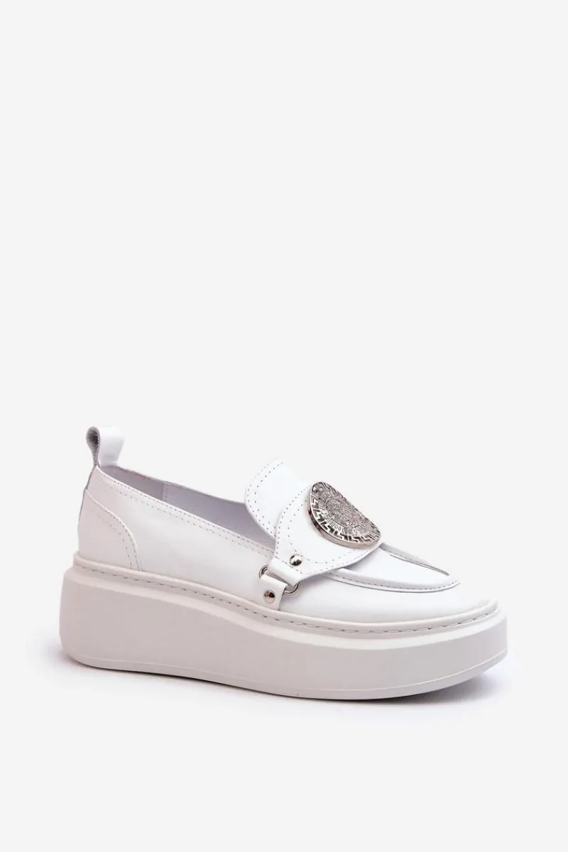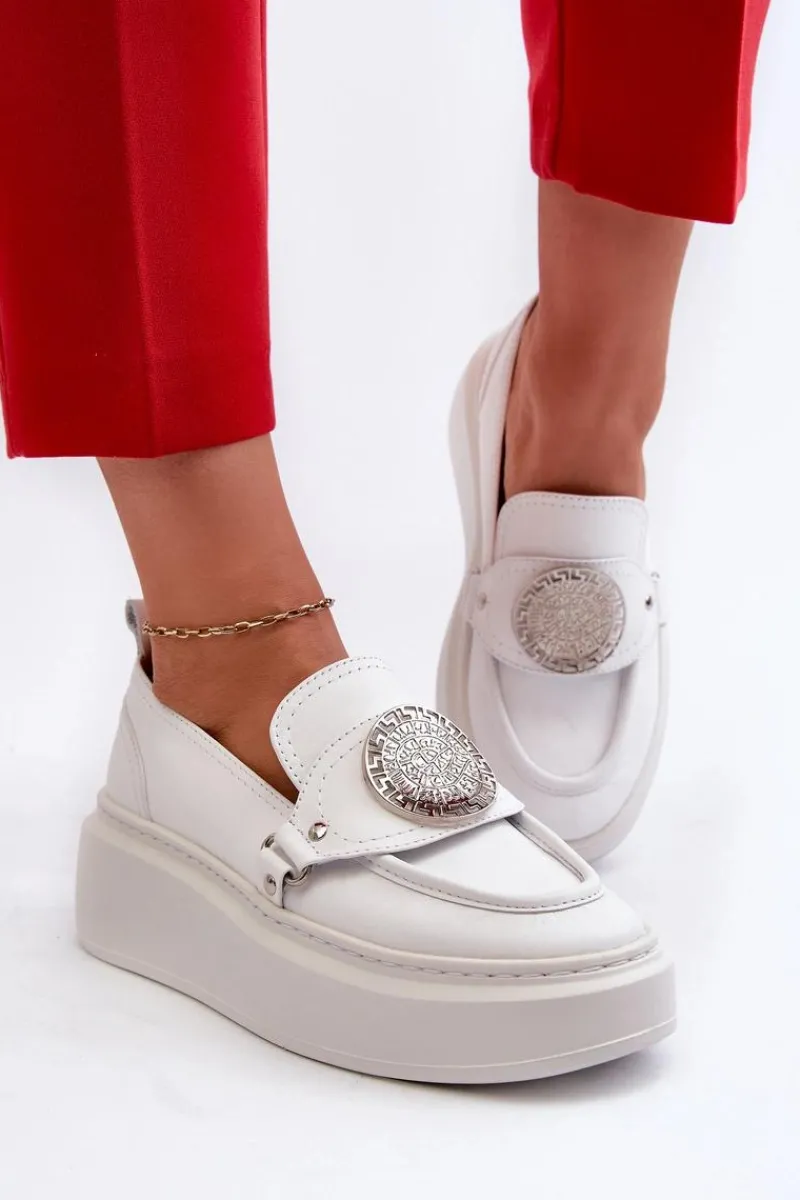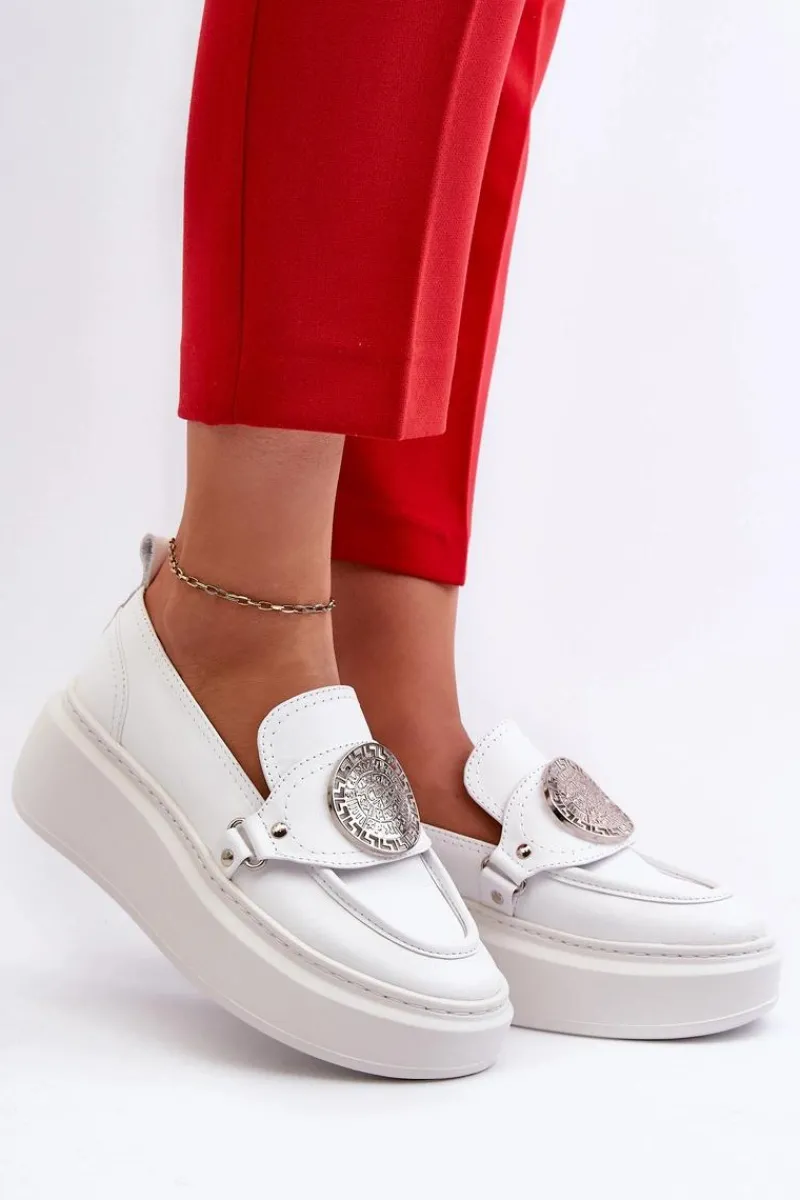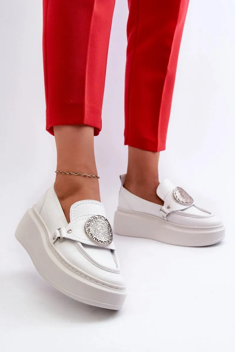 Damskie mokasyny zostały wykonane z naturalnej skóry z dbałością o detale. Osadzone na platformie z koturnem, zapewniają stabilność i pewność kroku. Przód ozdobiony paskiem i srebrną ozdobą, która dodaje elegancji. Doskonałe dla kobiet ceniących styl i wygodę! Przy wyborze rozmiaru prosimy sugerować się tabelą rozmiarów.