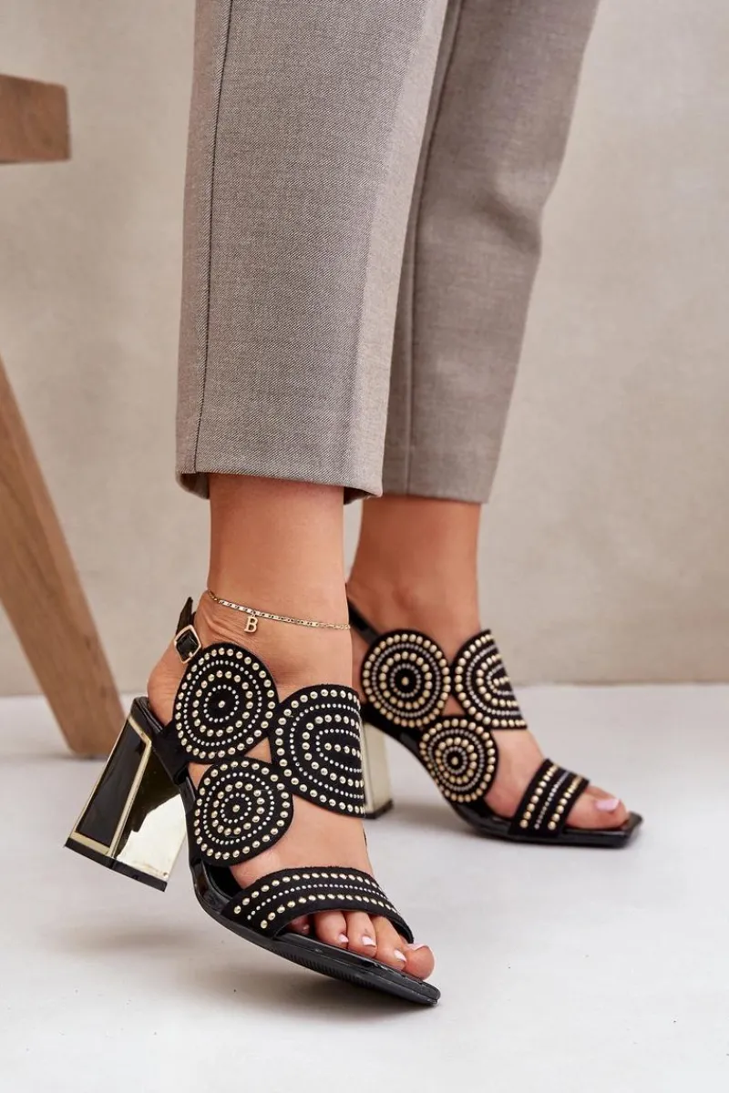 Sandały damskie wykonane z eko zamszu. Osadzone na obcasie słupku z lustrzanym złotym elementem. Zdobienie nadaje im wyjątkowego blasku i elegancji. Model zapinany na regulowany pasek ze sprzączką zapewnia idealne dopasowanie i komfort noszenia. Liczne zdobienie nadaje wyjątkowego uroku. Te sandały będą idealnym wyborem na wieczorne wyjścia oraz na specjalne okazje, łącząc wygodę z eleganckim wyglądem. Przy wyborze rozmiaru prosimy sugerować się tabelą rozmiarów.